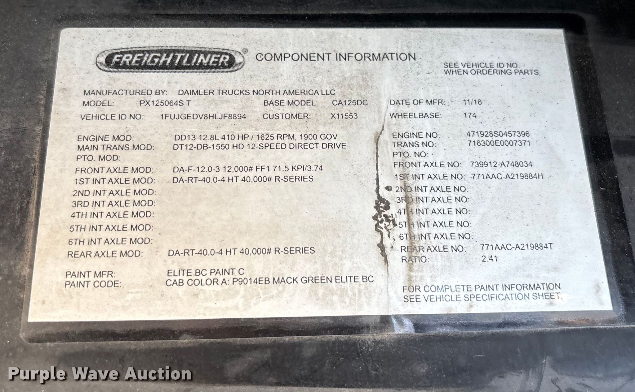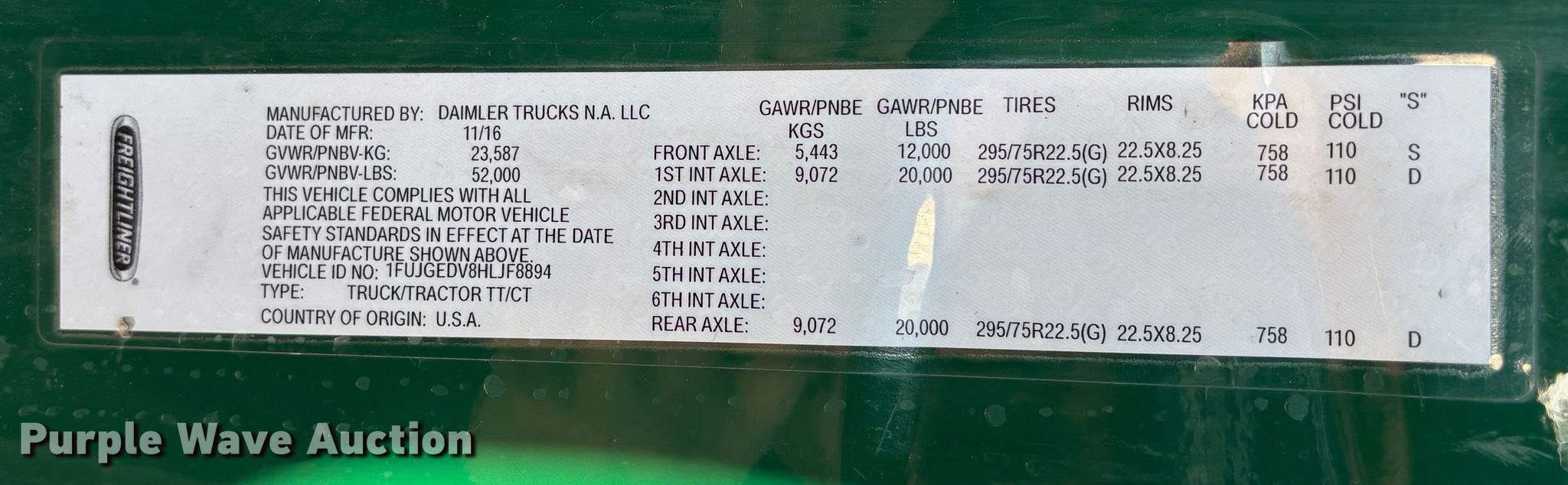 2017 Freightliner Cascadia 125 semi truck. Miles: 673,531 on odometer, Hours: 17,176 on meter, VIN: 1FUJGEDV8HLJF8894, Unit #: 1103. Engine Detroit Diesel DD13, Serial: 471928S0457396, Displacement: 12.8L, Cylinders: 6, Fuel type: Diesel, Engine brake. Transmission Detroit Diesel DT12-DB-1550, Automated manual. Chassis Axles: Tandem, Gear ratio: 2.41, Differential lock: Inter-axle, Suspension: Air Dump valves, Brakes: Air, GVWR: 52,000 lbs FAWR: 12,000 lbs, IAWR: 20,000 lbs, RAWR: 20,000 lbs, Wheelbase: 174". Interior AC, Heat, Heated mirrors, Power windows, Cruise control, Air ride cab, Brake controller. Features Deck plate: Aluminum, Fifth wheel type: Fixed, Fuel tank: Dual. Tires Size: 295/75R22.5. Notes Dash warning indicator: Check engine, Jump start required during on-site data collection. Indiana title. Title distribution may be delayed up to 30 days from verification of funds. Standard Forwarding, LLC Strategic Fleet Realignment Sale - Open inspection April 20th 2026 from 9:00 a.m. to 3:00 p.m.. 2925 Morton Drive. East Moline, IL 61244
