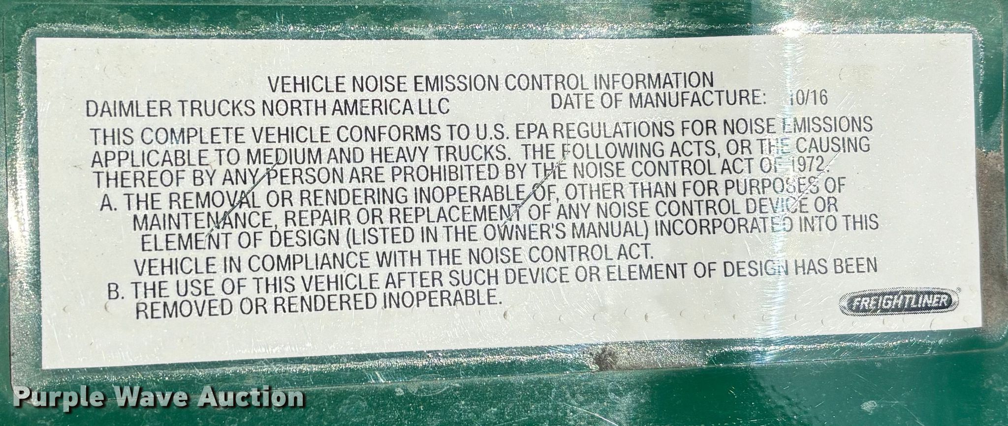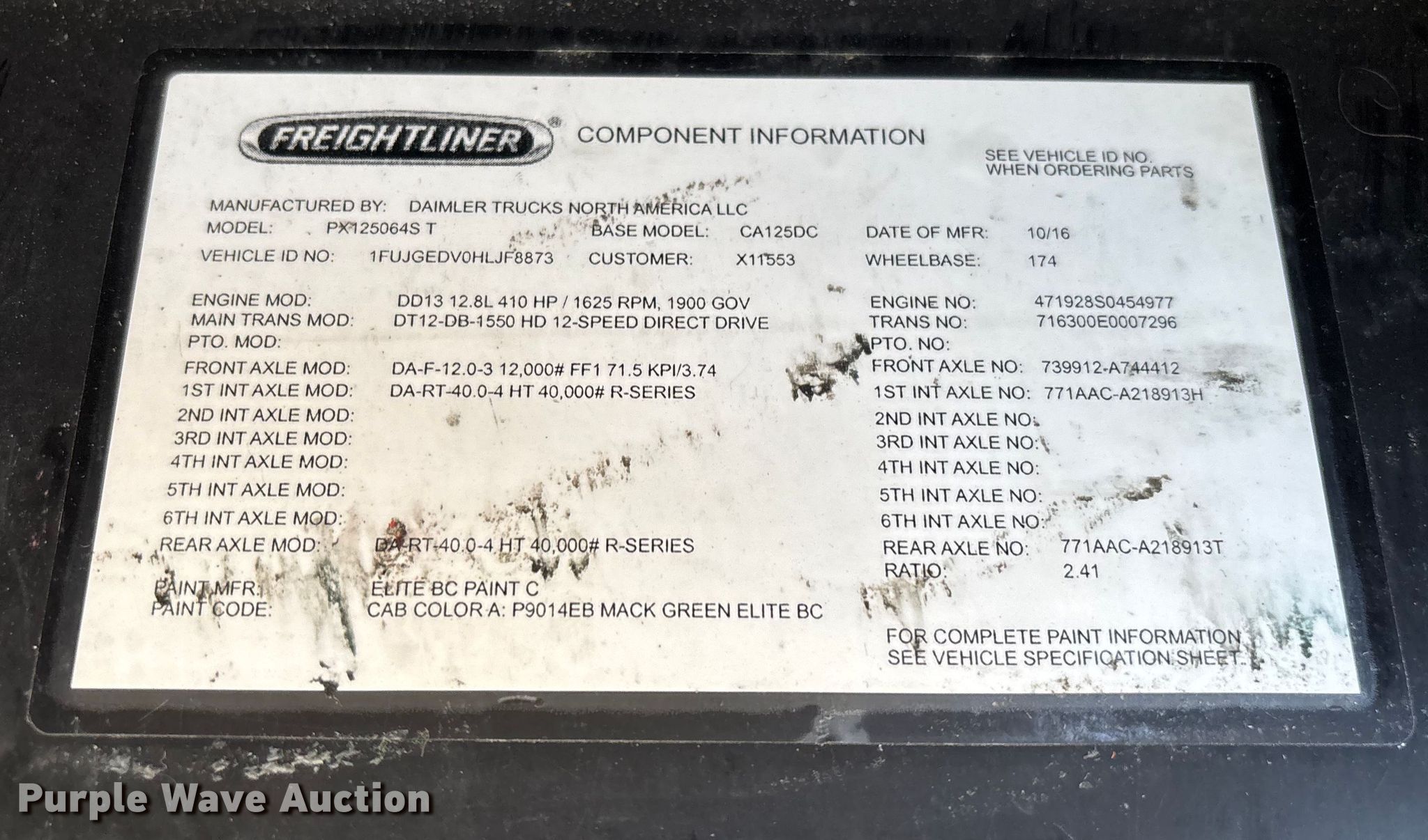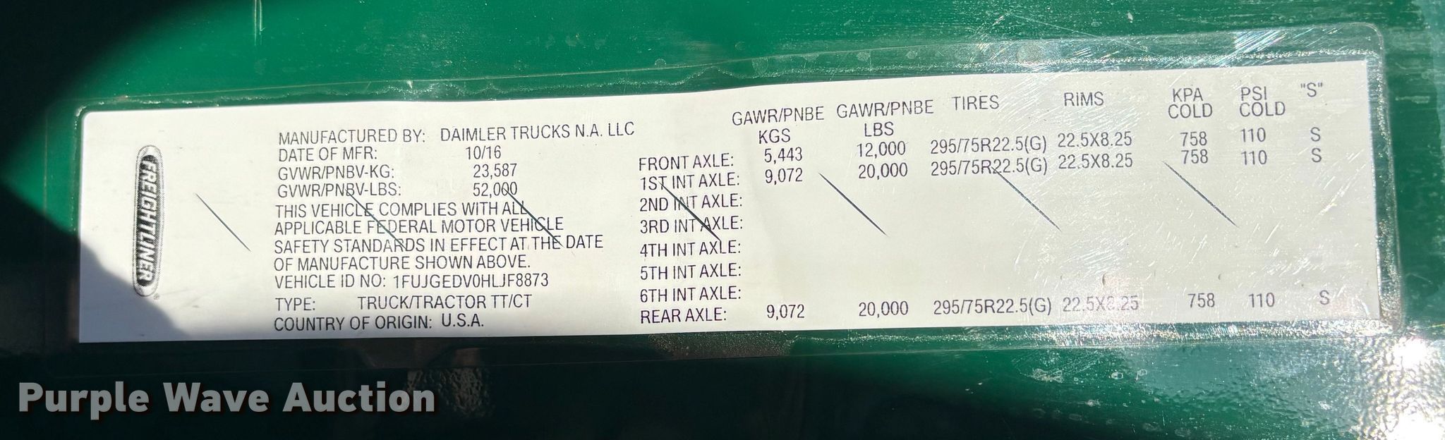 2017 Freightliner Cascadia 125 semi truck. Miles: Unknown, VIN: 1FUJGEDV0HLJF8873, Unit #: 1082. Engine Detroit Diesel DD13, Serial: 471928S0454977, Displacement: 12.8L, Cylinders: 6, Fuel type: Diesel, Engine brake. Transmission Detroit Diesel DT12-DB-1550, Automated manual. Chassis Axles: Tandem, Gear ratio: 2.41, Differential lock: Inter-axle, Suspension: Air Dump valves, Brakes: Air, GVWR: 52,000 lbs FAWR: 12,000 lbs, IAWR: 20,000 lbs, RAWR: 20,000 lbs, Wheelbase: 174". Interior AC, Heat, Heated mirrors, Power windows, Cruise control, Air ride cab, Brake controller. Features Deck plate: Aluminum, Fifth wheel type: Fixed, Fuel tank: Dual. Tires Size: 295/75R22.5. Notes Dash warning indicator: Check engine, Non-operational odometer. Indiana title. Mileage has not been verified. Odometer discrepancy will be marked on the title. Title distribution may be delayed up to 30 days from verification of funds. Standard Forwarding, LLC Strategic Fleet Realignment Sale - Open inspection April 20 from 9:00 a.m. to 3:00 p.m.. 2925 Morton Drive. East Moline, IL 61244