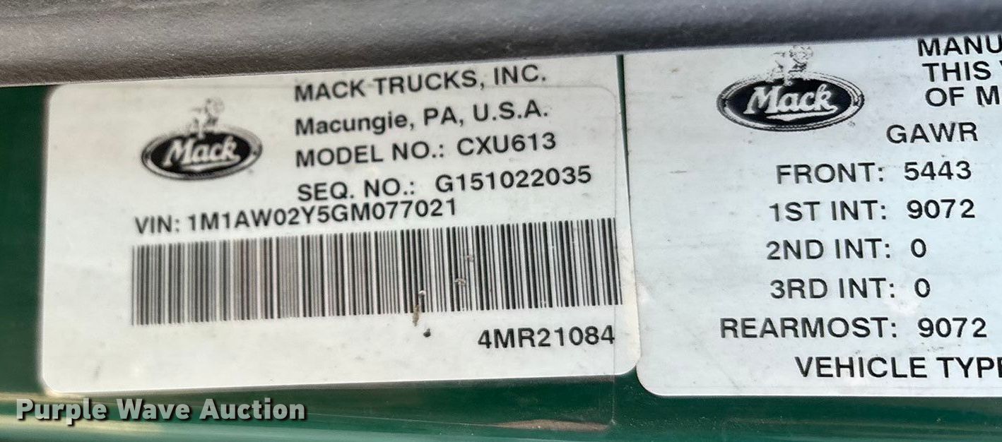 2016 Mack CXU613 semi truck. Miles: 386,960 on odometer, VIN: 1M1AW02Y5GM077021, Unit #: 747. Engine Mack MP7, Displacement: 10.8L, Cylinders: 6, Fuel type: Diesel, Engine brake. Transmission Mack mDrive, Automated manual. Chassis Axles: Tandem, Differential lock: Inter-axle, Suspension: Air Dump valves, Brakes: Air, GVWR: 52,000 lbs FAWR: 12,000 lbs, IAWR: 20,000 lbs, RAWR: 20,000 lbs. Interior AC, Heat, Heated mirrors, Cruise control, Air ride cab. Features Deck plate: Aluminum, Fifth wheel type: Fixed, Fuel tank: Dual. Tires Size: 295/75R22.5. Notes Dash warning indicator: Check engine, Windshield chipped or cracked. Indiana title. Title distribution may be delayed up to 30 days from verification of funds. Standard Forwarding, LLC Strategic Fleet Realignment Sale - Open inspection April 20th 2026 from 9:00 a.m. to 3:00 p.m.. 2925 Morton Drive. East Moline, IL 61244