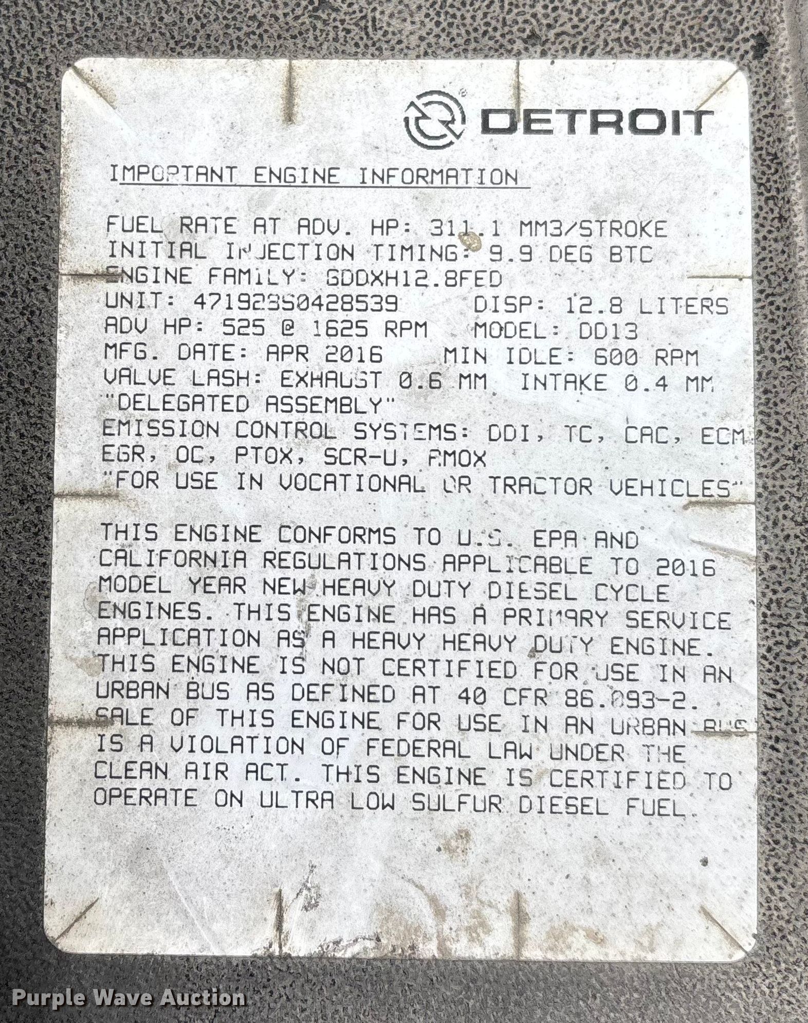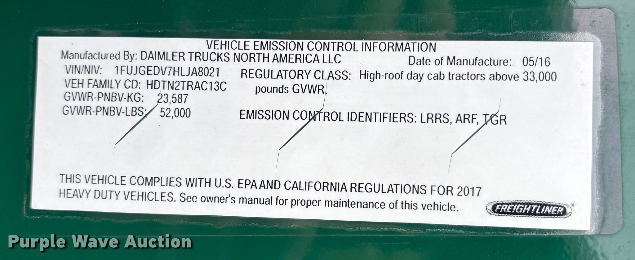 2017 Freightliner Cascadia 125 semi truck. Miles: 588,687 on odometer, Hours: 7,469 on meter, VIN: 1FUJGEDV7HLJA8021, Unit #: 1038. Engine Detroit Diesel DD13, Displacement: 12.8L, Cylinders: 6, Fuel type: Diesel, HP: 410, Engine brake. Transmission Automated manual. Chassis Axles: Tandem, Differential lock: Inter-axle, Suspension: Air Dump valves, Brakes: Air, GVWR: 52,000 lbs FAWR: 12,000 lbs, IAWR: 20,000 lbs, RAWR: 20,000 lbs, Wheelbase: 174". Interior AC, Heat, Heated mirrors, Power windows, Cruise control, Air ride cab, Brake controller. Features Deck plate: Aluminum, Fifth wheel type: Fixed, Fuel tank: Dual. Tires Size: 295/75R22.5. Notes Jump start required during on-site data collection. Indiana title. Title distribution may be delayed up to 30 days from verification of funds. Standard Forwarding, LLC Strategic Fleet Realignment Sale - Open inspection April 20th 2026 from 9:00 a.m. to 3:00 p.m.. 2925 Morton Drive. East Moline, IL 61244