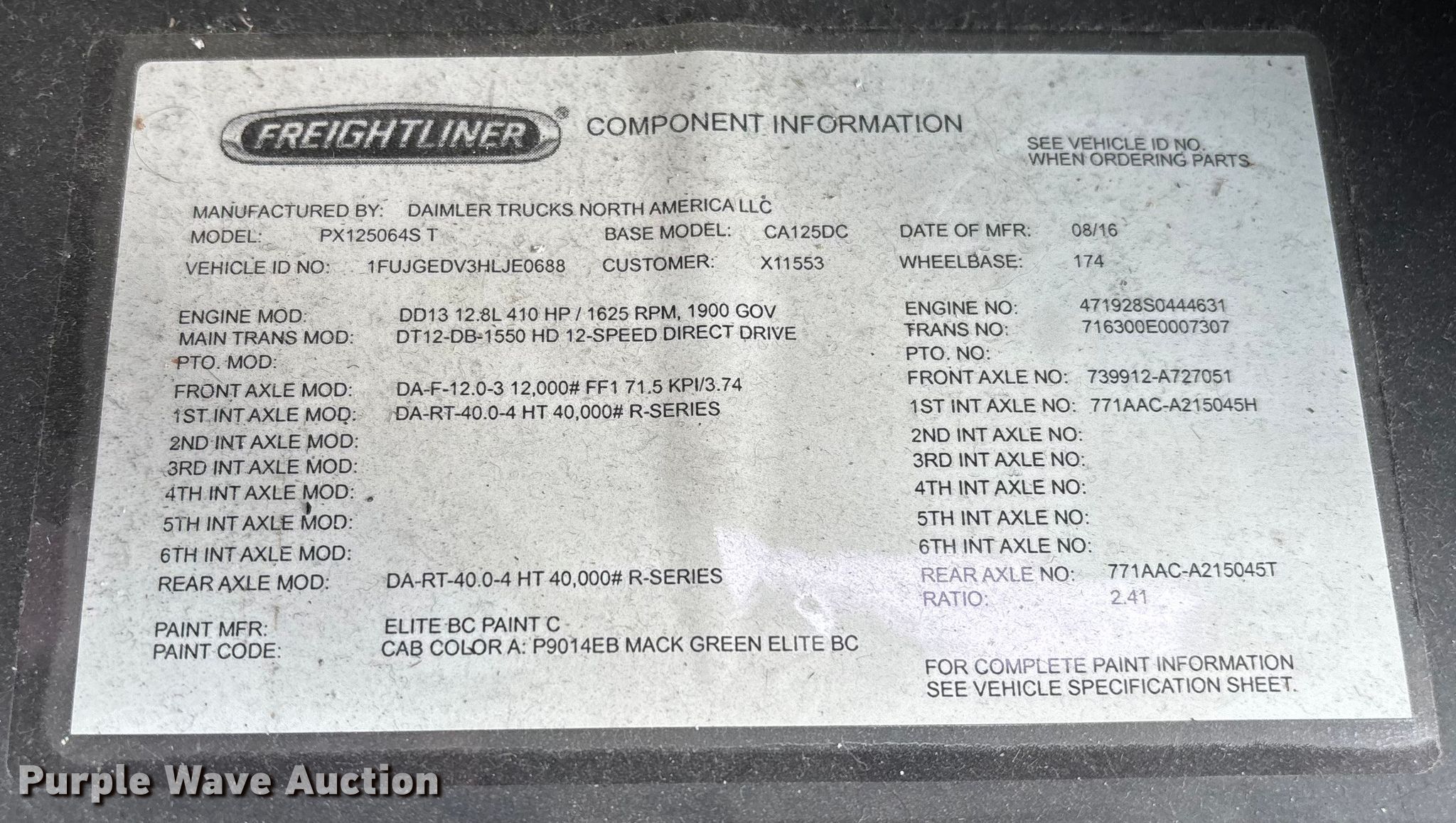 2017 Freightliner Cascadia 125 semi truck. Miles: 608,341 on odometer, Hours: 17,337 on meter, VIN: 1FUJGEDV3HLJE0688. Engine Detroit Diesel DD13, Displacement: 12.8L, Cylinders: 6, Fuel type: Diesel, HP: 410, Engine brake. Transmission Automated manual. Chassis Axles: Tandem, Gear ratio: 2.41, Differential lock: Inter-axle, Suspension: Air Dump valves, Brakes: Air, GVWR: 52,000 lbs FAWR: 12,000 lbs, IAWR: 20,000 lbs, RAWR: 20,000 lbs, Wheelbase: 174". Interior AC, Heat, Heated mirrors, Power windows, Cruise control, Air ride cab, Brake controller. Features Deck plate: Aluminum, Fifth wheel type: Fixed, Fuel tank: Dual. Tires Size: 295/75R22.5. Notes Dash warning indicator: Check engine, Jump start required during on-site data collection. Indiana title. Title distribution may be delayed up to 30 days from verification of funds. Standard Forwarding, LLC Strategic Fleet Realignment Sale - Open inspection April 20th 2026 from 9:00 a.m. to 3:00 p.m.. 2925 Morton Drive. East Moline, IL 61244