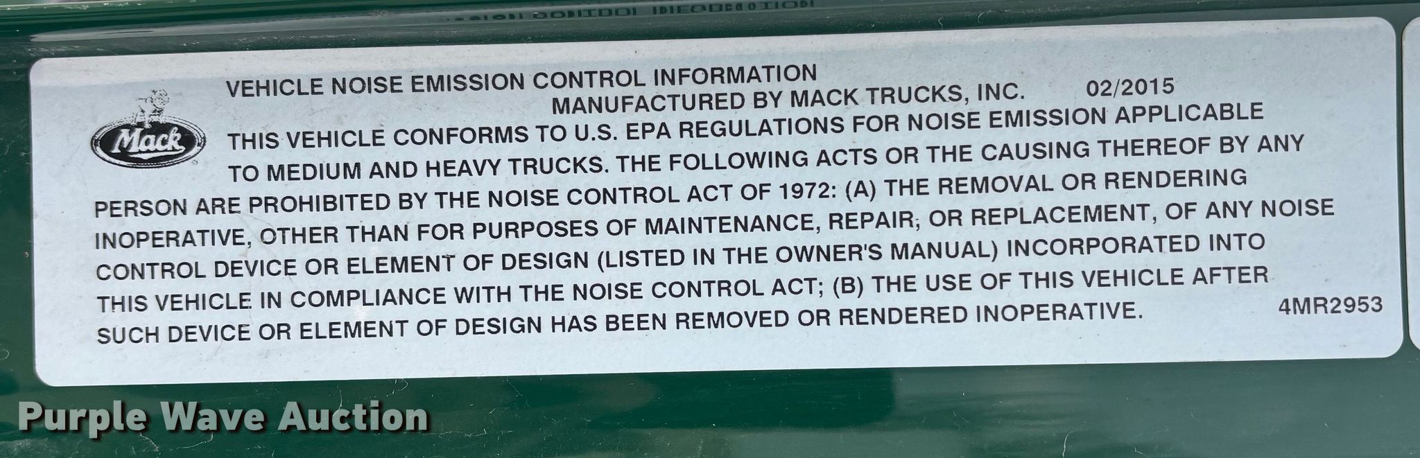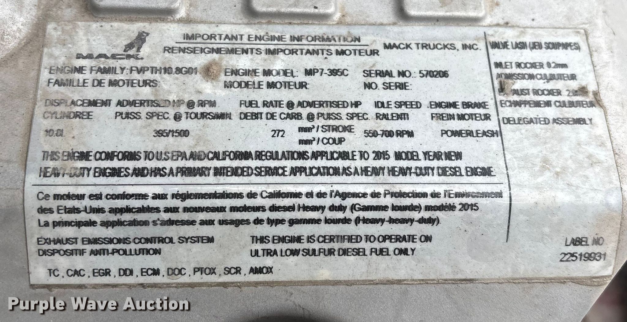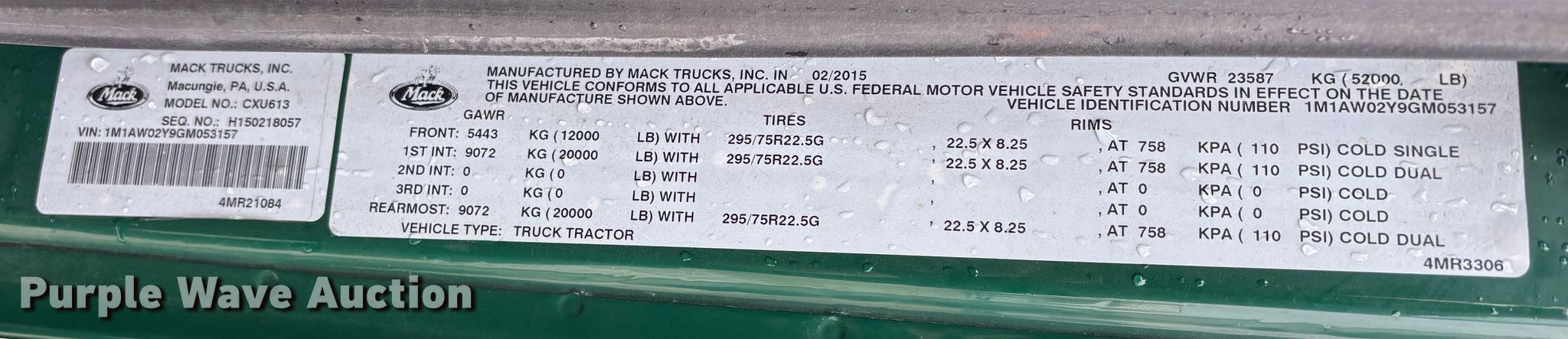 2016 Mack CXU613 semi truck. Miles: 571,062 on odometer, Hours: 8,996 on meter, VIN: 1M1AW02Y9GM053157, Unit #: 724. Engine Mack MP7, Displacement: 10.8L, Cylinders: 6, Fuel type: Diesel, HP: 395, Engine brake. Transmission Mack MDrive, Automated manual. Chassis Axles: Tandem, Differential lock: Inter-axle, Suspension: Air Dump valves, Brakes: Air, GVWR: 52,000 lbs FAWR: 12,000 lbs, IAWR: 20,000 lbs, RAWR: 20,000 lbs. Interior AC, Heat, Heated mirrors, Cruise control, Air ride cab, Brake controller. Features Deck plate: Aluminum, Fifth wheel type: Air operated, Fuel tank: Dual. Tires Size: 295/75R22.5. Notes Dash warning indicator: Check engine, Jump start required during on-site data collection. Indiana title. Title distribution may be delayed up to 30 days from verification of funds. Standard Forwarding, LLC Strategic Fleet Realignment Sale - Open inspection April 20 from 9:00 a.m. to 3:00 p.m.. 2925 Morton Drive. East Moline, IL 61244