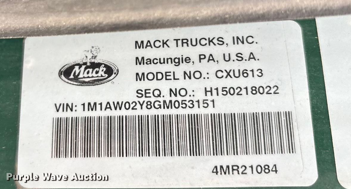 2016 Mack CXU613 semi truck. Miles: 566,839 on odometer, VIN: 1M1AW02Y8GM053151, Unit #: 718. Engine Mack MP7, Displacement: 10.8L, Cylinders: 6, Fuel type: Diesel, HP: 335, Engine brake. Transmission Mack MDrive, Automated manual. Chassis Axles: Tandem, Differential lock: Inter-axle, Suspension: Air Dump valves, Brakes: Air, GVWR: 52,000 lbs FAWR: 12,000 lbs, IAWR: 20,000 lbs, RAWR: 20,000 lbs. Interior AC, Heat, Heated mirrors, Cruise control, Air ride cab. Features Deck plate: Aluminum, Fifth wheel type: Fixed, Fuel tank: Dual. Tires Size: 295/75R22.5. Notes Dash warning indicator: Fault code, Jump start required during on-site data collection, Dash parts removed but included, Drivers mirror broken, Possible transmission issues , Unit in limp mode , Unit must be towed or hauled. Indiana title. Title distribution may be delayed up to 30 days from verification of funds. Standard Forwarding, LLC Strategic Fleet Realignment Sale - Open inspection April 20 from 9:00 a.m. to 3:00 p.m.. 2925 Morton Drive. East Moline, IL 61244