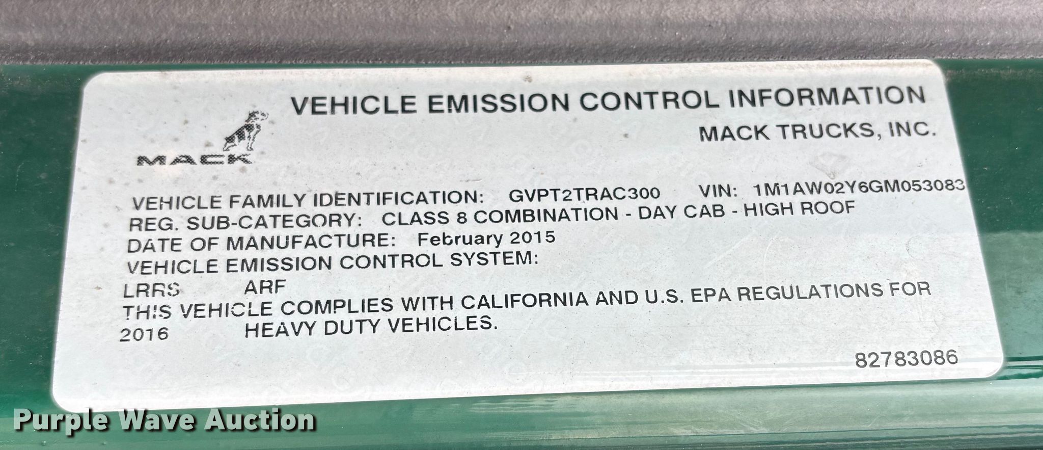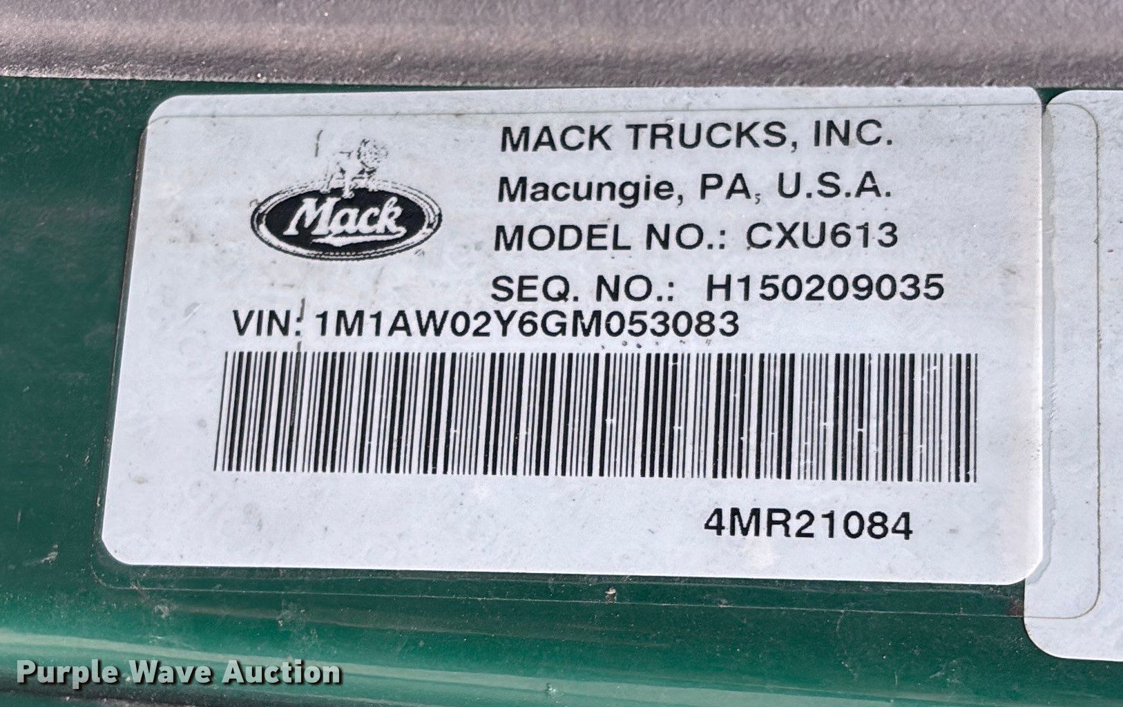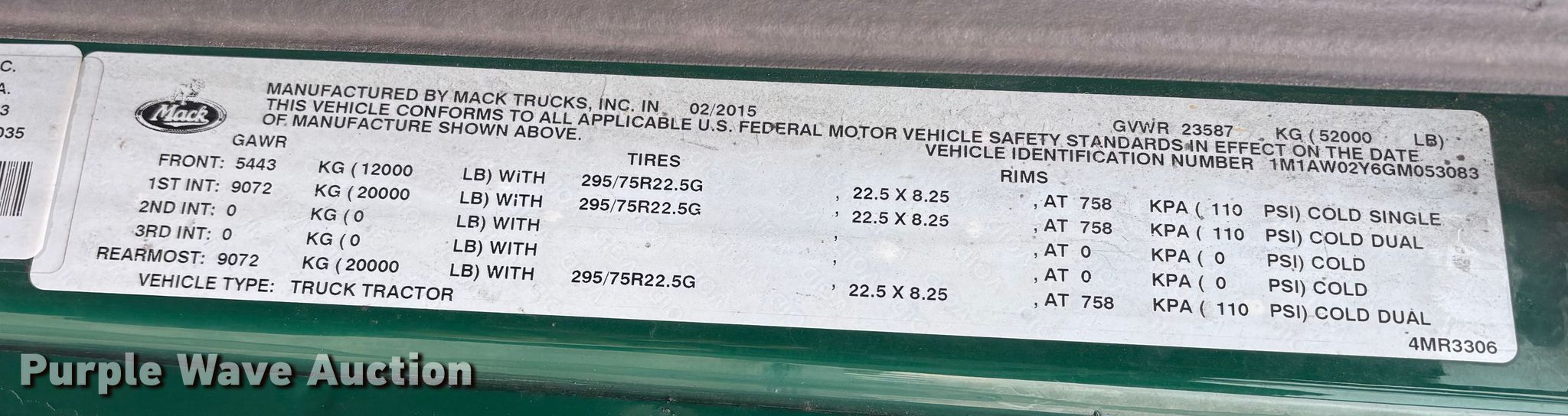 2016 Mack CXU613 semi truck. Miles: 315,743 on odometer, Hours: 18,082 on meter, VIN: 1M1AW02Y6GM053083, Unit #: 650. Engine Mack MP7, Displacement: 10.8L, Cylinders: 6, Fuel type: Diesel, HP: 395, Engine brake. Transmission Mack MDrive, Automated manual. Chassis Axles: Tandem, Differential lock: Inter-axle, Suspension: Air Dump valves, Brakes: Air, GVWR: 52,000 lbs FAWR: 12,000 lbs, IAWR: 20,000 lbs, RAWR: 20,000 lbs, Wheelbase: 162". Interior AC, Heat, Heated mirrors, Cruise control, Air ride cab, Brake controller. Features Deck plate: Aluminum, Fifth wheel type: Fixed, Fuel tank: Dual. Tires Size: 295/75R22.5. Notes Dash warning indicator: Check engine, Jump start required during on-site data collection. Indiana title. Title distribution may be delayed up to 30 days from verification of funds. Standard Forwarding, LLC Strategic Fleet Realignment Sale - Open inspection April 20 from 9:00 a.m. to 3:00 p.m.. 2925 Morton Drive. East Moline, IL 61244