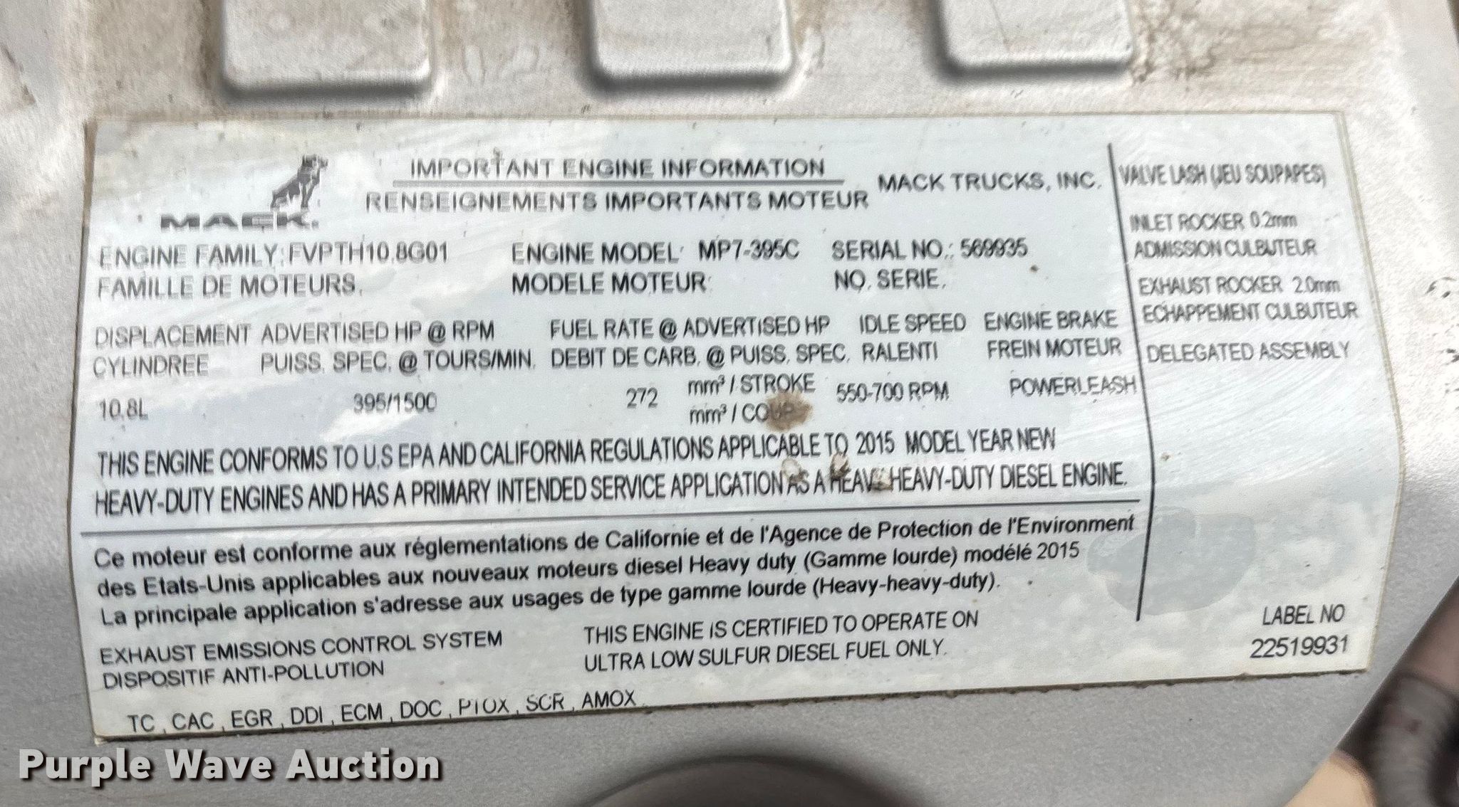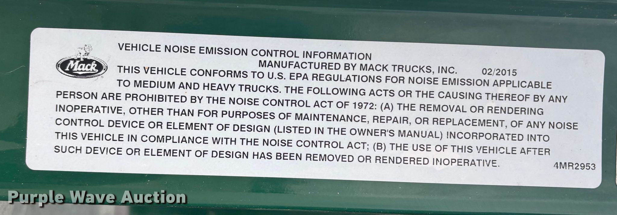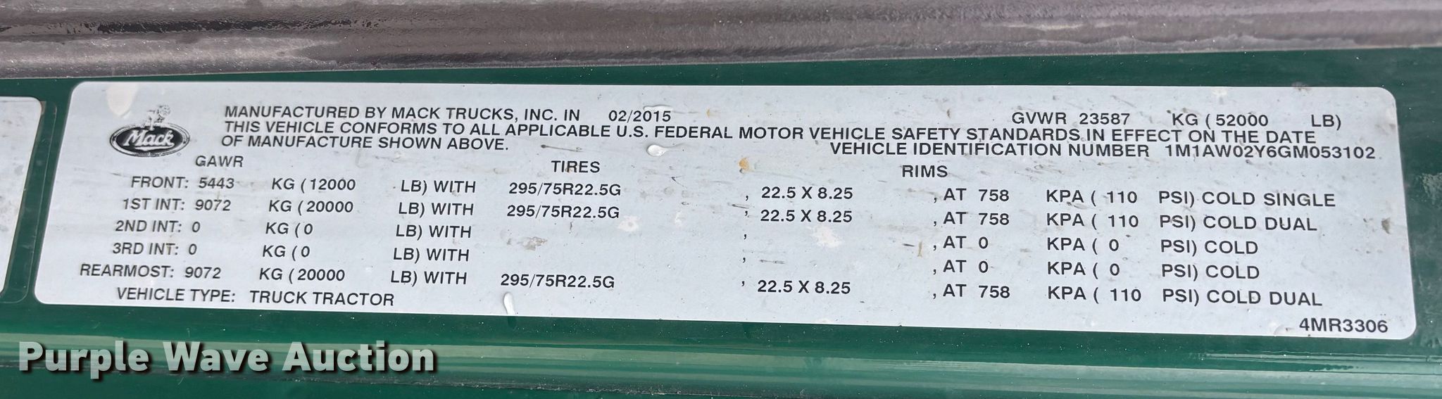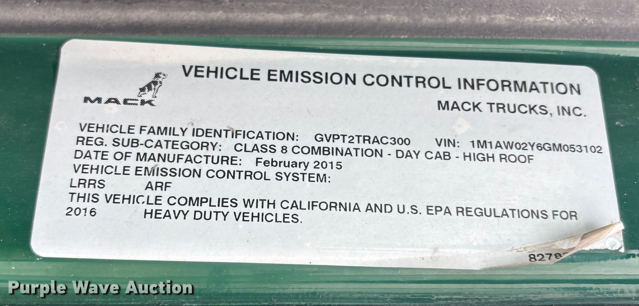 2016 Mack CXU613 semi truck. Miles: 641,950 on odometer, Hours: 24,500 on meter, VIN: 1M1AW02Y6GM053102, Unit #: 669. Engine Mack MP7, Displacement: 10.8L OHV, Cylinders: 6, Fuel type: Diesel, HP: 395, Engine brake. Transmission Mack MDrive, Automated manual. Chassis Axles: Tandem, Differential lock: Inter-axle, Suspension: Air Dump valves, Brakes: Air, GVWR: 52,000 lbs FAWR: 12,000 lbs, IAWR: 20,000 lbs, RAWR: 20,000 lbs, Wheelbase: 162". Interior AC, Heat, Heated mirrors, Cruise control, Air ride cab, Brake controller. Features Deck plate: Aluminum, Fifth wheel type: Fixed, Fuel tank: Dual. Tires Size: 295/75R22.5. Notes Dash warning indicator: Check engine, DEF system fault, Jump start required during on-site data collection. Indiana title. Title distribution may be delayed up to 30 days from verification of funds. Standard Forwarding, LLC Strategic Fleet Realignment Sale - Open inspection April 20 from 9:00 a.m. to 3:00 p.m.. 2925 Morton Drive. East Moline, IL 61244