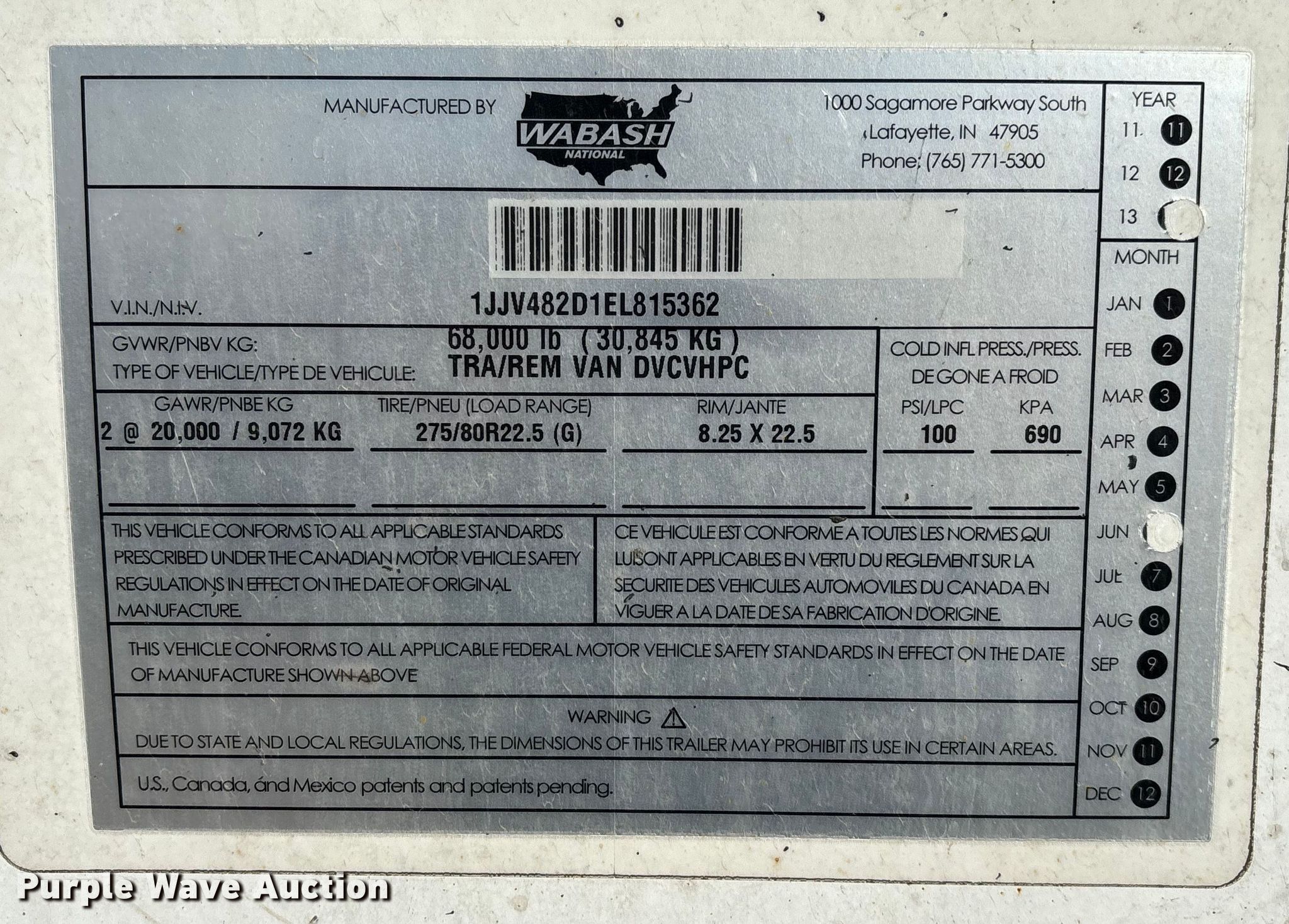 Purple Wave is selling a used Dry Van Trailer in Illinois. This item is a 2014 Wabash Duraplate dry van trailer with the following: VIN: 1JJV482D1EL815362, Unit #: 54110R