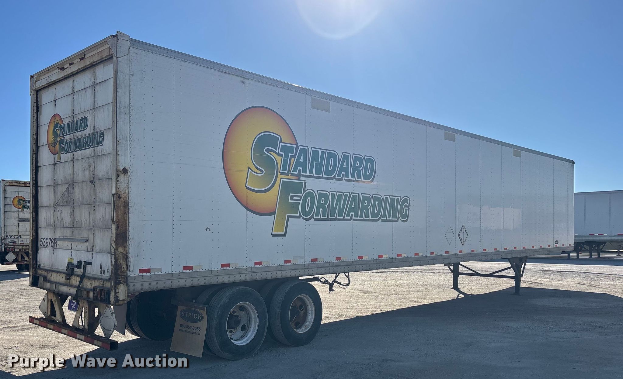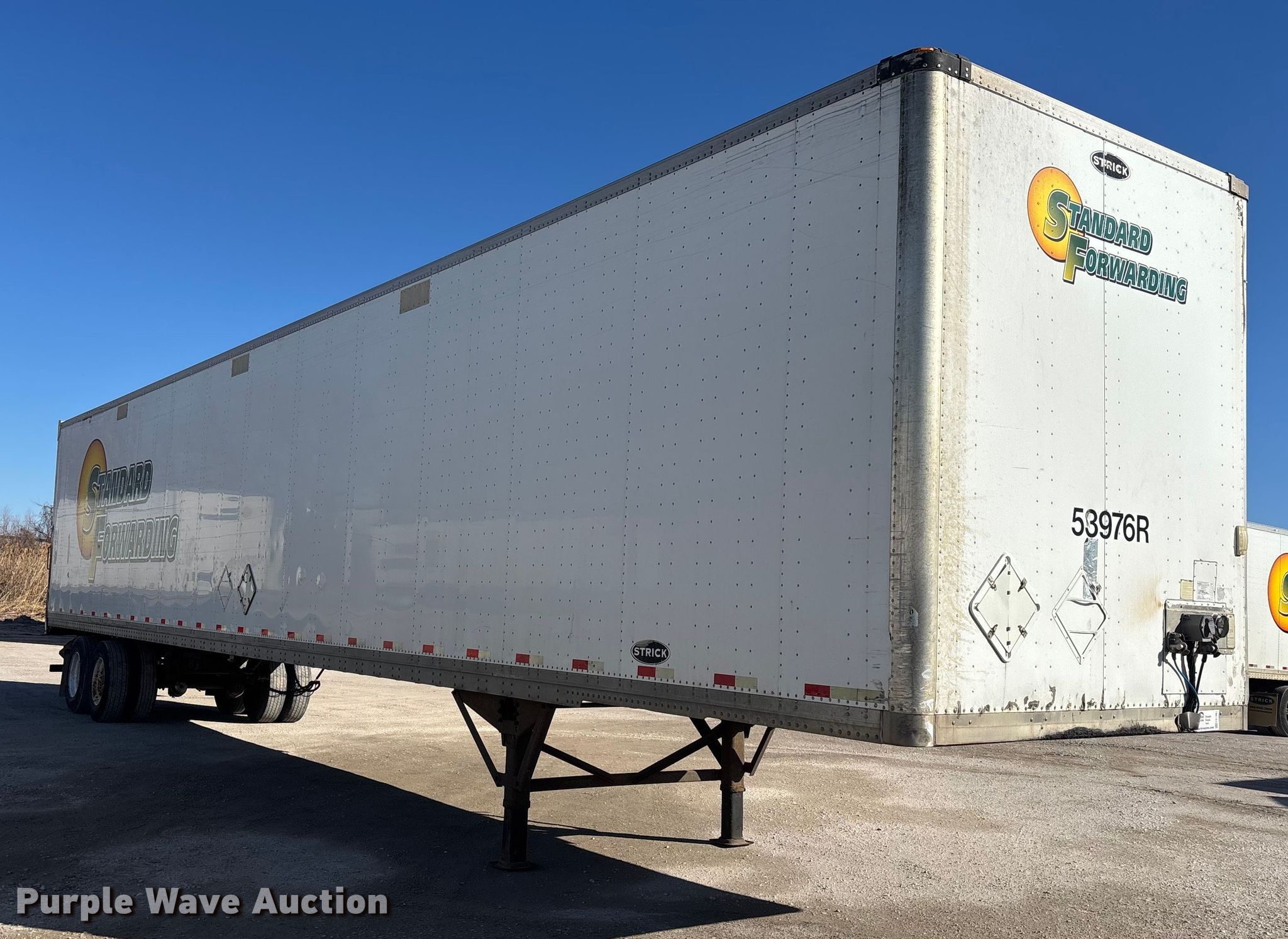2013 Strick dry van trailer. VIN: 1S12E9533DE526238, Unit #: 53976R. Dimensions Overall Length: 53' 4", Width: 102", Body Length: 53', Width: 102", Rear door / ramp Width: 93". Features Deck type: Wood. Chassis Landing gear: Dual, Suspension: Spring, Brakes: Air, Axles: Tandem, GVWR: 65,000 lbs, GAWR: 17,000 lbs. Tires Steel wheels, Size: 295/75R22.5. Indiana title. Title distribution may be delayed up to 30 days from verification of funds. Standard Forwarding, LLC Strategic Fleet Realignment Sale - Open inspection April 20 from 9:00 a.m. to 3:00 p.m.. 2925 Morton Drive. East Moline, IL 61244