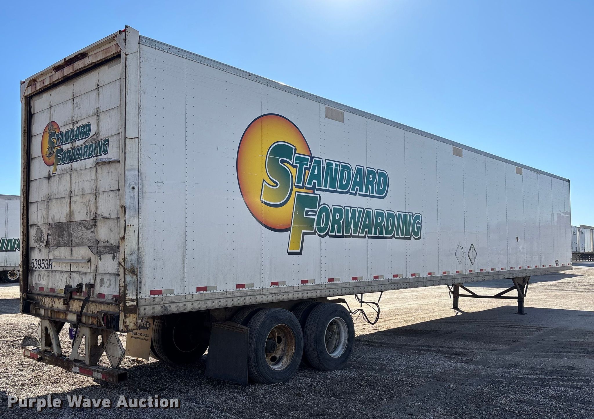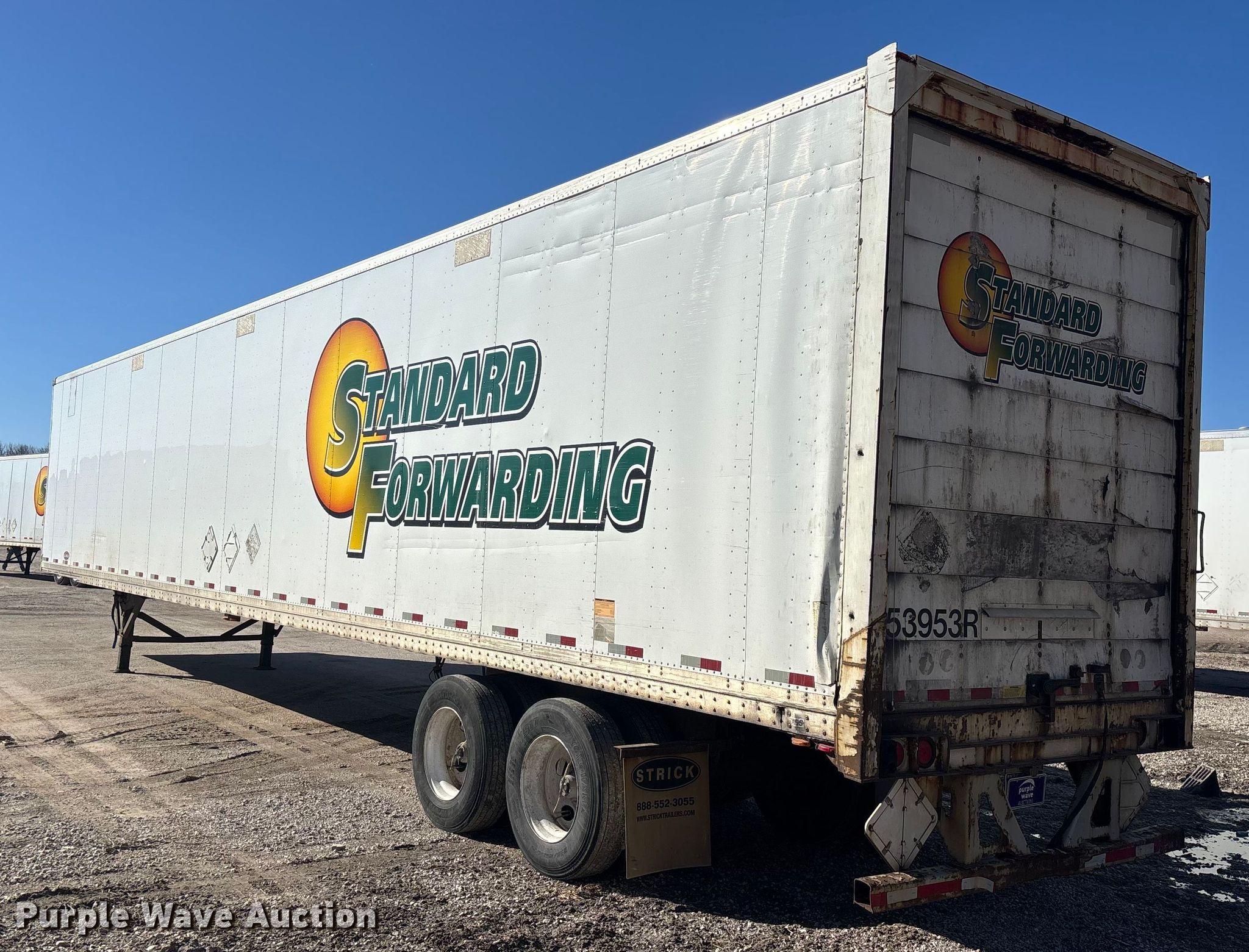 2013 Strick dry van trailer. VIN: 1S12E9532DE526215, Unit #: 53953. Dimensions Overall Length: 53' 3", Width: 102", Body Length: 53', Width: 102", Rear door / ramp Width: 93". Features Deck type: Wood. Chassis Landing gear: Dual, Suspension: Spring, Brakes: Air, Axles: Tandem, GVWR: 65,000 lbs, GAWR: 17,000 lbs. Tires Steel wheels, Size: 295/75R22.5. Indiana title. Title distribution may be delayed up to 30 days from verification of funds. Standard Forwarding, LLC Strategic Fleet Realignment Sale - Open inspection April 20 from 9:00 a.m. to 3:00 p.m.. 2925 Morton Drive. East Moline, IL 61244