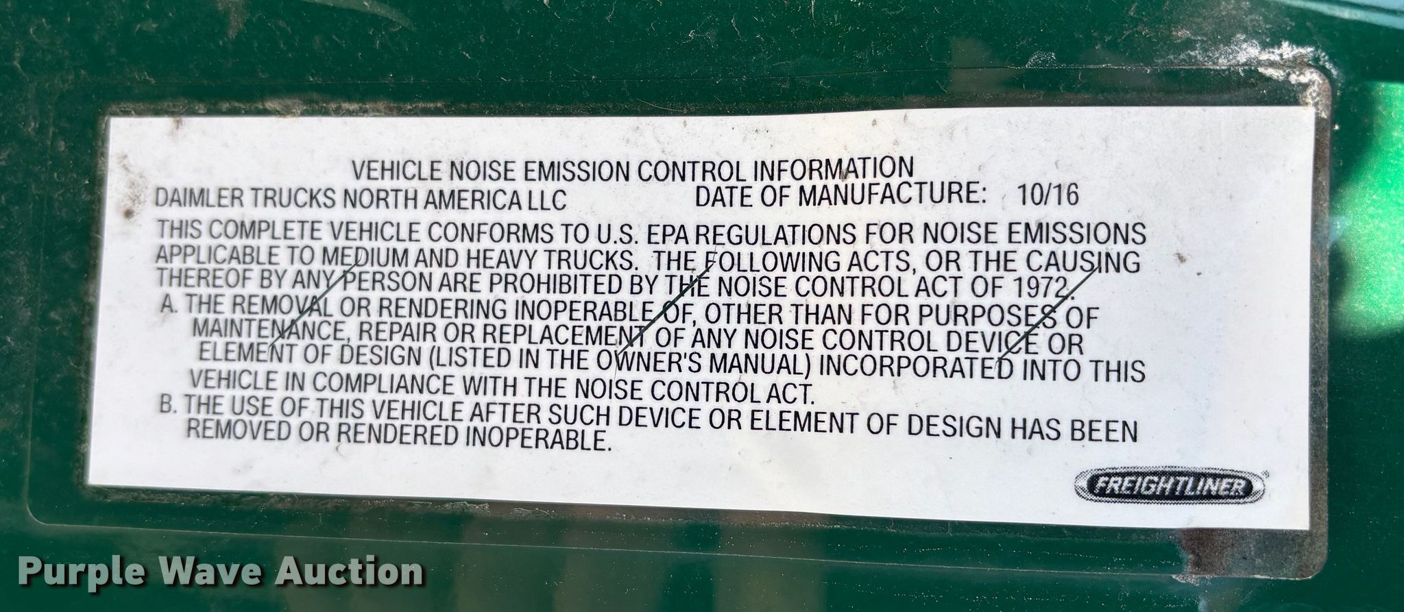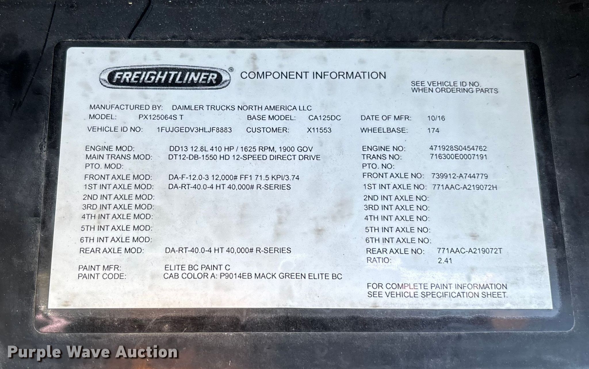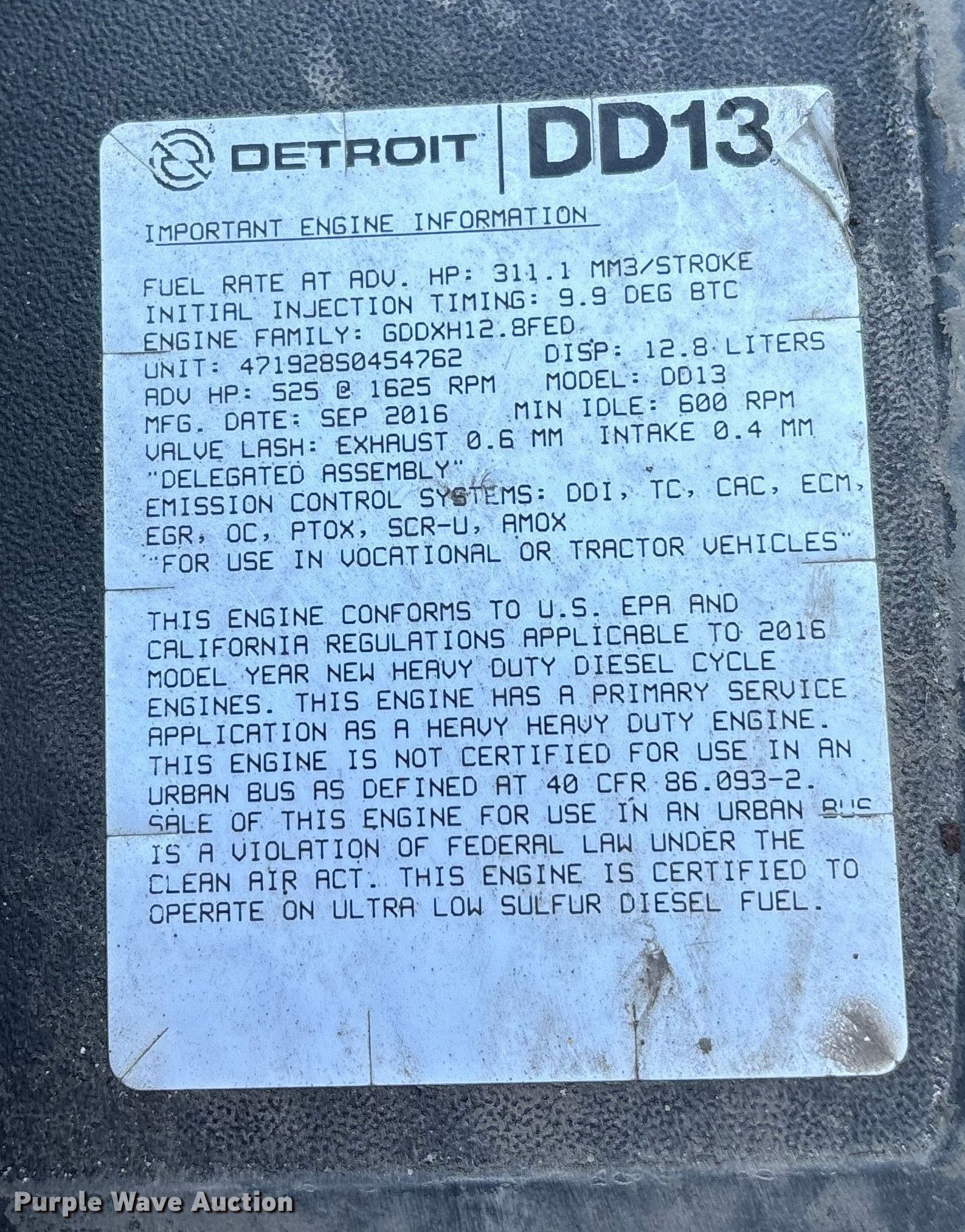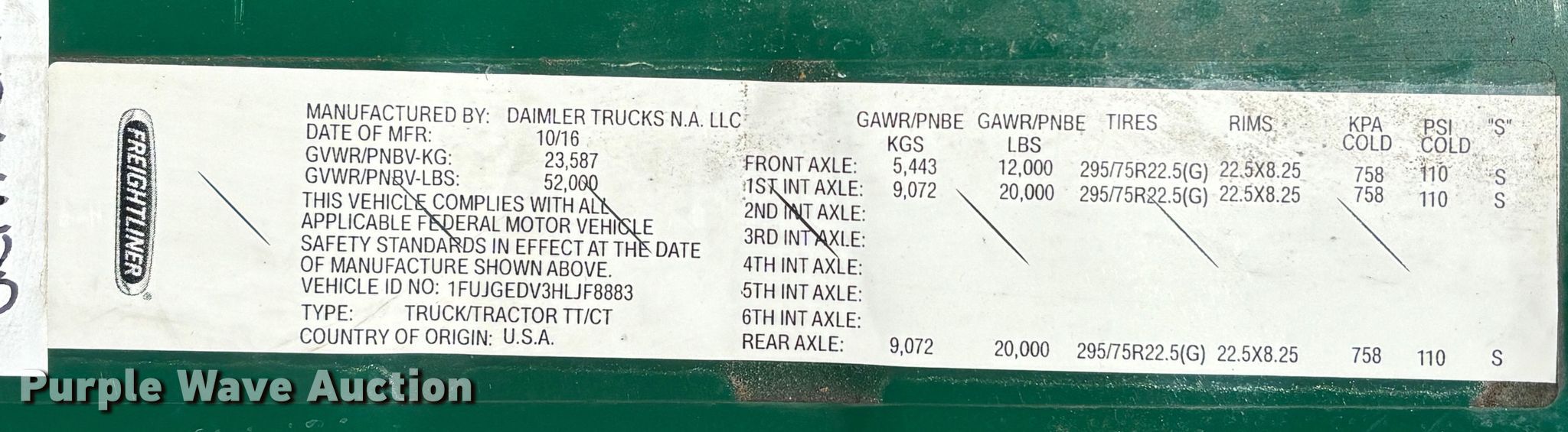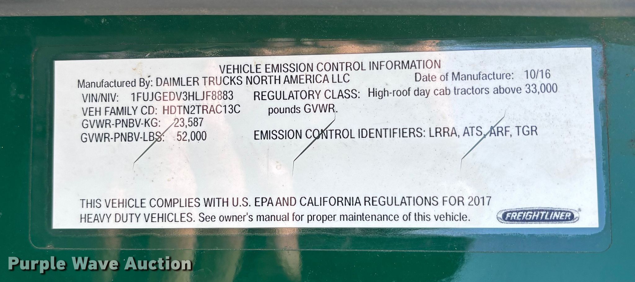 2017 Freightliner Cascadia 125 semi truck. Miles: 387,418 on odometer, Hours: 13,428 on meter, VIN: 1FUJGEDV3HLJF8883, Unit #: 1092. Engine Detroit Diesel DD13, Displacement: 12.8L, Cylinders: 6, Fuel type: Diesel, HP: 410, Engine brake. Transmission Automated manual. Chassis Axles: Tandem, Differential lock: Inter-axle, Suspension: Air Dump valves, Brakes: Air, GVWR: 52,000 lbs FAWR: 12,000 lbs, IAWR: 20,000 lbs, RAWR: 20,000 lbs, Wheelbase: 174". Interior AC, Heat, Heated mirrors, Power windows, Cruise control, Air ride cab, Auxiliary controls, Brake controller. Features Deck plate: Aluminum, Fifth wheel type: Fixed, Fuel tank: Dual. Tires Size: 296/75R22.5. Notes Dash warning indicator: Check engine, Stop Engine, Jump start required during on-site data collection, ATS electric system issues , Unit in limp mode , Unit must be towed or hauled. Indiana title. Title distribution may be delayed up to 30 days from verification of funds. Standard Forwarding, LLC Strategic Fleet Realignment Sale - Open inspection April 20th 2026 from 9:00 a.m. to 3:00 p.m.. 2925 Morton Drive. East Moline, IL 61244
