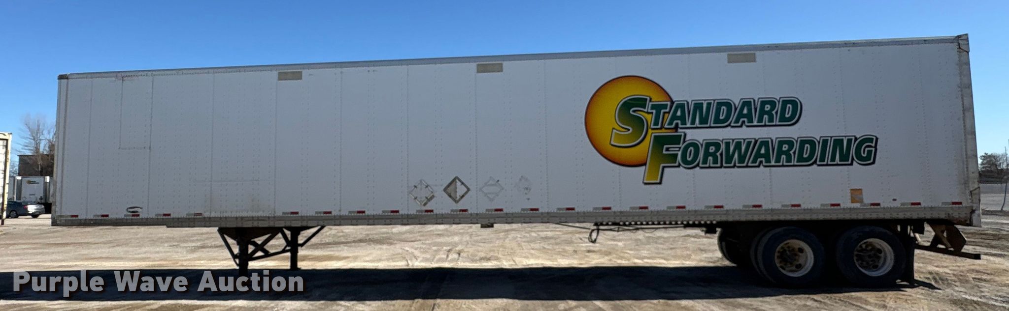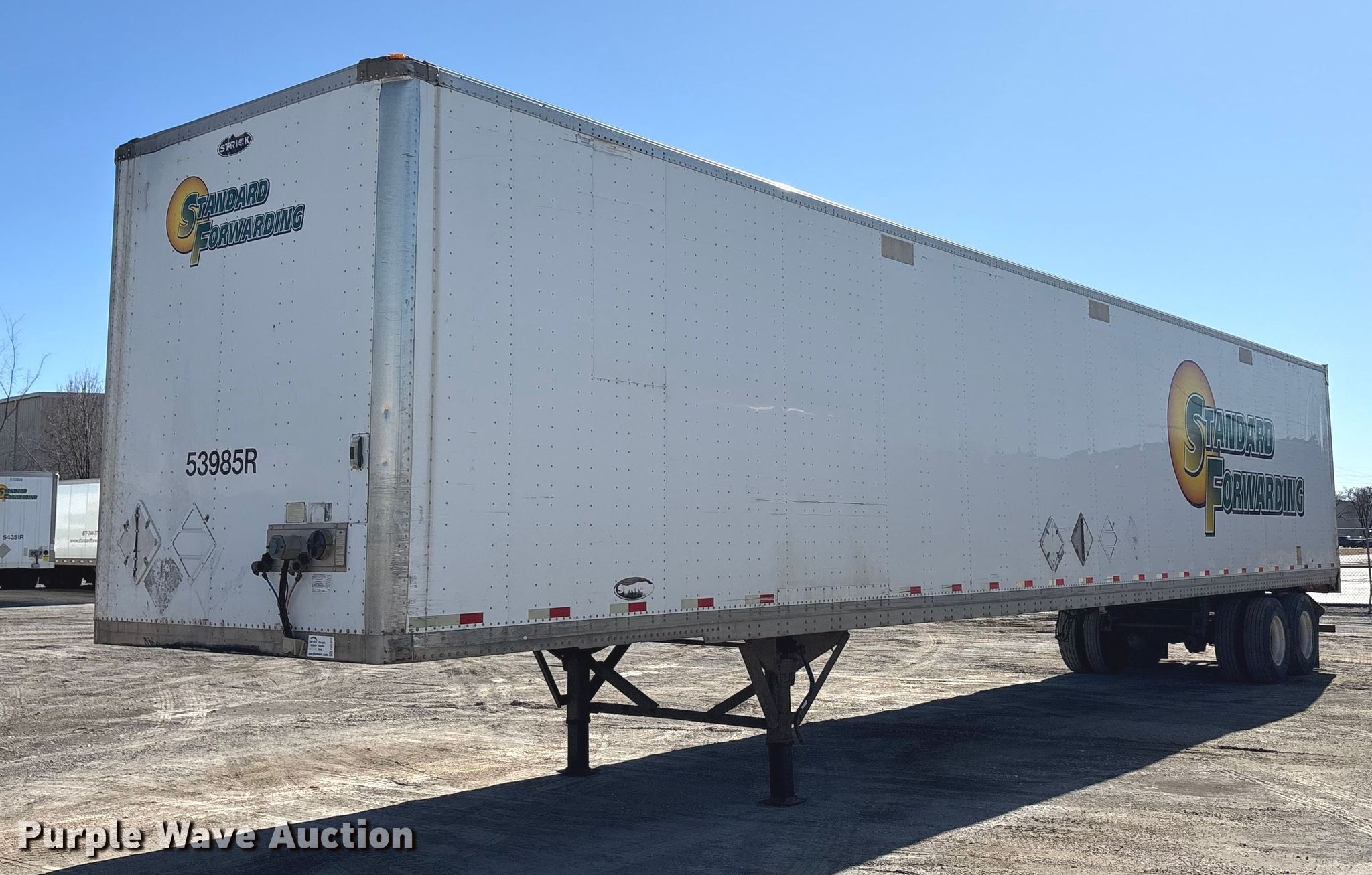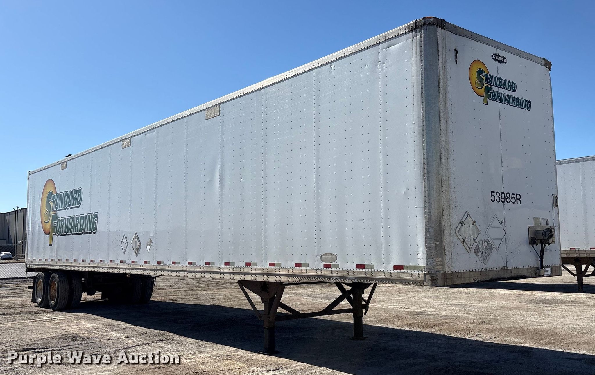 2013 Strick dry van trailer. VIN: 1S12E9534DE526247, Unit #: 53985R. Dimensions Overall Length: 53', Width: 102", Rear door / ramp Width: 93". Features Deck type: Wood, E-track rail system. Chassis Landing gear: Dual, Suspension: Spring, Brakes: Air, Axles: Tandem, GVWR: 65,000 lbs, GAWR: 17,000 lbs. Tires Steel wheels, Size: 295/75R22.5. Indiana title. Title distribution may be delayed up to 30 days from verification of funds. Standard Forwarding, LLC Strategic Fleet Realignment Sale - Open inspection April 20 from 9:00 a.m. to 3:00 p.m.. 2925 Morton Drive. East Moline, IL 61244