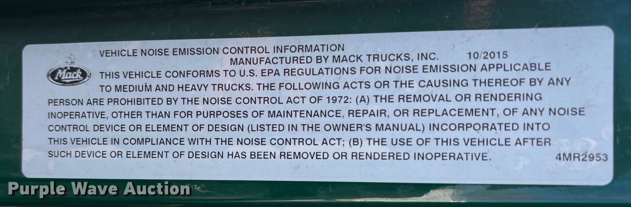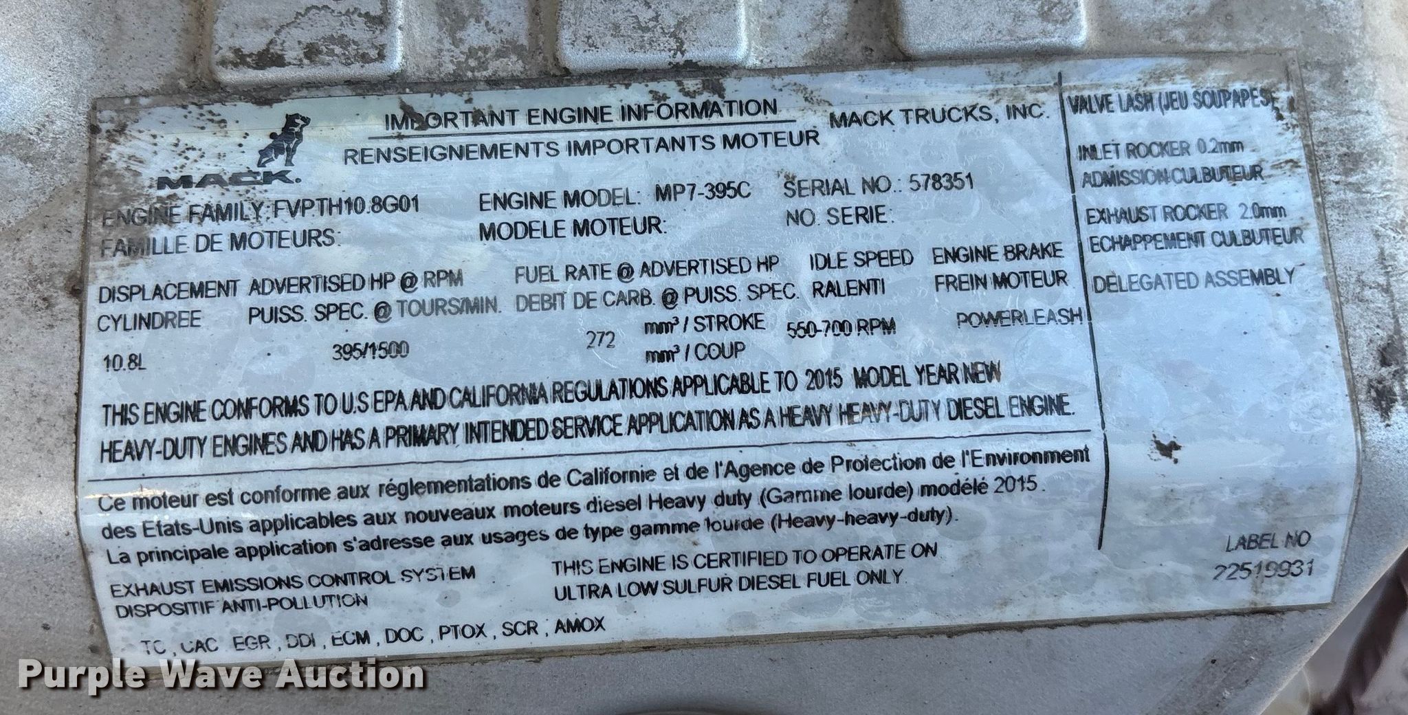 2016 Mack CXU613 semi truck. Miles: 509,335 on odometer, Hours: 18,311 on meter, VIN: 1M1AW02Y7GM077022, Unit #: 748. Engine Mack MP7, Displacement: 10.8L, Cylinders: 6, Fuel type: Diesel, HP: 395, Engine brake. Transmission Mack MDrive, Automated manual. Chassis Axles: Tandem, Differential lock: Inter-axle, Suspension: Air Dump valves, Brakes: Air, GVWR: 52,000 lbs FAWR: 12,000 lbs, IAWR: 20,000 lbs, RAWR: 20,000 lbs. Interior AC, Heat, Heated mirrors, Cruise control, Air ride cab. Features Deck plate: Aluminum, Fifth wheel type: Fixed, Fuel tank: Dual. Tires Size: 295/75R22.5. Notes Dash warning indicator: Check engine, ABS, ATC, Jump start required during on-site data collection. Indiana title. Title distribution may be delayed up to 30 days from verification of funds. Standard Forwarding, LLC Strategic Fleet Realignment Sale - Open inspection April 20 from 9:00 a.m. to 3:00 p.m.. 2925 Morton Drive. East Moline, IL 61244