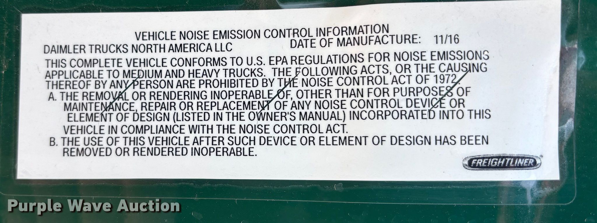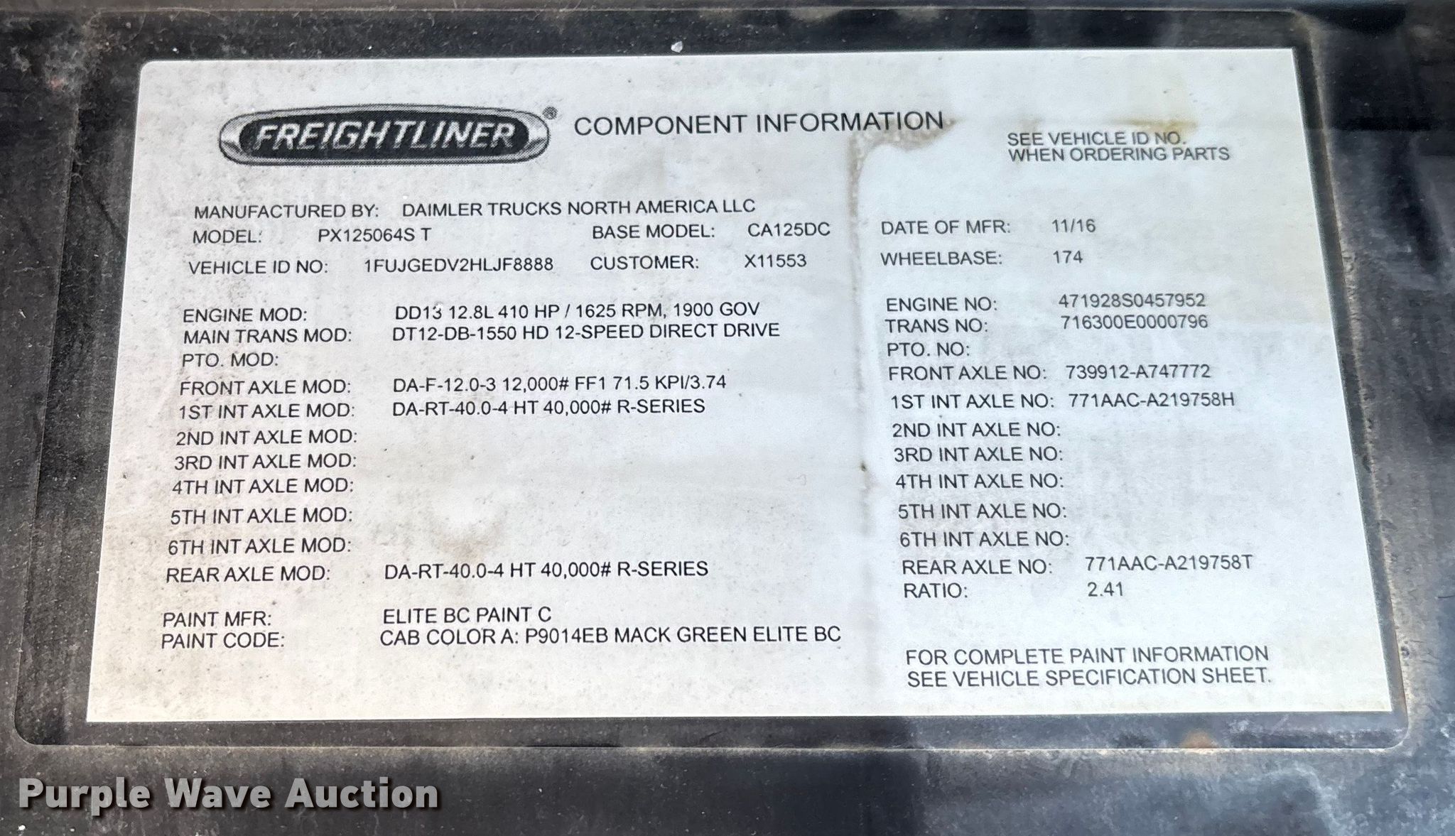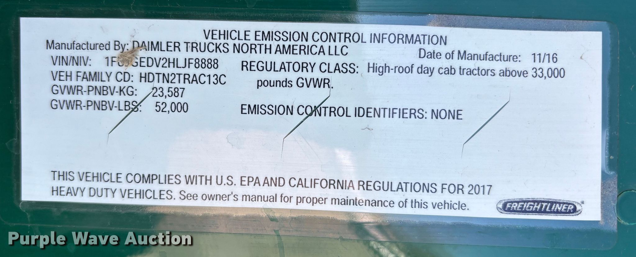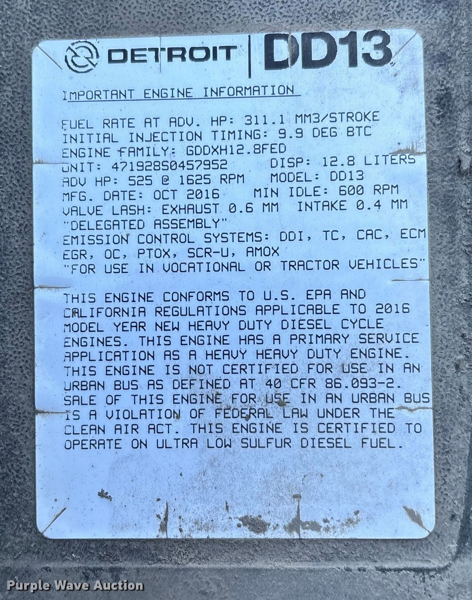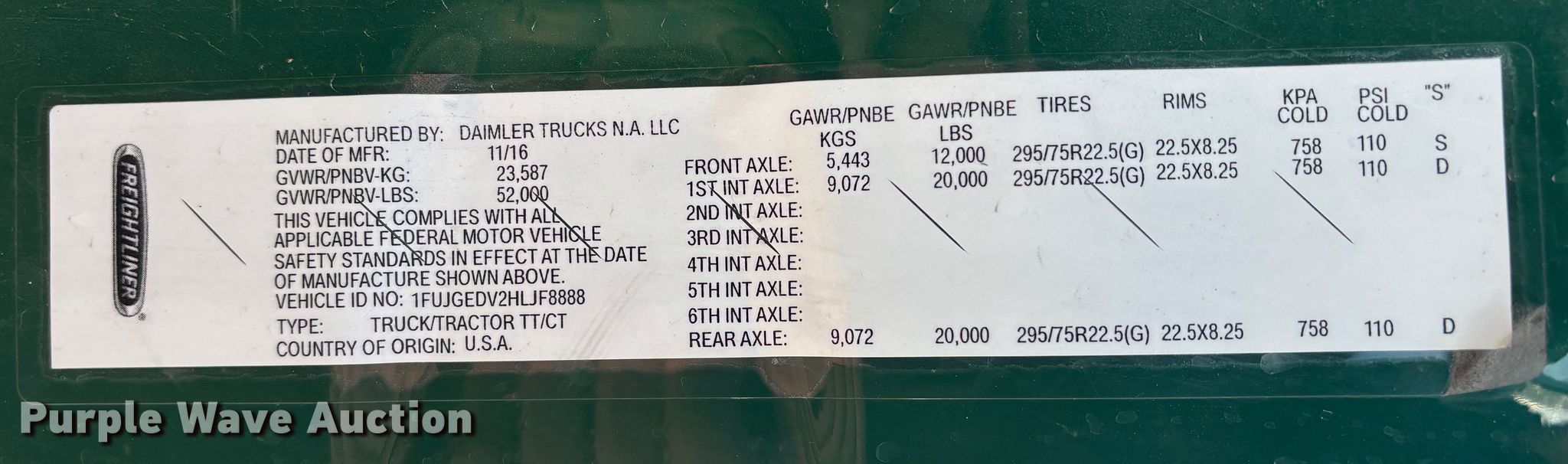 2017 Freightliner Cascadia 125 semi truck. Miles: 620,534 on odometer, Hours: 16,590 on meter, VIN: 1FUJGEDV2HLJF8888, Unit #: 1097. Engine Detroit Diesel DD13, Displacement: 12.8L, Cylinders: 6, Fuel type: Diesel, HP: 410, Engine brake. Transmission Automated manual. Chassis Axles: Tandem, Differential lock: Inter-axle, Suspension: Air Dump valves, Brakes: Air, GVWR: 52,000 lbs FAWR: 12,000 lbs, IAWR: 20,000 lbs, RAWR: 20,000 lbs, Wheelbase: 174". Interior AC, Heat, Heated mirrors, Power windows, Cruise control, Air ride cab, Auxiliary controls, Brake controller. Features Deck plate: Aluminum, Fifth wheel type: Fixed, Fuel tank: Dual. Tires Size: 295/75R22.5. Notes Dash warning indicator: Check engine, Regen, Jump start required during on-site data collection. Indiana title. Title distribution may be delayed up to 30 days from verification of funds. Standard Forwarding, LLC Strategic Fleet Realignment Sale - Open inspection April 20th 2026 from 9:00 a.m. to 3:00 p.m.. 2925 Morton Drive. East Moline, IL 61244