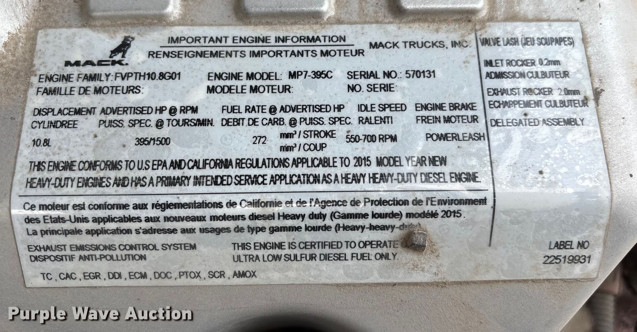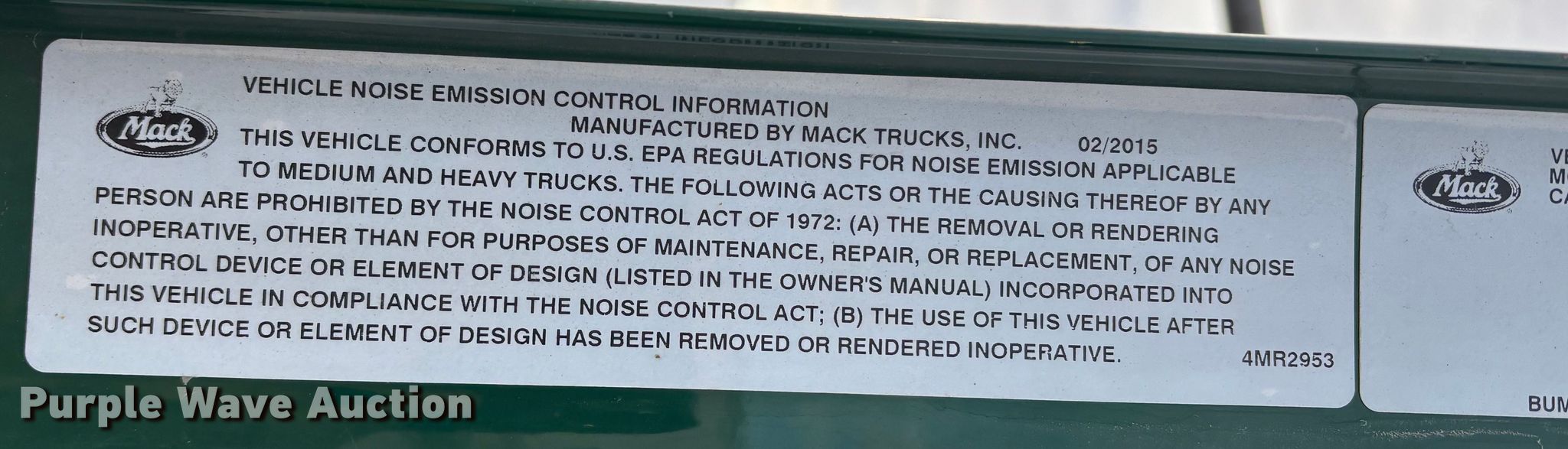 2016 Mack CXU613 semi truck. Miles: 516,686 on odometer, Hours: 17,189 on meter, VIN: 1M1AW02Y5GM053138. Engine Mack MP7, Displacement: 10.8L, Cylinders: 6, Fuel type: Diesel, Engine brake. Transmission Mack mDrive, Automated manual. Chassis Axles: Tandem, Differential lock: Inter-axle, Suspension: Air Dump valves, Brakes: Air, GVWR: 52,000 lbs. FAWR: 12,000 lbs., IAWR: 20,000 lbs., RAWR: 20,000 lbs., Wheelbase: 174". Interior AC, Heat, Heated mirrors, Cruise control, Air ride cab, Brake controller. Features Deck plate: Aluminum, Fifth wheel type: Fixed, Fuel tank: Dual. Tires Size: 295/75R22.5. Notes Dash warning indicator: Check engine, ABS, Windshield chipped or cracked, Jump start required during on-site data collection. Indiana title. Title distribution may be delayed up to 30 days from verification of funds. Standard Forwarding, LLC Strategic Fleet Realignment Sale - Open inspection April 20th 2026 from 9:00 a.m. to 3:00 p.m.. 2925 Morton Drive. East Moline, IL 61244