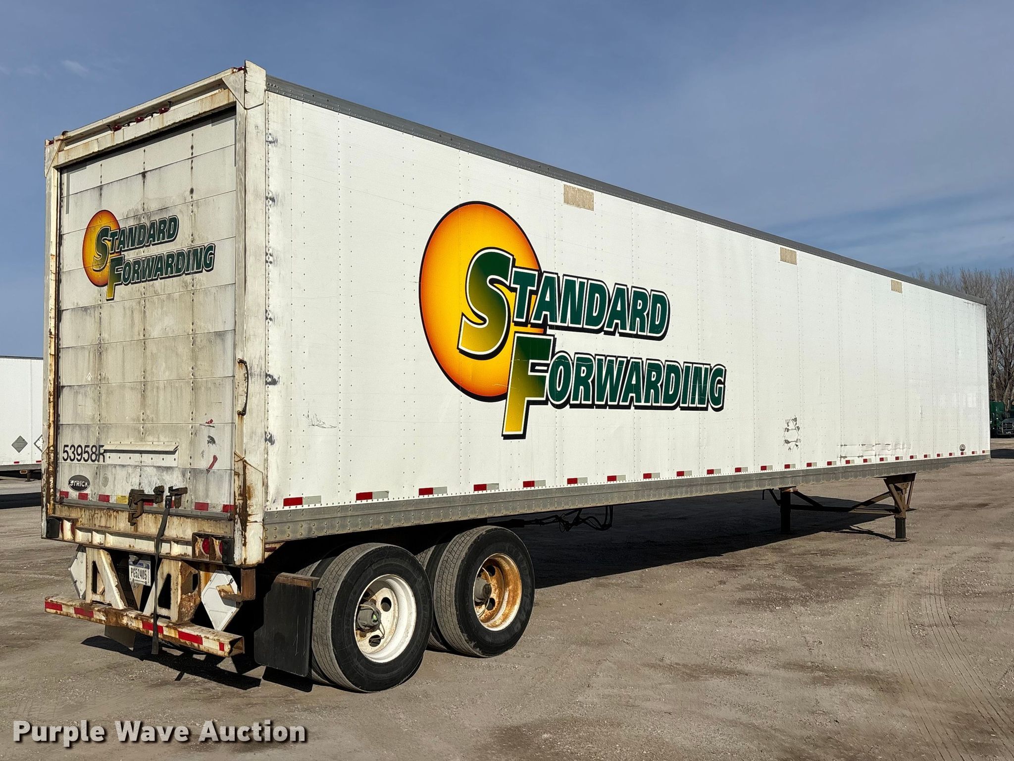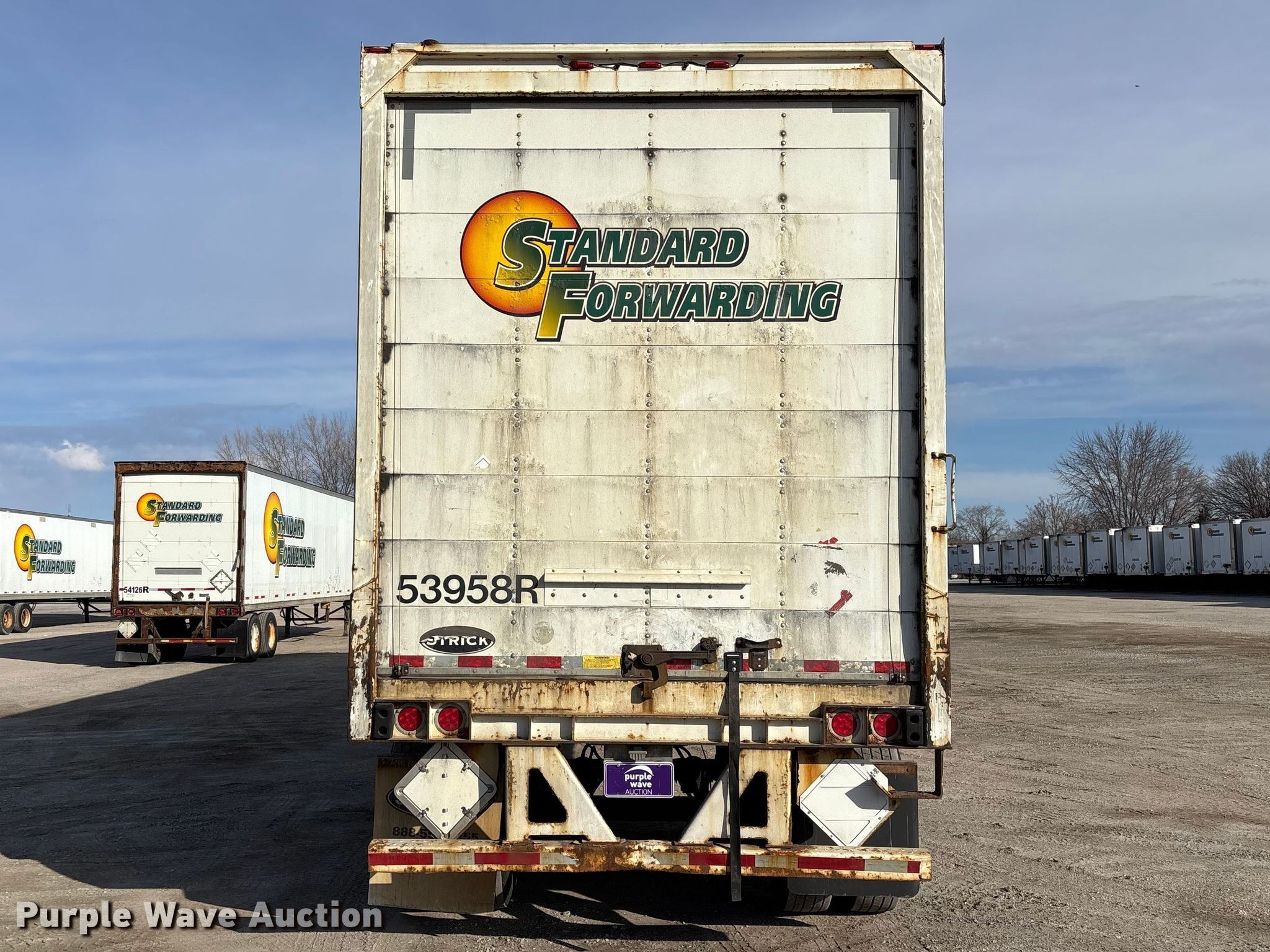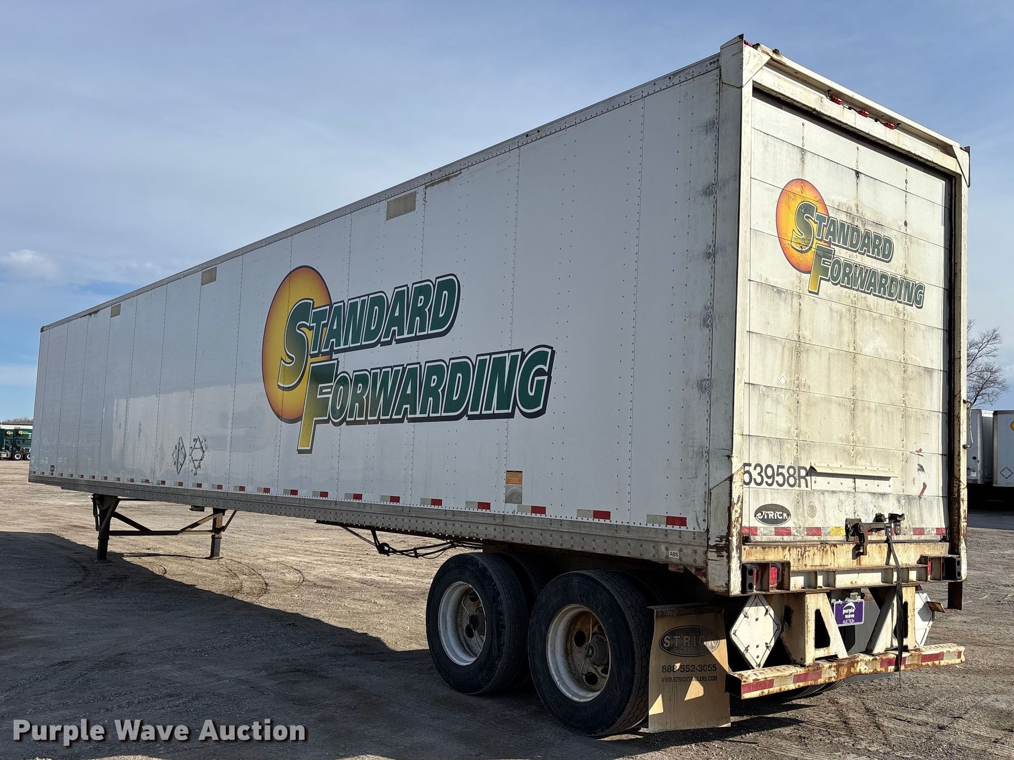 2013 Strick dry van trailer. VIN: 1S12E9536DE526220, Unit #: 53958R. Dimensions Overall Length: 53' 4", Width: 102", Body Length: 53', Width: 102", Rear door / ramp Width: 93". Features Deck type: Wood. Chassis Landing gear: Dual, Suspension: Spring, Brakes: Air, Axles: Tandem, GVWR: 65,000 lbs, GAWR: 17,000 lbs. Tires Steel wheels, Size: 295/75R22.5. Indiana title. Title distribution may be delayed up to 30 days from verification of funds. Standard Forwarding, LLC Strategic Fleet Realignment Sale - Open inspection April 20th 2026 from 9:00 a.m. to 3:00 p.m.. 2925 Morton Drive. East Moline, IL 61244