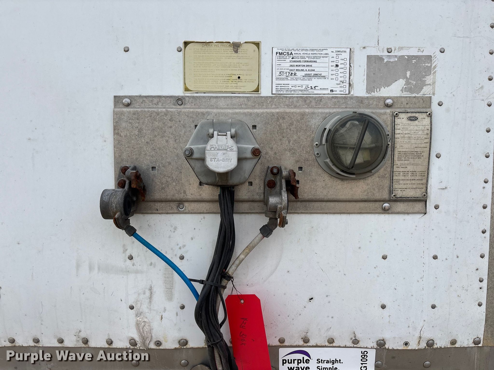 2013 Strick dry van trailer. VIN: 1S12E9531DE526240. Dimensions Overall Length: 53' 4", Width: 102", Body Length: 53', Width: 102", Rear door / ramp Width: 93". Features Deck type: Wood. Chassis Landing gear: Dual, Suspension: Spring, Brakes: Air, Axles: Tandem, GVWR: 65,000 lbs, GAWR: 17,000 lbs. Tires Steel wheels, Size: 295/75R22.5. Indiana title. Title distribution may be delayed up to 30 days from verification of funds. Standard Forwarding, LLC Strategic Fleet Realignment Sale - Open inspection April 20th 2026 from 9:00 a.m. to 3:00 p.m.. 2925 Morton Drive. East Moline, IL 61244