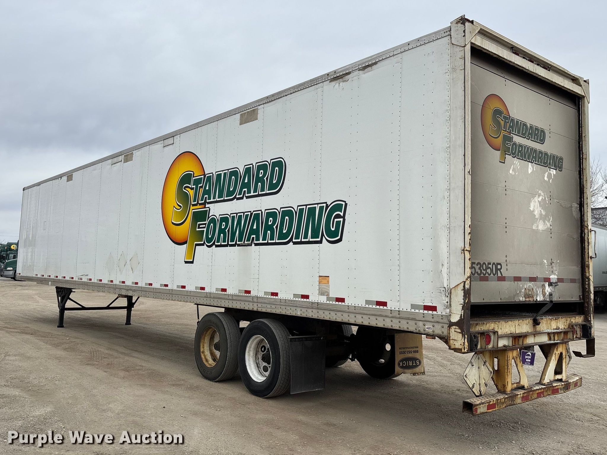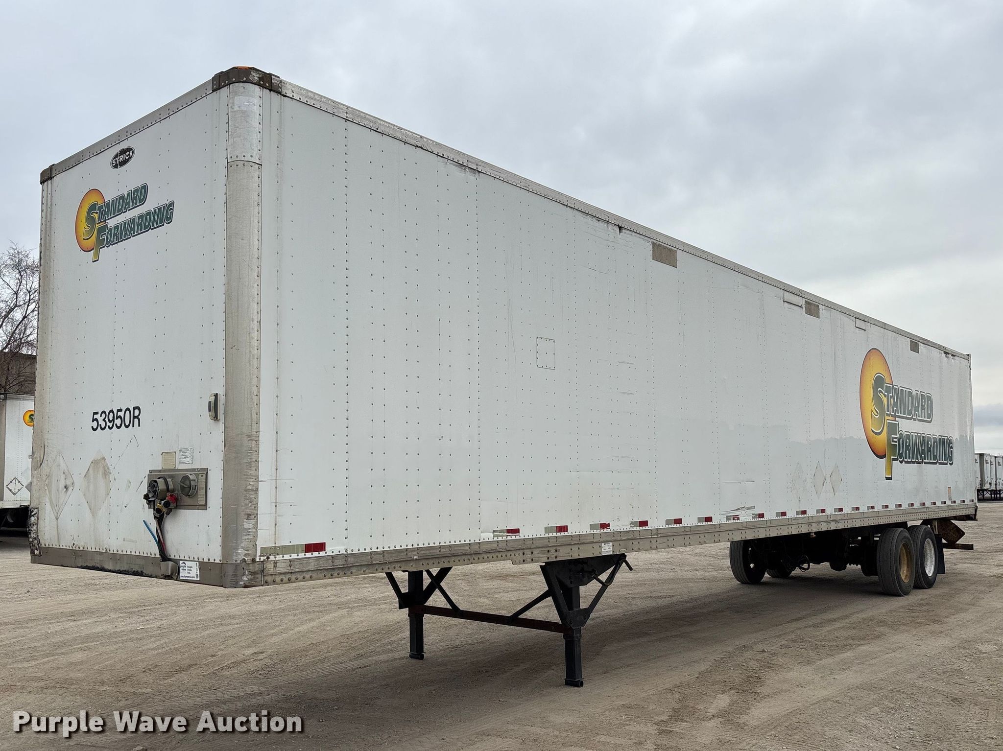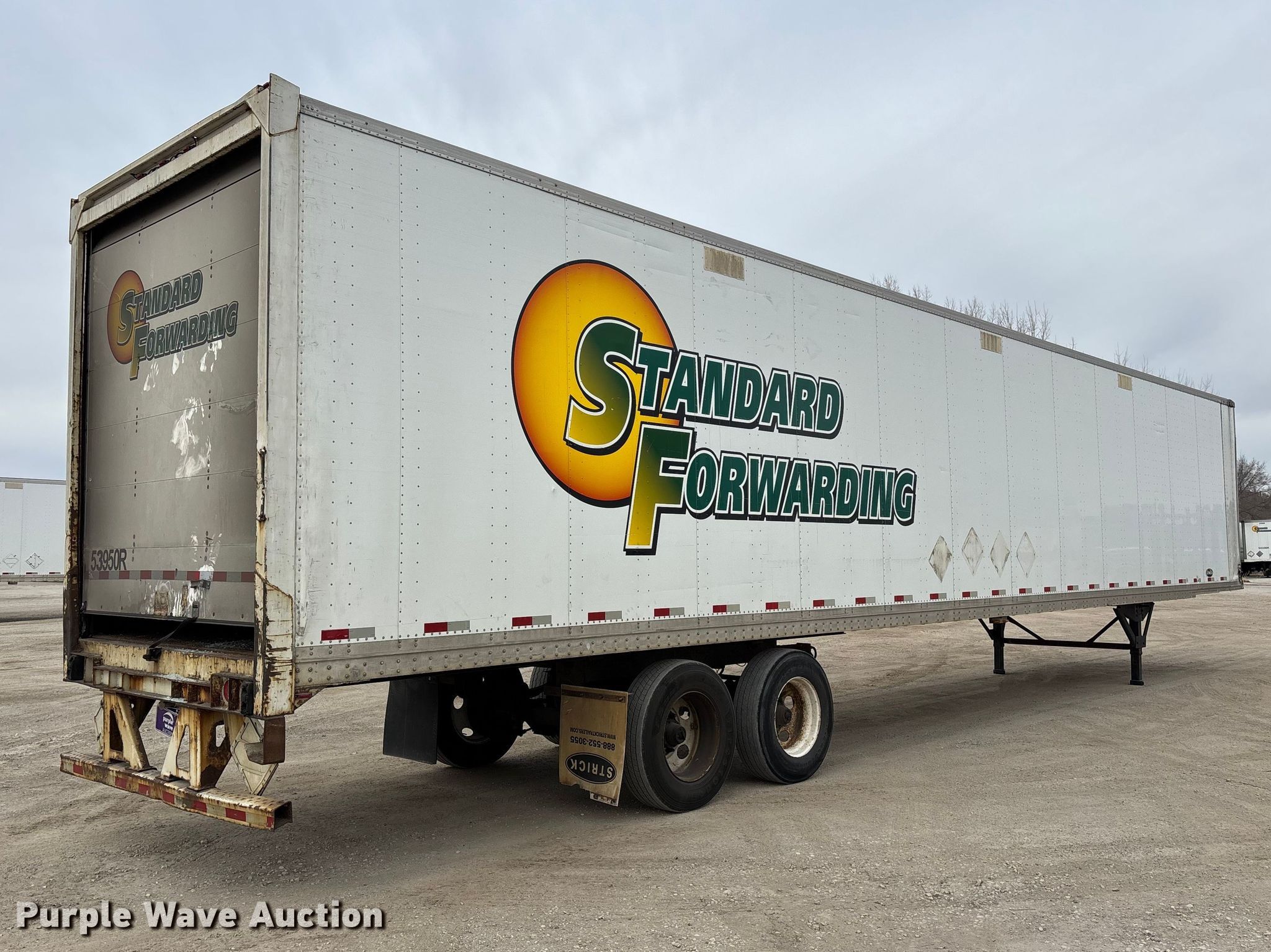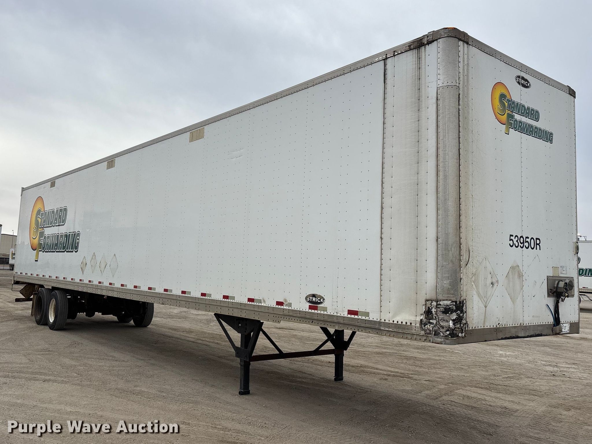 2013 Strick dry van trailer. VIN: 1S12E9537DE526212, Unit #: 53950R. Dimensions Overall Length: 53', Width: 102", Body Length: 53', Width: 102", Rear door / ramp Width: 93". Features Deck type: Wood. Chassis Landing gear: Dual, Suspension: Spring, Brakes: Air, Axles: Tandem, GVWR: 65,000 lbs, GAWR: 17,000 lbs. Tires Steel wheels, Size: 295/75R22.5. Notes Latch missing. Indiana title. Title distribution may be delayed up to 30 days from verification of funds. Standard Forwarding, LLC Strategic Fleet Realignment Sale - Open inspection April 20th 2026 from 9:00 a.m. to 3:00 p.m.. 2925 Morton Drive. East Moline, IL 61244