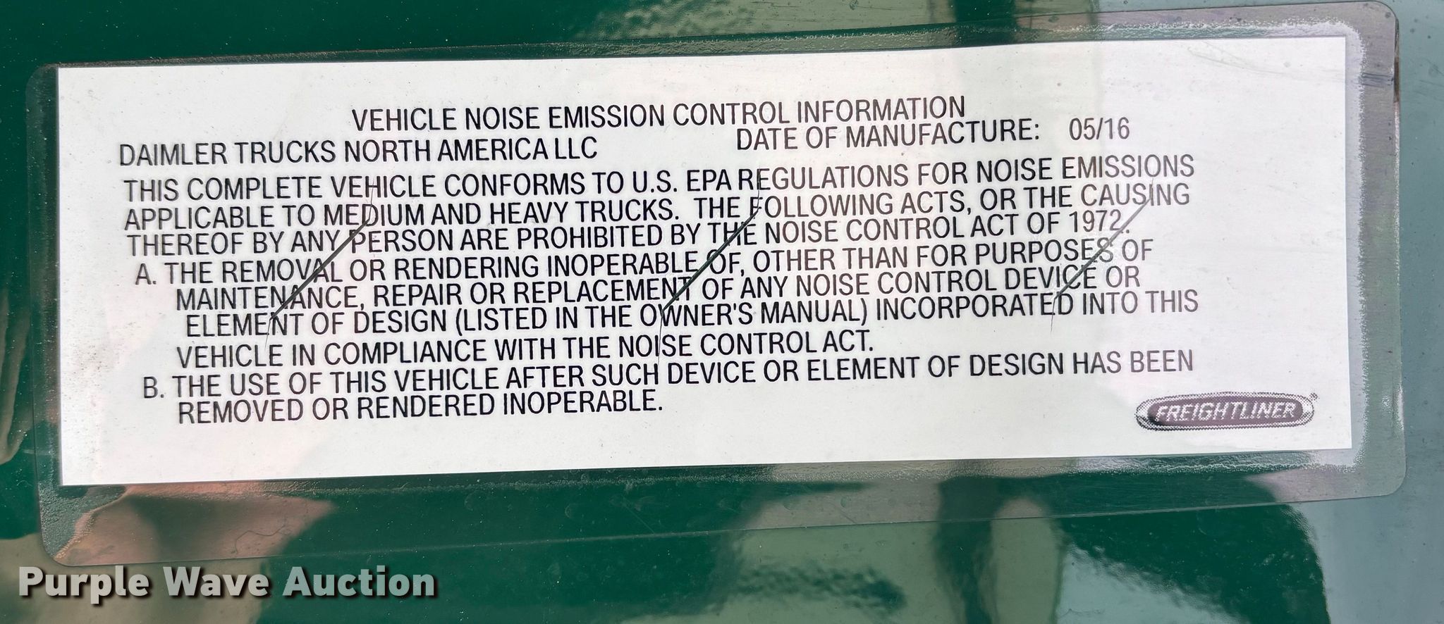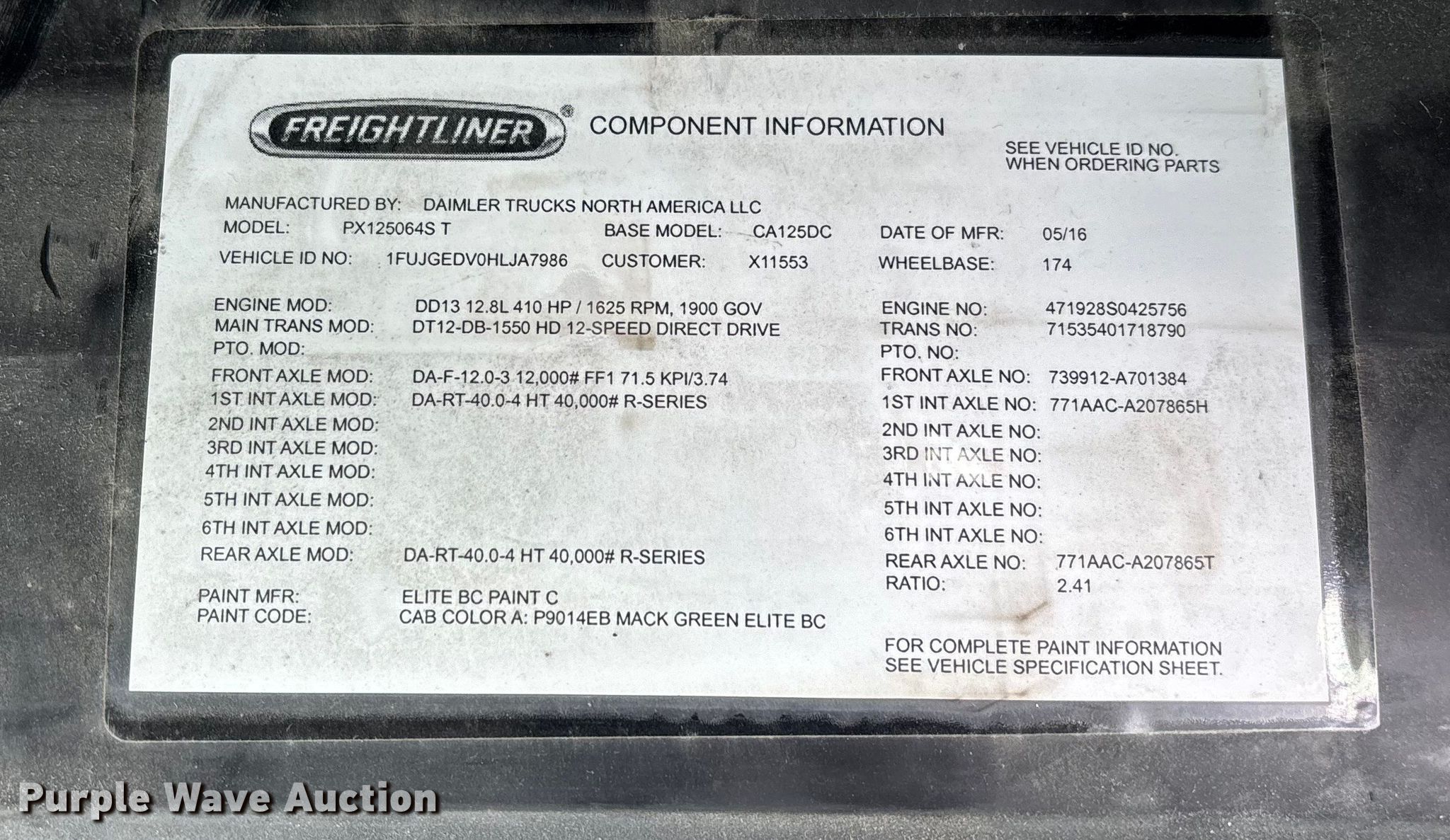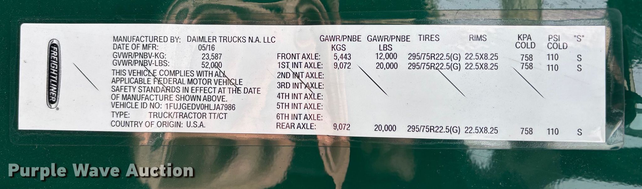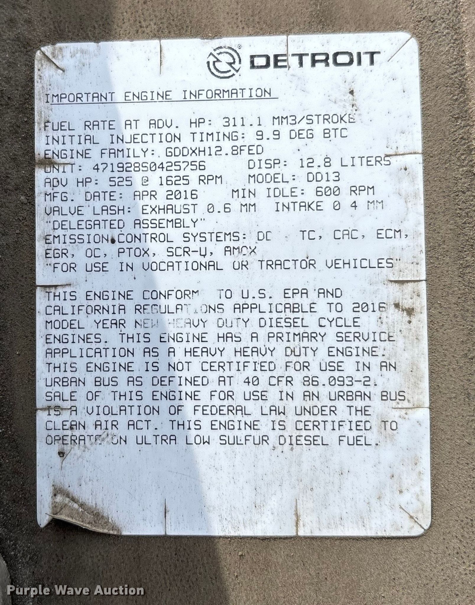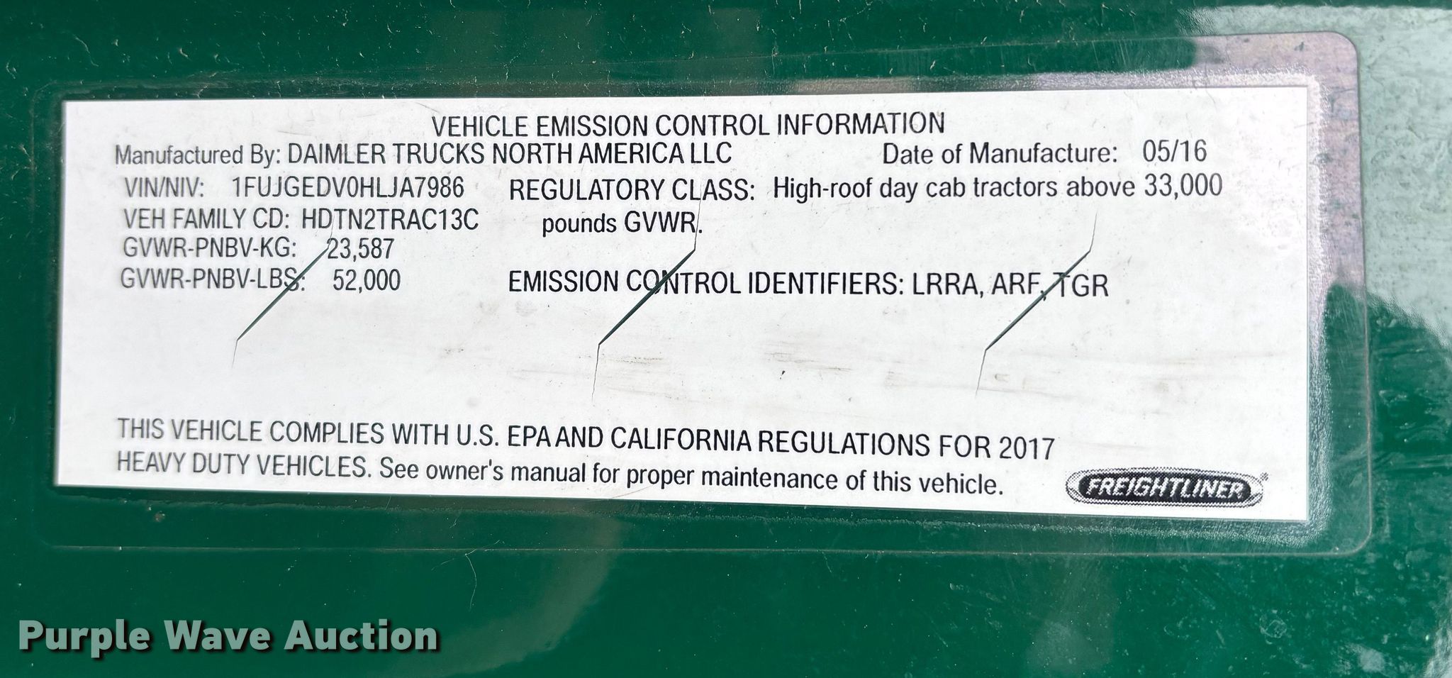 2017 Freightliner Cascadia 125 semi truck. Miles: 438,637 on odometer, VIN: 1FUJGEDV0HLJA7986, Unit #: 1003. Engine Detroit DD13, Displacement: 12.8L, Cylinders: 6, Fuel type: Diesel, HP: 410, Engine brake. Transmission Detroit DT12-DB-1550, Automated manual. Chassis Axles: Tandem, Gear ratio: 2.41, Differential lock: Inter-axle, Suspension: Air Dump valves, Brakes: Air, GVWR: 52,000 lbs FAWR: 12,000 lbs, IAWR: 20,000 lbs, RAWR: 20,000 lbs, Wheelbase: 174". Interior AC, Heated mirrors, Power windows, Cruise control, Air ride cab, Brake controller. Features Deck plate: Aluminum, Fifth wheel type: Fixed, Fuel tank: Dual. Tires Size: 295/75R22.5. Notes Possible clutch issues, Non-operational unit, Unit must be towed or hauled. Indiana title. Title distribution may be delayed up to 30 days from verification of funds. Standard Forwarding, LLC Strategic Fleet Realignment Sale - Open inspection April 20th 2026 from 9:00 a.m. to 3:00 p.m.. 2925 Morton Drive. East Moline, IL 61244