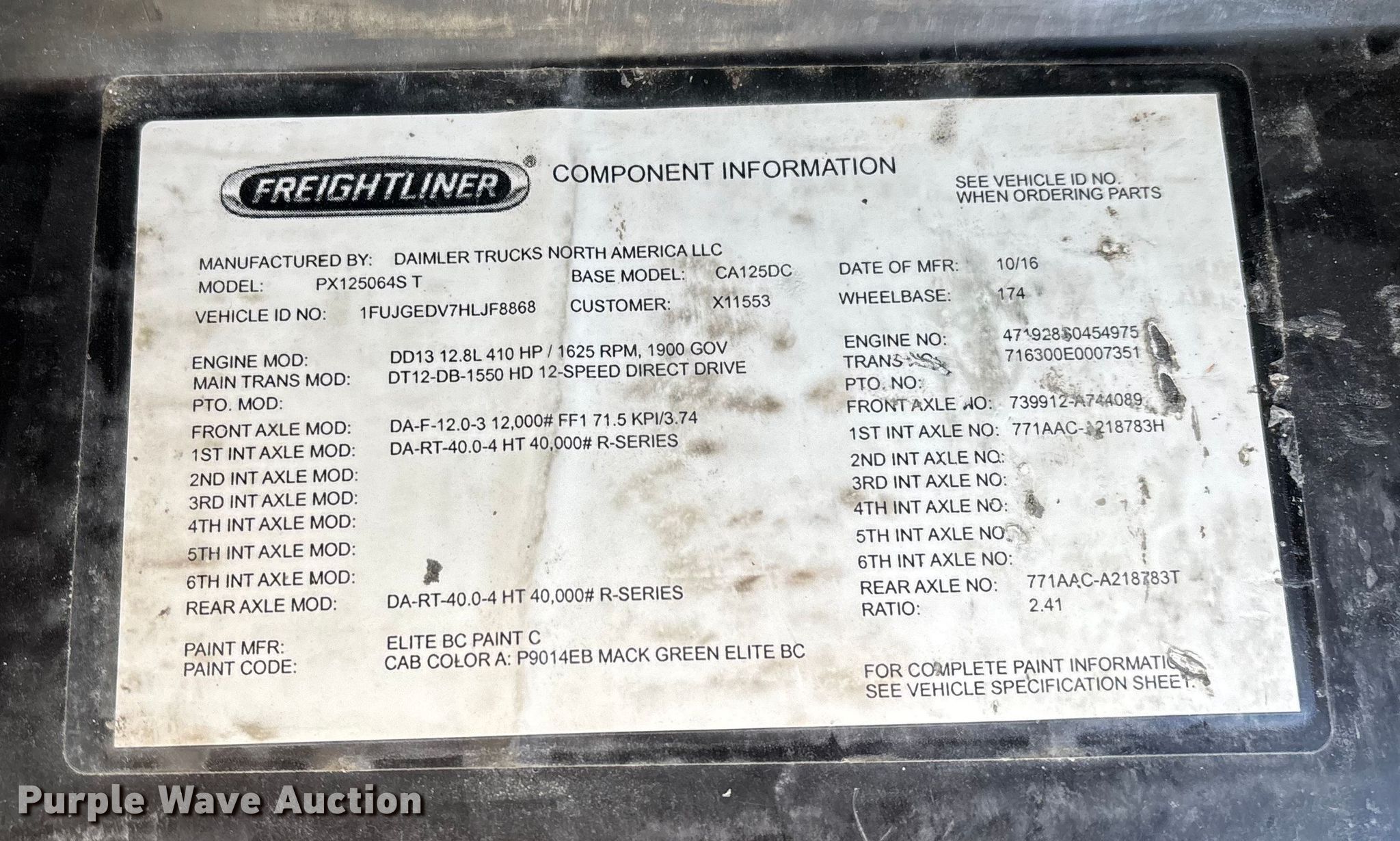 2017 Freightliner Cascadia 125 semi truck. Miles: 403,916 on odometer, Hours: 14,819 on meter, VIN: 1FUJGEDV7HLJF8868. Engine Detroit Diesel DD13, Displacement: 12.8L, Cylinders: 6, Fuel type: Diesel, HP: 410, Engine brake. Transmission Detroit DT12-DB-1550, Automated manual. Chassis Axles: Tandem, Gear ratio: 2.41, Differential lock: Inter-axle, Suspension: Air Dump valves, Brakes: Air, GVWR: 52,000 lbs FAWR: 12,000 lbs, IAWR: 20,000 lbs, RAWR: 20,000 lbs, Wheelbase: 174". Interior AC, Heat, Heated mirrors, Power windows, Cruise control, Air ride cab, Brake controller. Features Deck plate: Aluminum, Fifth wheel type: Fixed, Fuel tank: Dual. Tires Size: 295/75R22.5. Notes Dash warning indicator: Check engine, Windshield chipped or cracked. Indiana title. Title distribution may be delayed up to 30 days from verification of funds. Standard Forwarding, LLC Strategic Fleet Realignment Sale. Owatonna, MN 55060