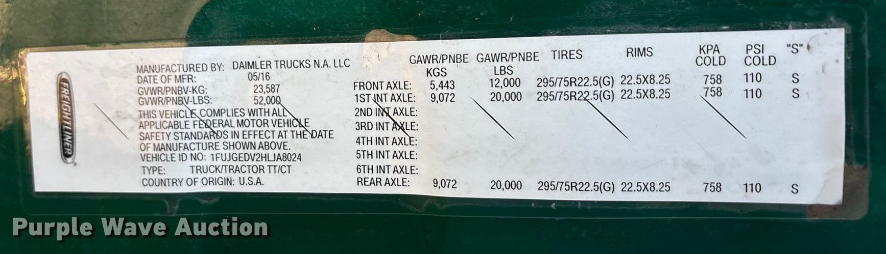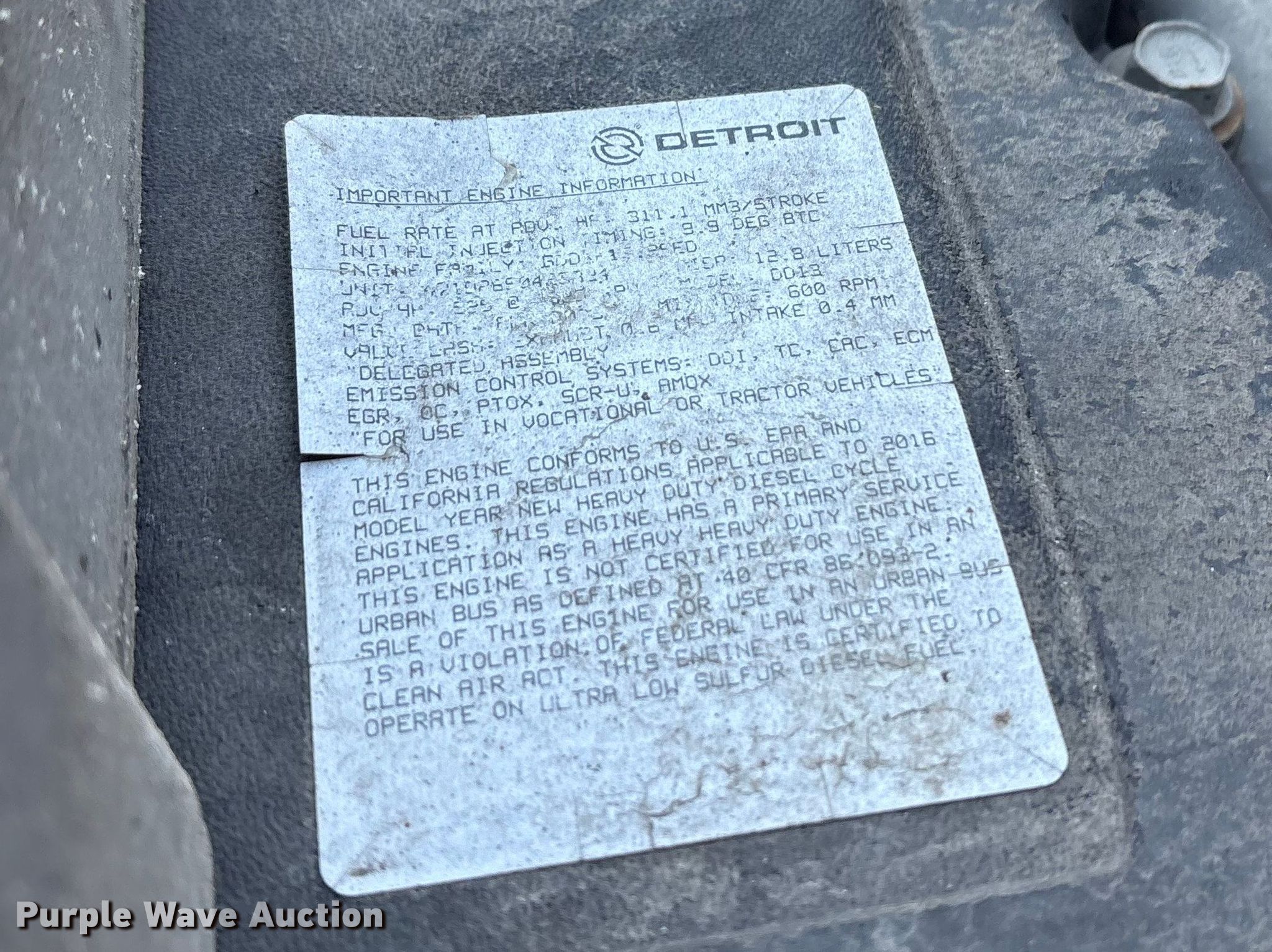 2017 Freightliner Cascadia 125 semi truck. Miles: 549,794 on odometer, VIN: 1FUJGEDV2HLJA8024, Unit #: 1041. Engine Detroit Diesel DD13, Displacement: 12.8L, Cylinders: 6, Fuel type: Diesel, Engine brake. Transmission Automated manual. Chassis Axles: Tandem, Differential lock: Inter-axle, Suspension: Air Dump valves, Brakes: Air, GVWR: 52,000 lbs FAWR: 12,000 lbs, IAWR: 20,000 lbs, RAWR: 20,000 lbs. Interior AC, Heat, Heated mirrors, Power windows, Cruise control, Air ride cab. Features Deck plate: Aluminum, Fifth wheel type: Fixed, Fuel tank: Dual. Tires Size: 295/75R22.5. Notes Dash warning indicator: Check engine, Windshield chipped or cracked, Jump start required during on-site data collection, Key not included. Indiana title. Title distribution may be delayed up to 30 days from verification of funds. Standard Forwarding, LLC Strategic Fleet Realignment Sale. Owatonna, MN 55060