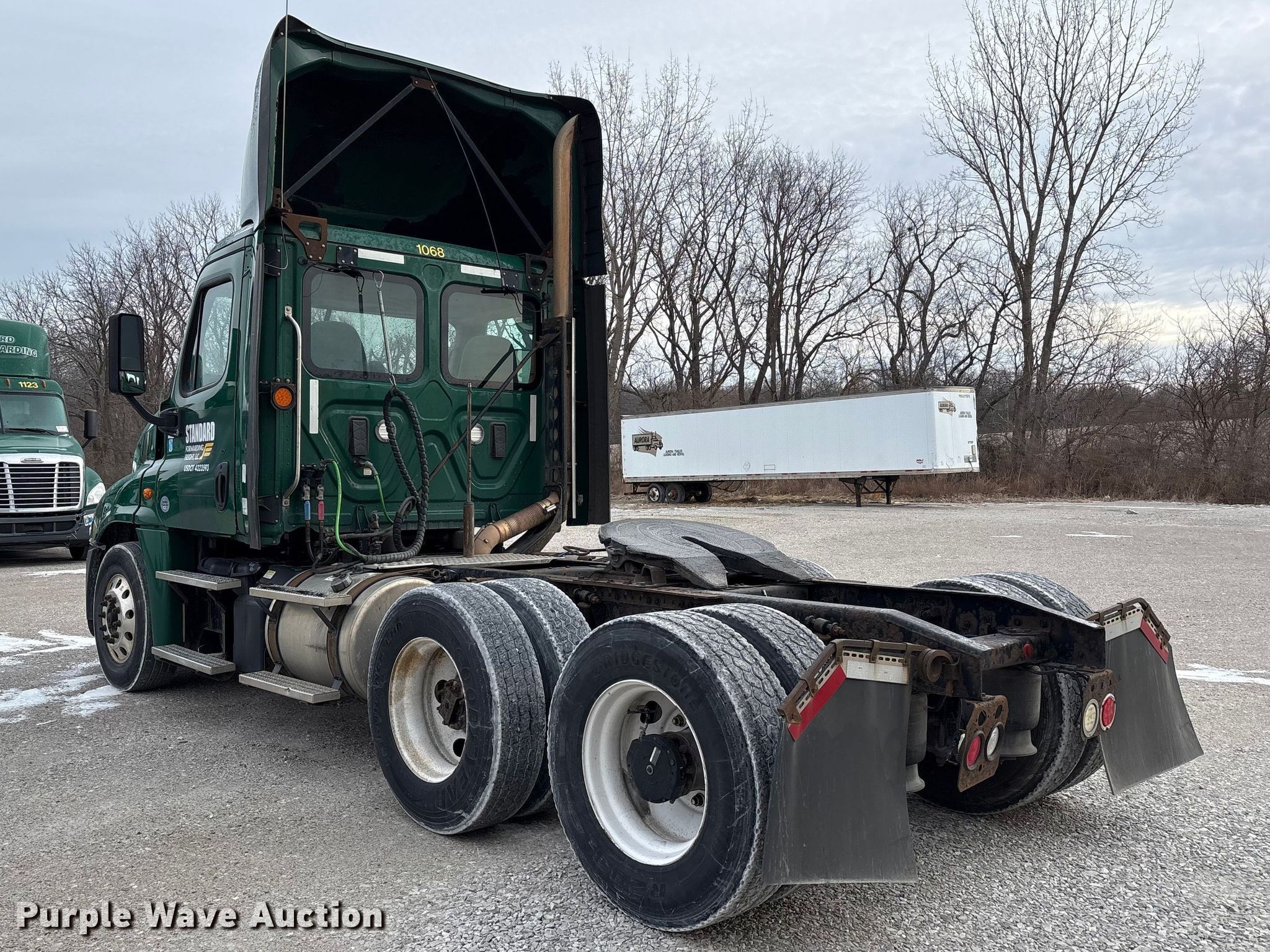 2017 Freightliner Cascadia 125 semi truck. Miles: 745,238 on odometer, Hours: Unknown, VIN: 1FUJGEDV6HLJF8859, Unit #: 1068. Engine Detroit Diesel DD13, Serial: 47192850454538, Displacement: 12.8L, Cylinders: 6, Fuel type: Diesel, HP: 410, Engine brake. Transmission Detroit Diesel DT12-DB-1550 HD, Automated manual. Chassis Axles: Tandem, Gear ratio: 2.41, Differential lock: Inter-axle, Suspension: Air Dump valves, Brakes: Air, GVWR: 52,000 lbs FAWR: 12,000 lbs, IAWR: 20,000 lbs, RAWR: 20,000 lbs, Wheelbase: 174". Interior AC, Heat, Heated mirrors, Power windows, Cruise control, Air ride cab. Features Deck plate: Aluminum, Fifth wheel type: Fixed, Fuel tank: Dual. Tires Size: 295/75R22.5. Notes Dash warning indicator: Check engine, Jump start required during on-site data collection, Non-operational hour meter, Oil leak. Indiana title. Title distribution may be delayed up to 30 days from verification of funds. Standard Forwarding, LLC Strategic Fleet Realignment Sale. Crawfordsville, IN 47933