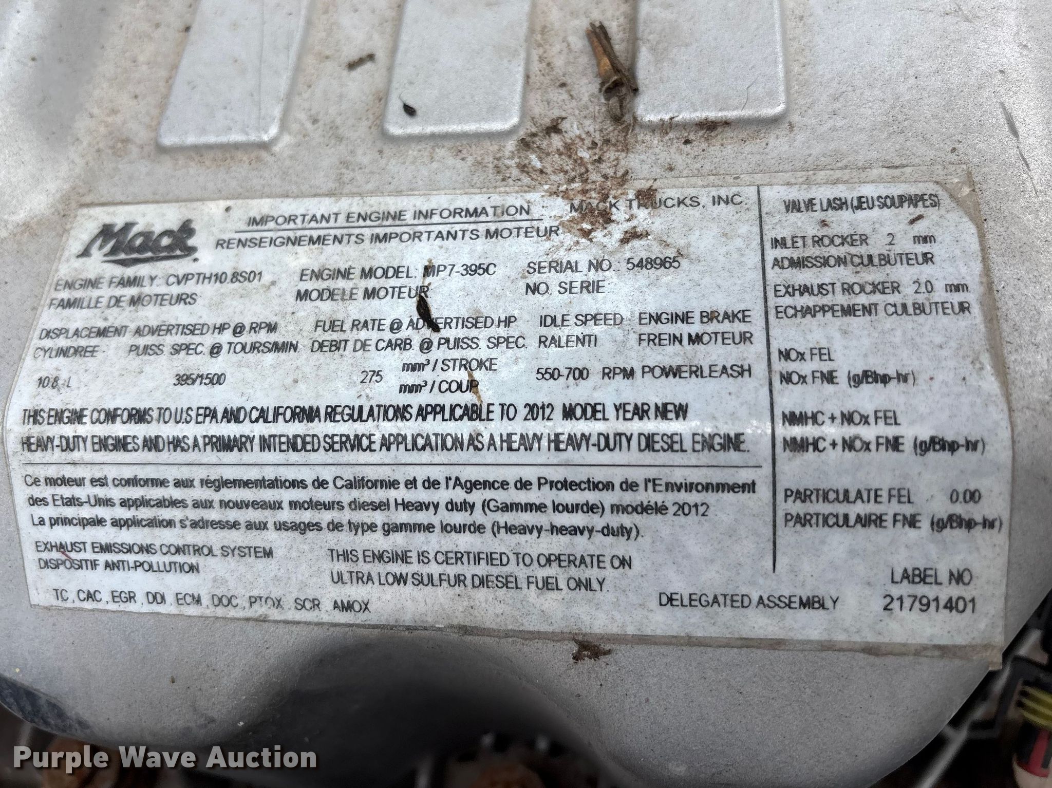 2013 Mack CXU613 semi truck. Miles: Unknown, VIN: 1M1AW02Y3DM035054. Engine Mack MP7-395C, Displacement: 10.8L, Cylinders: 6, Fuel type: Diesel, HP: 395, Engine brake. Transmission Mack mDrive, Automated manual. Chassis Axles: Tandem, Differential lock: Inter-axle, Suspension: Air, Brakes: Air, GVWR: 52,000 lbs FAWR: 12,000 lbs, RAWR: 40,000 lbs. Interior AC, Heat, Heated mirrors, Power windows, Power locks, Cruise control, Air ride cab. Features Deck plate: Aluminum, Fifth wheel type: Fixed, Fuel tank: Dual. Tires Size: 295/75R22.5. Notes Parts only, Parts missing, Non-operational unit Unit must be towed or hauled. Indiana title. Mileage has not been verified. Odometer discrepancy will be marked on the title. Title distribution may be delayed up to 30 days from verification of funds. Standard Forwarding, LLC Strategic Fleet Realignment Sale. Crawfordsville, IN 47933