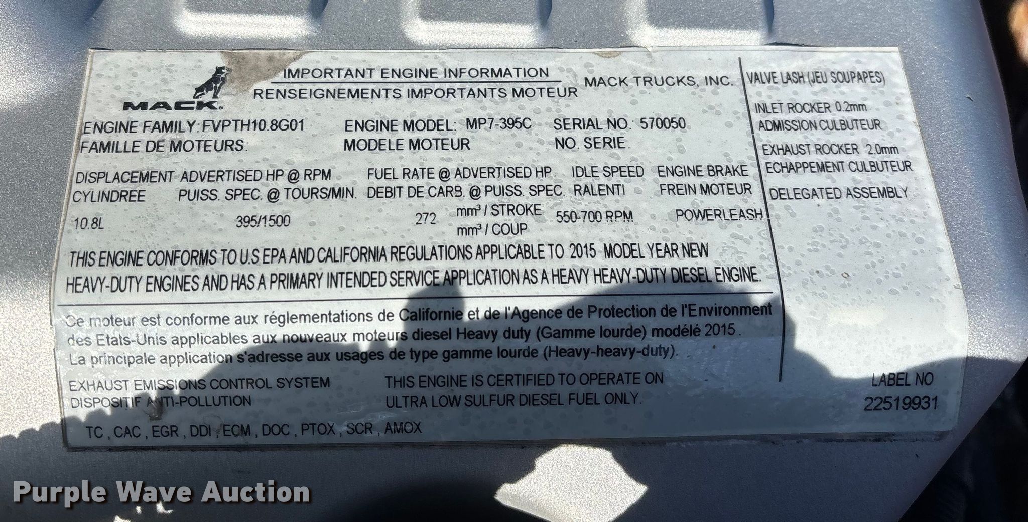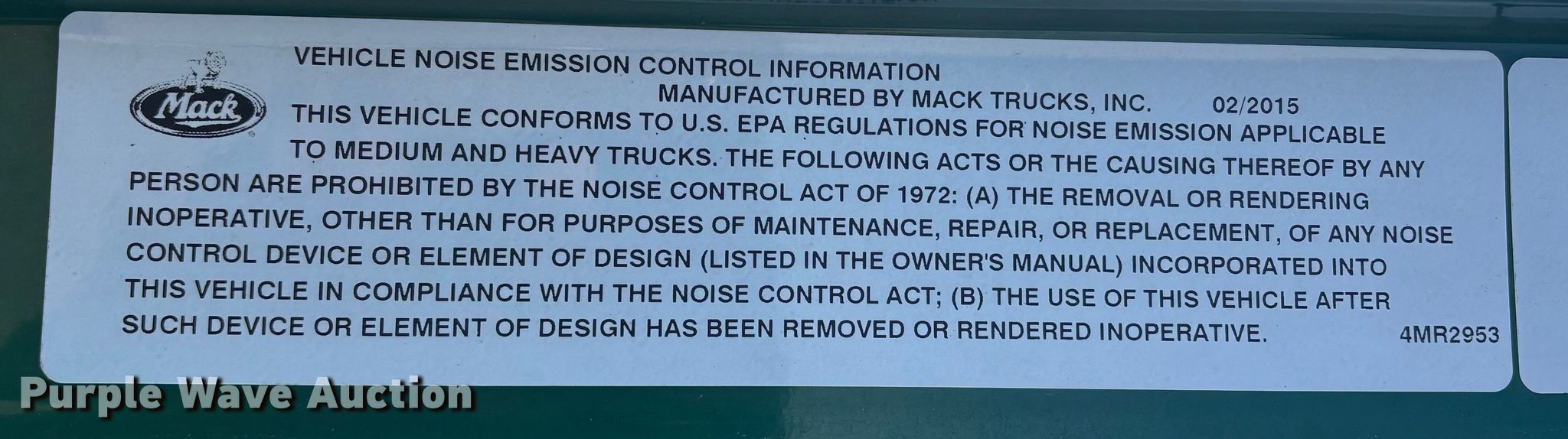 2016 Mack CXU613 semi truck. Miles: Unknown, VIN: 1M1AW02Y8GM053120, Unit #: 687, Lot #: 77415965. Engine Mack MP7, Displacement: 10.8L, Cylinders: 6, Fuel type: Diesel, HP: 395, Engine brake. Transmission Automated manual. Chassis Axles: Tandem, Suspension: Air, Brakes: Air, GVWR: 52,000 lbs FAWR: 12,000 lbs, IAWR: 20,000 lbs, RAWR: 20,000 lbs, Wheelbase: 162". Interior Air ride cab. Features Deck plate: Aluminum, Fifth wheel type: Fixed, Fuel tank: Dual. Tires Size: 295/75R22.5. Notes Dash disassembled, Tires missing, Dead battery, Turbo disconnected, Non-operational unit Unit must be towed or hauled. Fleet realignment, stored at a secured facility. Please review REQUIRED REMOVAL INSTRUCTIONS. Indiana title. Mileage has not been verified. Odometer discrepancy will be marked on the title. Title distribution may be delayed up to 30 days from verification of funds. Standard Forwarding, LLC Strategic Fleet Realignment Sale. Big Lake, MN 55309