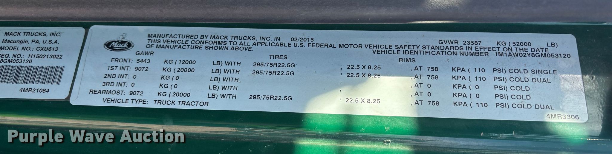 Purple Wave is selling a used Truck Tractor in Minnesota. This item is a 2016 Mack CXU613 semi truck with the following: Miles: Unknown, VIN: 1M1AW02Y8GM053120, Unit #: 687, Lot #: 77415965