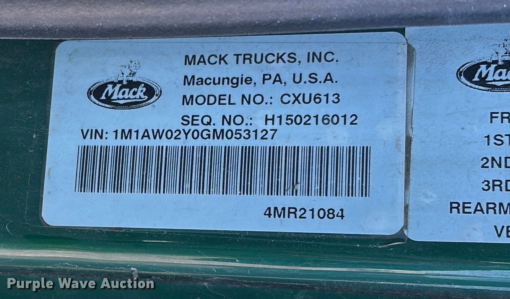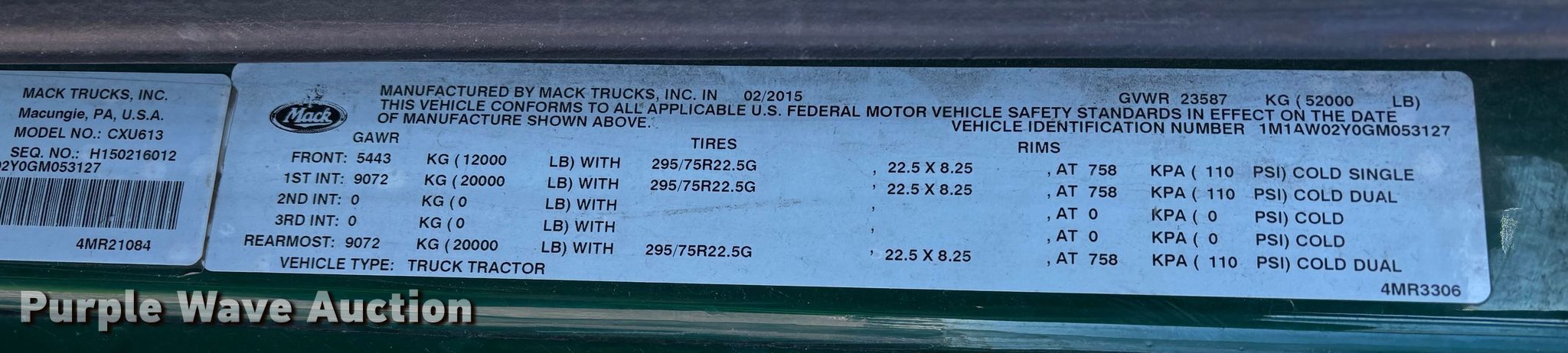 Purple Wave is selling a used Truck Tractor in Minnesota. This item is a 2016 Mack CXU613 semi truck with the following: Miles: 468,422 on odometer, Hours: 17,123 on meter, Miles or hours may vary, unit still in use, VIN: 1M1AW02Y0GM053127, Lot #: 77416485