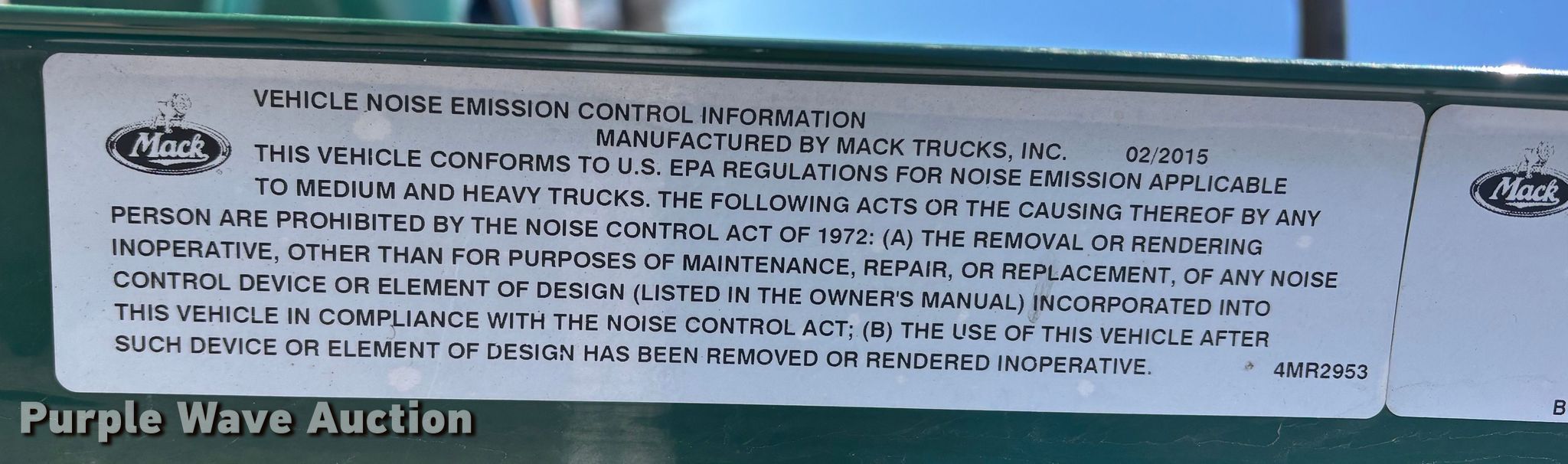 2016 Mack CXU613 semi truck. Miles: 468,422 on odometer, Hours: 17,123 on meter, Miles or hours may vary, unit still in use, VIN: 1M1AW02Y0GM053127, Lot #: 77416485. Engine Mack MP7, Displacement: 10.8L, Cylinders: 6, Fuel type: Diesel, HP: 395, Engine brake. Transmission Mack mDrive, Automated manual. Chassis Axles: Tandem, Differential lock: Inter-axle, Suspension: Air, Brakes: Air, GVWR: 52,000 lbs FAWR: 12,000 lbs, IAWR: 20,000 lbs, RAWR: 20,000 lbs, Wheelbase: 162". Interior AC, Heat, Heated mirrors, Cruise control, Air ride cab, Brake controller. Features Deck plate: Aluminum, Fifth wheel type: Fixed, Fuel tank: Dual. Tires Size: 295/75R22.5. Notes Dash warning indicator: Check engine, Electrical Malfunction, Air ride cab airbag removed but included, Jump start required during on-site data collection. Fleet realignment, stored at a secured facility. Please review REQUIRED REMOVAL INSTRUCTIONS. Titles will be distributed after confirmation of payment and removal. Indiana title. Title distribution may be delayed up to 30 days from verification of funds. Standard Forwarding, LLC Strategic Fleet Realignment Sale. Big Lake, MN 55309