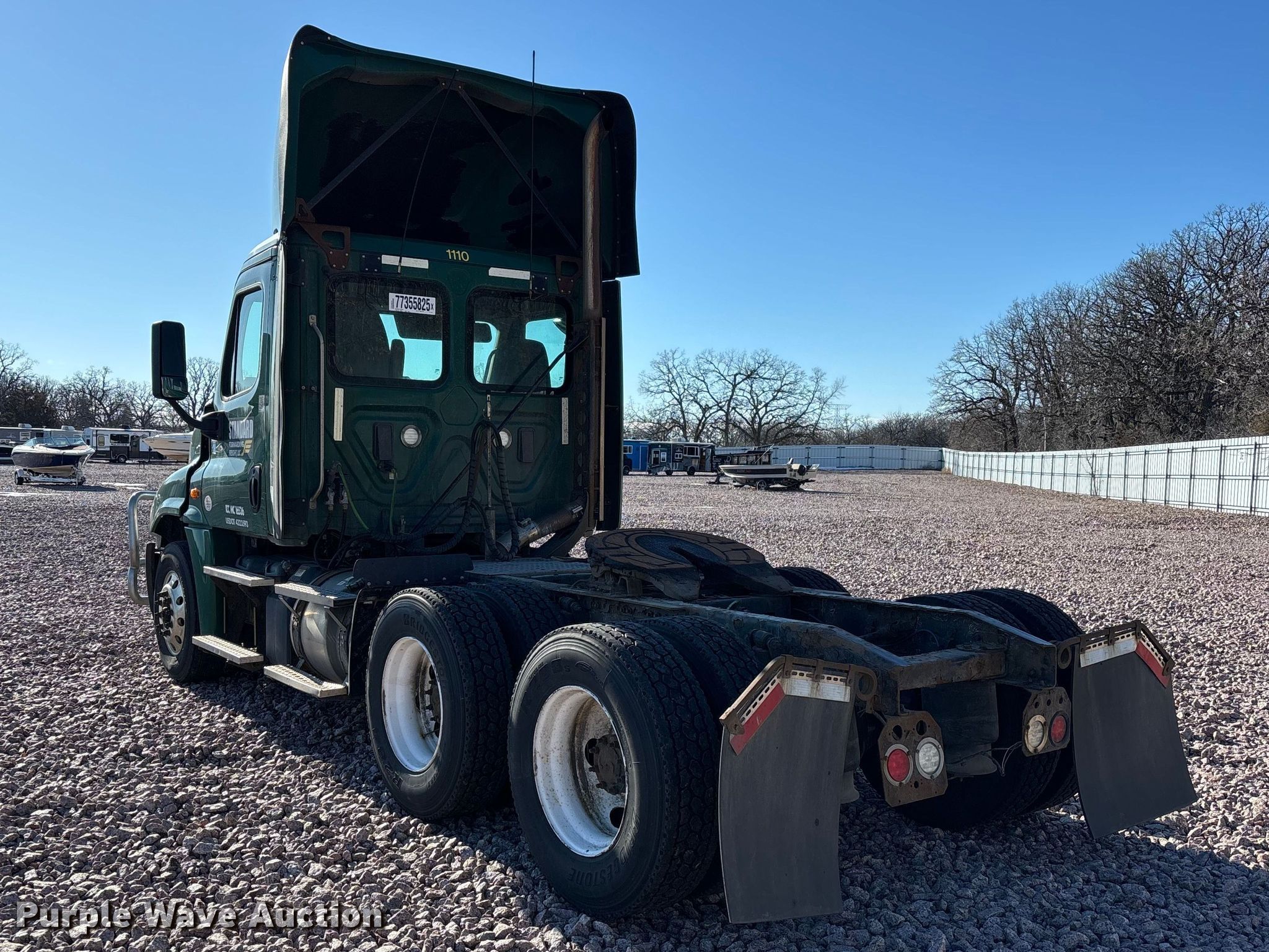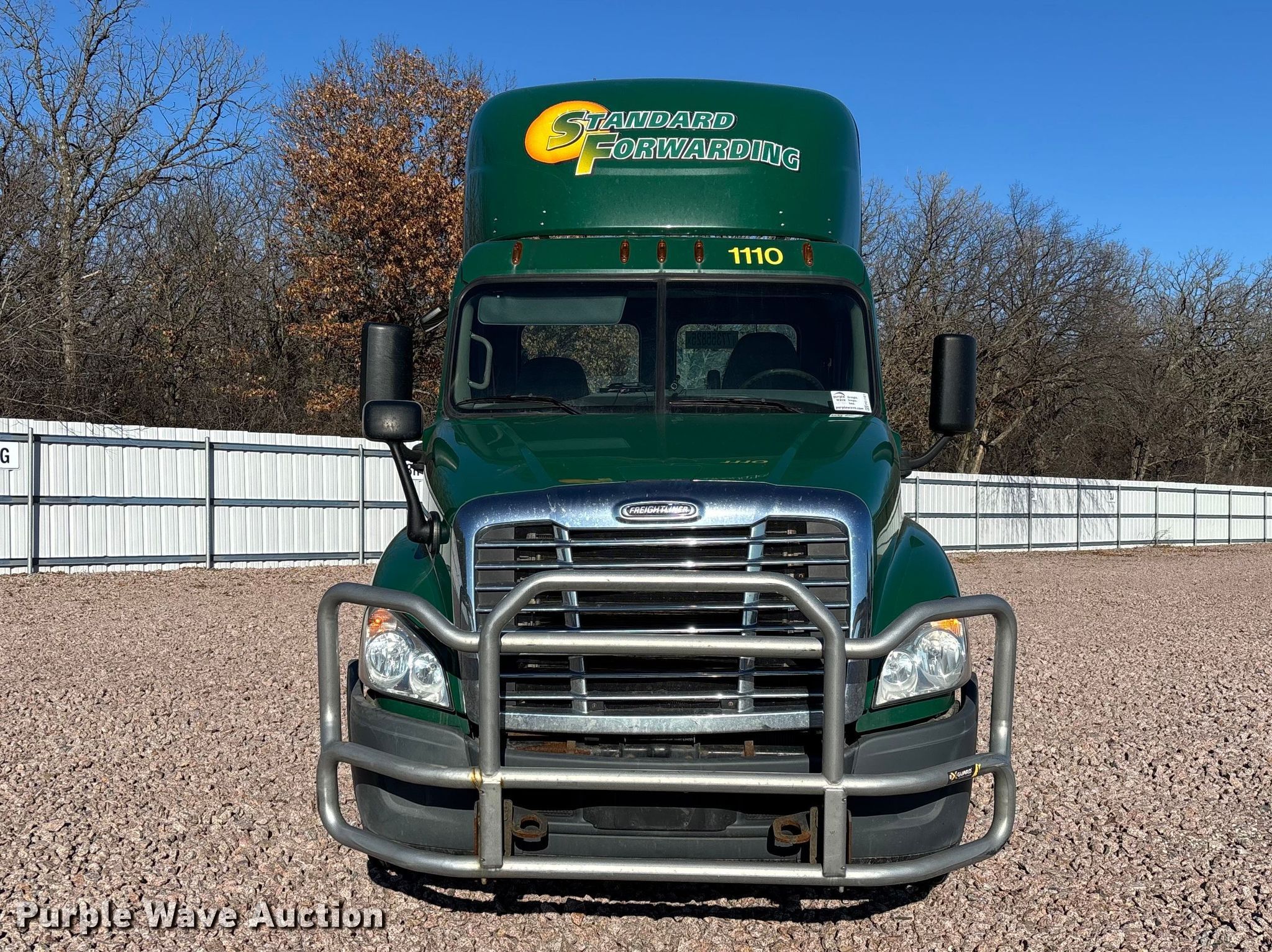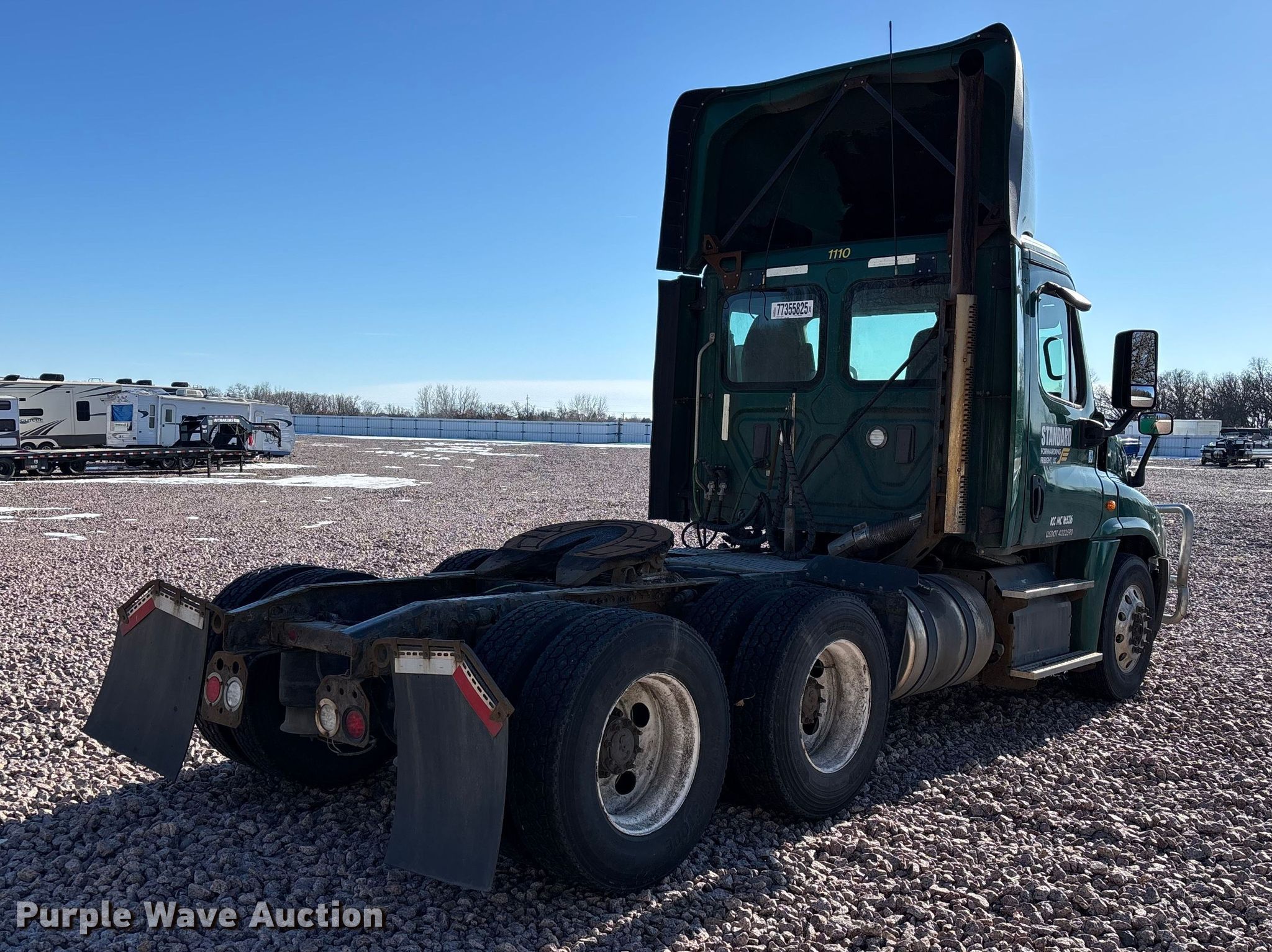 2017 Freightliner Cascadia 125 semi truck. Miles: 856,057 on odometer, VIN: 1FUJGEDV1HLJF8901, Unit #: 1110, Lot #: 77355825. Engine Detroit Diesel DD13, Displacement: 12.8L, Cylinders: 6, Fuel type: Diesel, HP: 410, Engine brake. Transmission Detroit DT12-DB-1550, Automated manual. Chassis Axles: Tandem, Gear ratio: 2.41, Differential lock: Inter-axle, Suspension: Air Dump valves, Brakes: Air, GVWR: 52,000 lbs FAWR: 12,000 lbs, IAWR: 20,000 lbs, RAWR: 20,000 lbs, Wheelbase: 174". Interior AC, Heat, Heated mirrors, Power windows, Cruise control, Air ride cab, Brake controller. Features Deck plate: Aluminum, Fifth wheel type: Fixed, Fuel tank: Dual. Notes Dash warning indicator: Check engine, Jump start required during on-site data collection. Fleet realignment, stored at a secured facility. Please review REQUIRED REMOVAL INSTRUCTIONS. Titles will be distributed after confirmation of payment and removal. Indiana title. Title distribution may be delayed up to 30 days from verification of funds. Standard Forwarding, LLC Strategic Fleet Realignment Sale. Big Lake, MN 55309