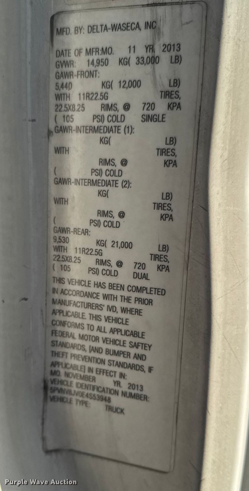 2014 Hino 338 box truck. Miles: 241,451 on odometer, VIN: 5PVNV8JV0E4S53948, Unit #: 637, Lot #: 76479285. Engine Hino Motors J08E-VC/VB, Displacement: 7.6L, Fuel type: Diesel. Transmission Automatic. Chassis Axles: Single, Suspension: Spring, Brakes: Air, GVWR: 33,000 lbs. Interior AC, Heat, Power windows, Power locks, Cruise control. Features Bed Box bed, Waseca QX-97-26-102, Serial: 98106, Length: 26', Width: 102", E-track rail system, Floor: Wood, End gate lift. Tires Size: 295/75R22.5. Notes Key not included, Unit must be towed or hauled , Non-operational unit. Fleet inventory reduction, stored at a secured facility. Please review REQUIRED REMOVAL INSTRUCTIONS. Titles will be distributed after confirmation of payment and removal. Indiana title. Title distribution may be delayed up to 30 days from verification of funds. Standard Forwarding, LLC Strategic Fleet Realignment Sale. Bartlett, IL 60103