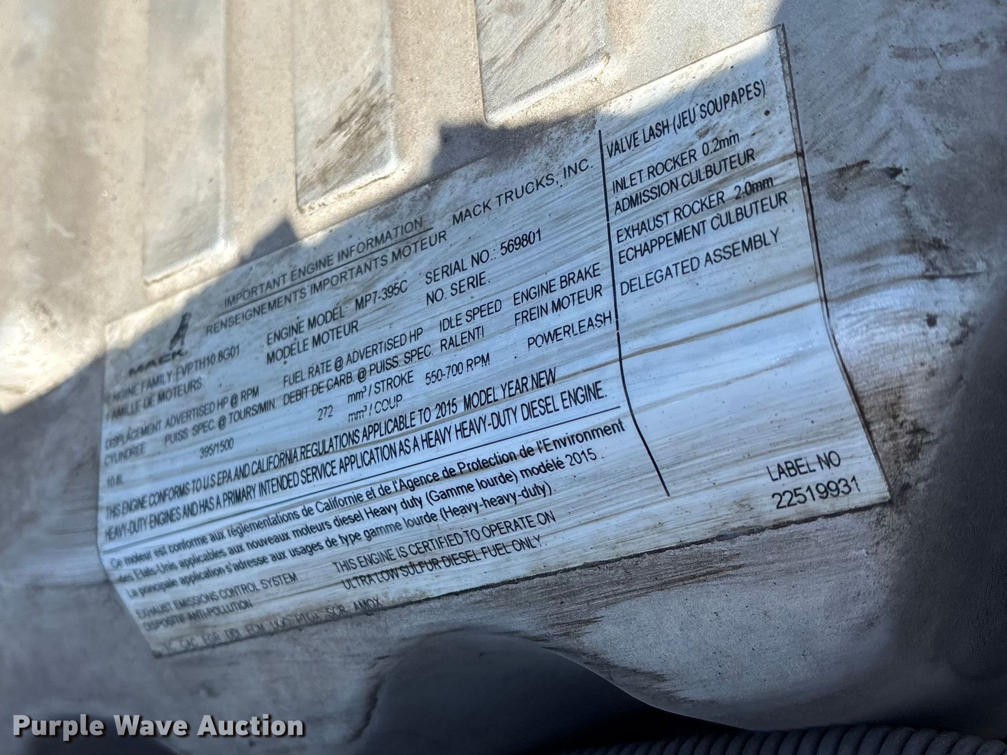 2016 Mack CXU613 semi truck. Miles: 361,515 on odometer, VIN: 1M1AW02Y4GM053079. Engine Mack MP-7, Serial: 569801, Displacement: 10.8L, Cylinders: 6, Fuel type: Diesel, HP: 335. Transmission Mack mDrive, Automated manual. Chassis Axles: Tandem, Differential lock: Inter-axle, Suspension: Air, Brakes: Air, GVWR: 12,000 lbs IAWR: 20,000 lbs, RAWR: 20,000 lbs, Wheelbase: 162". Interior AC, Heat, Air ride cab. Features Deck plate: Aluminum, Fifth wheel type: Fixed, Fuel tank: Dual. Tires Size: 295/75R22.5. Notes Hood shocks and springs disconnected, Dash warning indicator: Check engine, Traction control, Transmission air pressure. Fleet realignment, stored at a secured facility. Please review REQUIRED REMOVAL INSTRUCTIONS. Titles will be distributed after confirmation of payment and removal. Indiana title. Title distribution may be delayed up to 30 days from verification of funds. Standard Forwarding, LLC Strategic Fleet Realignment Sale. Elgin, IL 60120