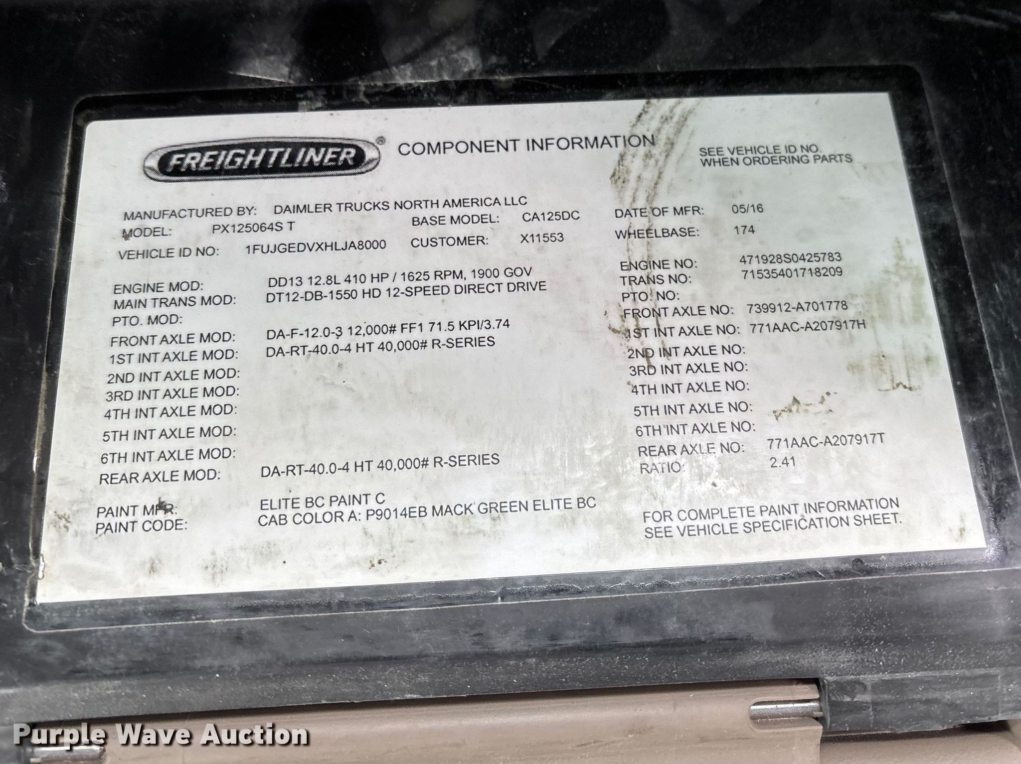 2017 Freightliner Cascadia 125 semi truck. Miles: Unknown, VIN: 1FUJGEDVXHLJA8000, Unit #: 1017. Engine Detroit Diesel DD13, Serial: 471928S0425783, Displacement: 12.8L, Cylinders: 6, Fuel type: Diesel. Transmission Detroit DT12-DB-1550HD, Automated manual, Speed: 12. Chassis Axles: Tandem, Gear ratio: 2.41, Suspension: Air, Brakes: Air, FAWR: 12,000 lbs, RAWR: 40,000 lbs, Wheelbase: 174". Interior AC, Heat, Heated mirrors, Power windows, Power locks, Air ride cab. Features Deck plate: Aluminum, Fifth wheel type: Fixed, Fuel tank: Dual. Tires Size: 295/75R22.5. Notes Interior duals missing, Windshield chipped or cracked, Key not included, Glass broken, Hood hinge broken, Unit must be towed or hauled , Non-operational unit, Unknown operating condition. Fleet realignment, stored at a secured facility. Please review REQUIRED REMOVAL INSTRUCTIONS. Titles will be distributed after confirmation of payment and removal. Indiana title. Mileage has not been verified. Odometer discrepancy will be marked on the title. Title distribution may be delayed up to 30 days from verification of funds. Standard Forwarding, LLC Strategic Fleet Realignment Sale. Elgin, IL 60120