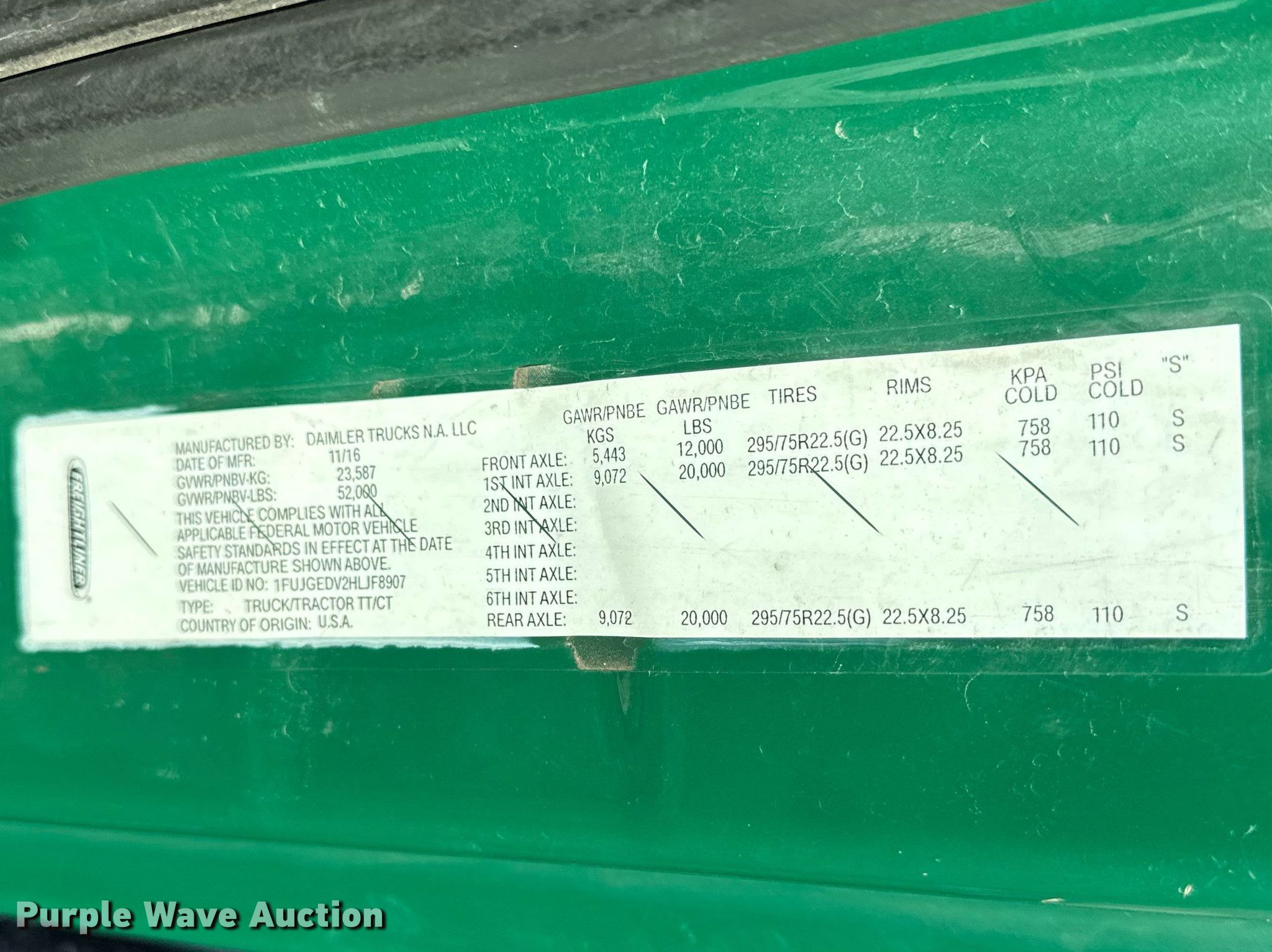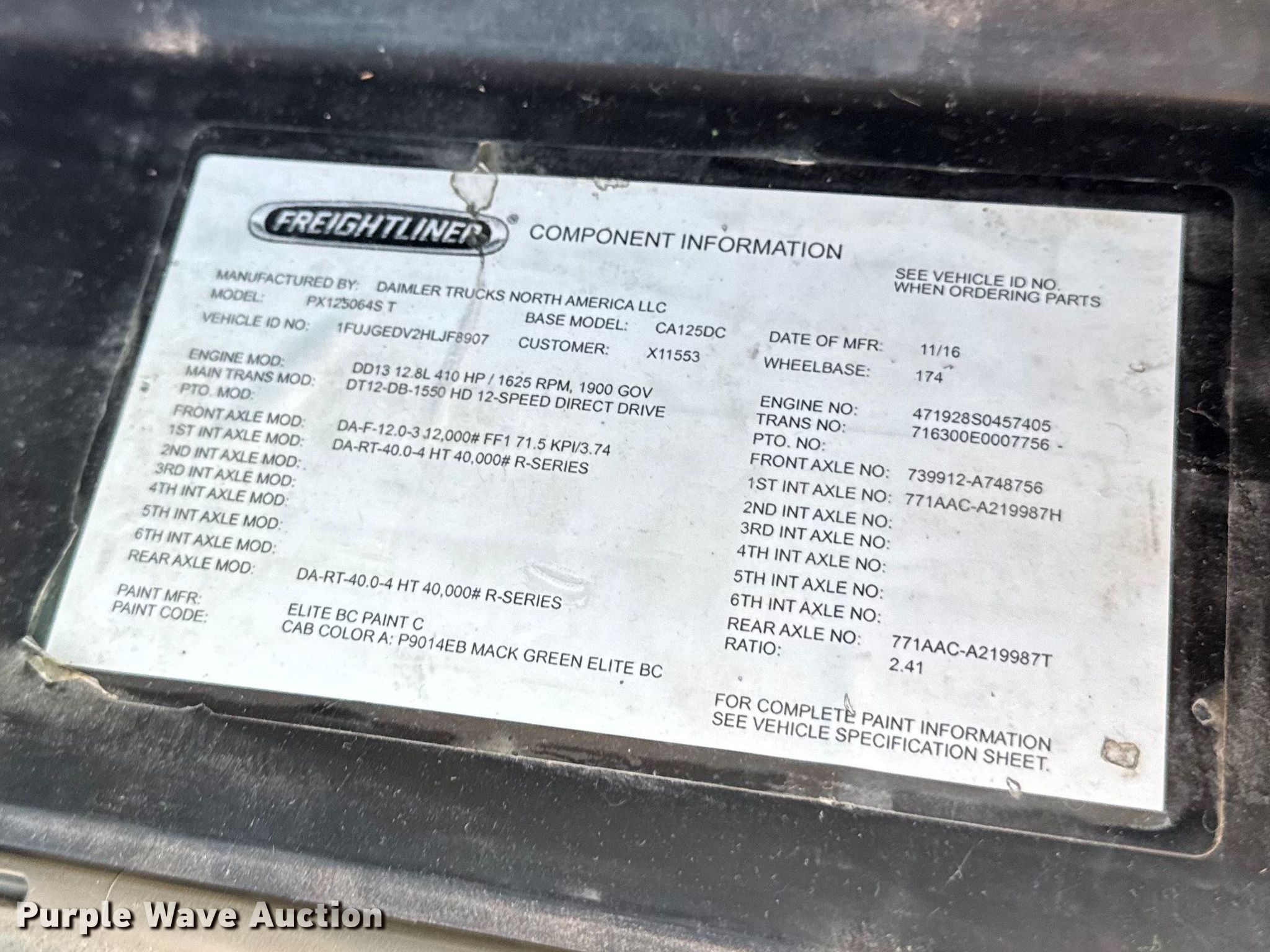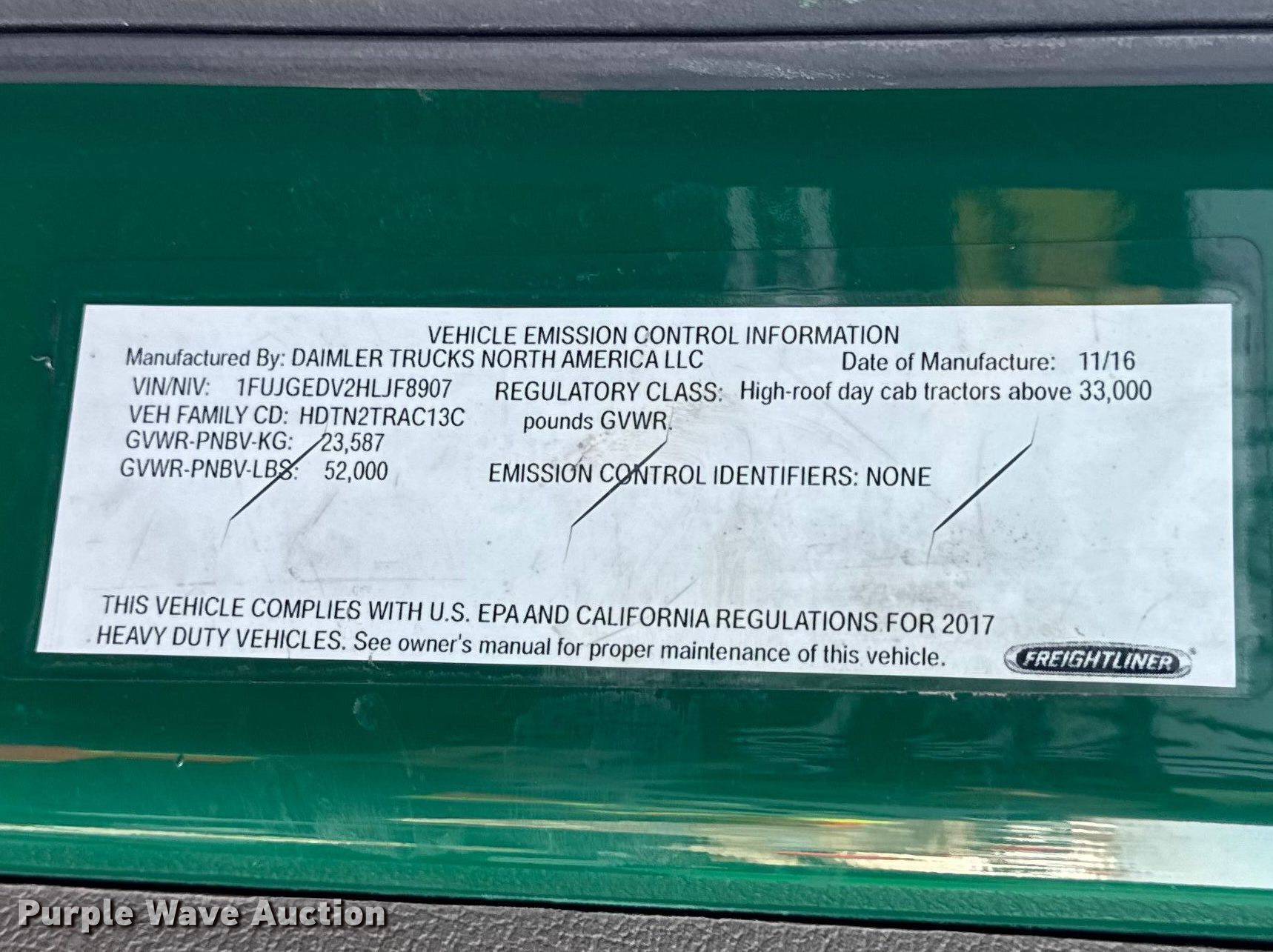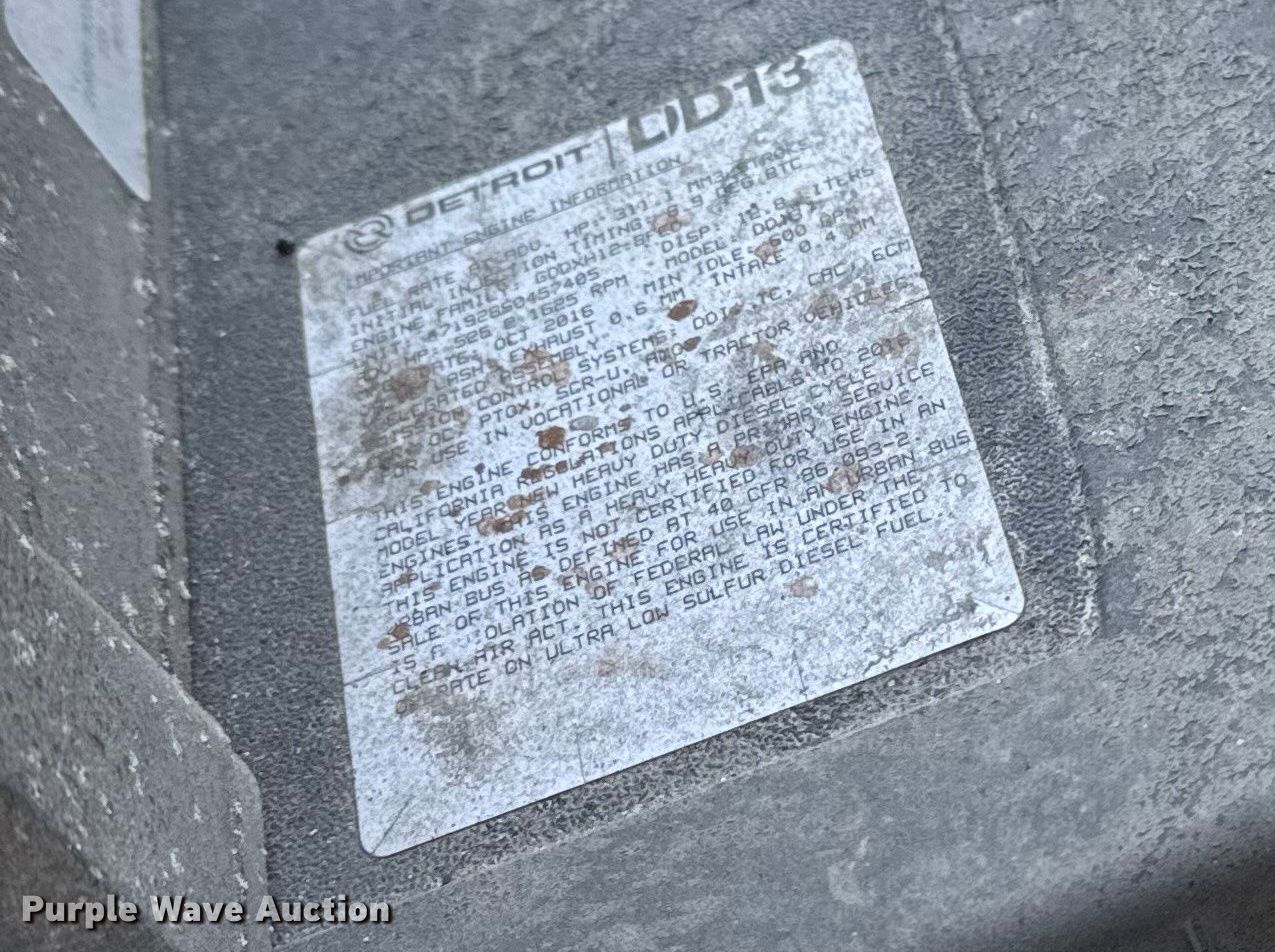 2017 Freightliner Cascadia 125 semi truck. Miles: 760,337 on odometer, VIN: 1FUJGEDV2HLJF8907, Unit #: 1116. Engine Detroit Diesel DD13, Displacement: 12.8L, Cylinders: 6, Fuel type: Diesel, Engine brake. Transmission Detroit DT12-DB-1550HD, Automated manual. Chassis Axles: Tandem, Gear ratio: 2.41, Differential lock: Inter-axle, Suspension: Air Dump valves, Brakes: Air, Truck chassis: 156", GVWR: 52,000 lbs FAWR: 12,000 lbs, IAWR: 20,000 lbs, RAWR: 20,000 lbs, Wheelbase: 144". Interior AC, Heat, Heated mirrors, Power windows, Power locks, Cruise control, Air ride cab. Features Deck plate: Aluminum, Fifth wheel type: Fixed, Fuel tank: Dual. Tires Size: 295/75R22.5. Notes Unit must be towed or hauled , Non-operational unit. Fleet realignment, stored at a secured facility. Please review REQUIRED REMOVAL INSTRUCTIONS. Titles will be distributed after confirmation of payment and removal. Indiana title. Title distribution may be delayed up to 30 days from verification of funds. Standard Forwarding, LLC Strategic Fleet Realignment Sale. Elgin, IL 60120