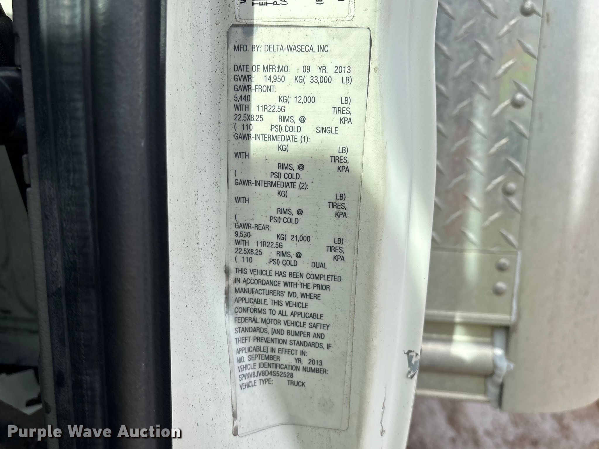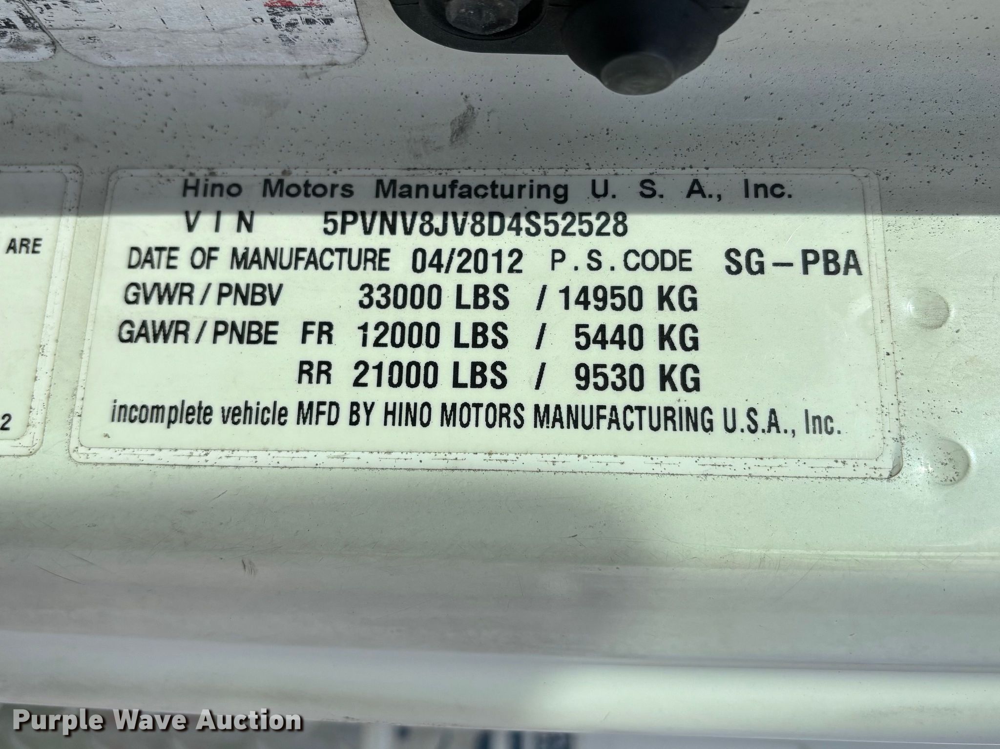 2013 Hino 338 box truck. Miles: 214,549 on odometer, VIN: 5PVNV8JV8D4S52528, Unit #: 636, Lot #: 77074425. Engine Hino Motors J08E-VC/VB, Displacement: 7.6L, Cylinders: 6, Fuel type: Diesel. Transmission Automatic. Chassis Axles: Single, Suspension: Air, Brakes: Air, GVWR: 33,000 lbs, Wheelbase: 270". Interior AC, Heat, Heated mirrors, Cruise control. Features Bed Box bed, Delta-Waseca QX-97-26-102, Serial: 98105, Length: 26', Width: 102", Height: 97", E-track rail system, Floor: Wood, End gate lift, Anthony Liftgates MTU GLR 4, Capacity: 4,000 lbs. Tires Size: 295/75R22.5. Notes Jump start required during on-site data collection. Fleet inventory reduction, stored at a secured facility. Please review REQUIRED REMOVAL INSTRUCTIONS. Titles will be distributed after confirmation of payment and removal. Indiana title. Title distribution may be delayed up to 30 days from verification of funds. Standard Forwarding, LLC Strategic Fleet Realignment Sale. Milwaukee, WI 53224