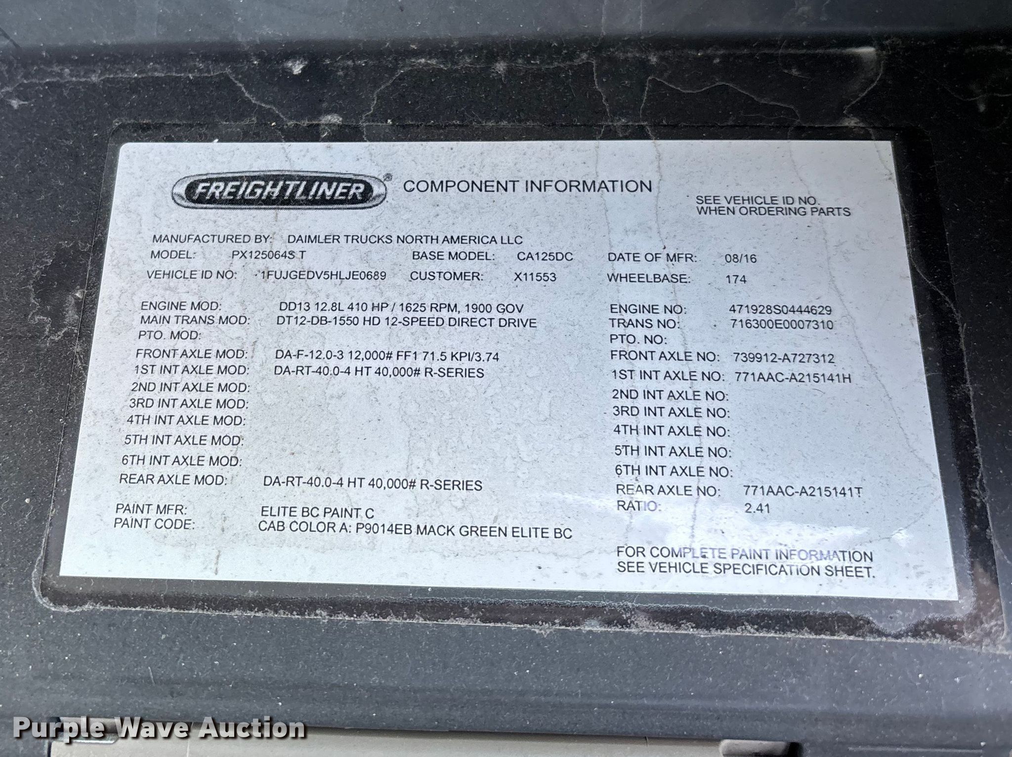2017 Freightliner Cascadia 125 semi truck. Miles: Unknown, VIN: 1FUJGEDV5HLJE0689, Unit #: 1052, Lot #: 41951816. Engine Detroit Diesel DD13, Displacement: 12.8L, Cylinders: 6, Fuel type: Diesel, HP: 410, Engine brake. Transmission Detroit DT12-DB-1550, Automated manual, Speed: 12. Chassis Axles: Tandem, Gear ratio: 2.41, Differential lock: Inter-axle, Suspension: Air, Brakes: Air, GVWR: 52,000 lbs FAWR: 12,000 lbs, IAWR: 20,000 lbs, RAWR: 20,000 lbs, Wheelbase: 174". Interior Heated mirrors, Power windows, Cruise control, Air ride cab, Brake controller. Features Deck plate: Steel, Fifth wheel type: Fixed, Fuel tank: Dual. Tires Size: 295/75R22.5. Notes Tires missing, Key not included, Unit must be towed or hauled , Non-operational unit. Fleet inventory reduction, stored at a secured facility. Please review REQUIRED REMOVAL INSTRUCTIONS. Titles will be distributed after confirmation of payment and removal. Indiana title. Mileage has not been verified. Odometer discrepancy will be marked on the title. Title distribution may be delayed up to 30 days from verification of funds. Standard Forwarding, LLC Strategic Fleet Realignment Sale. Milwaukee, WI 53224