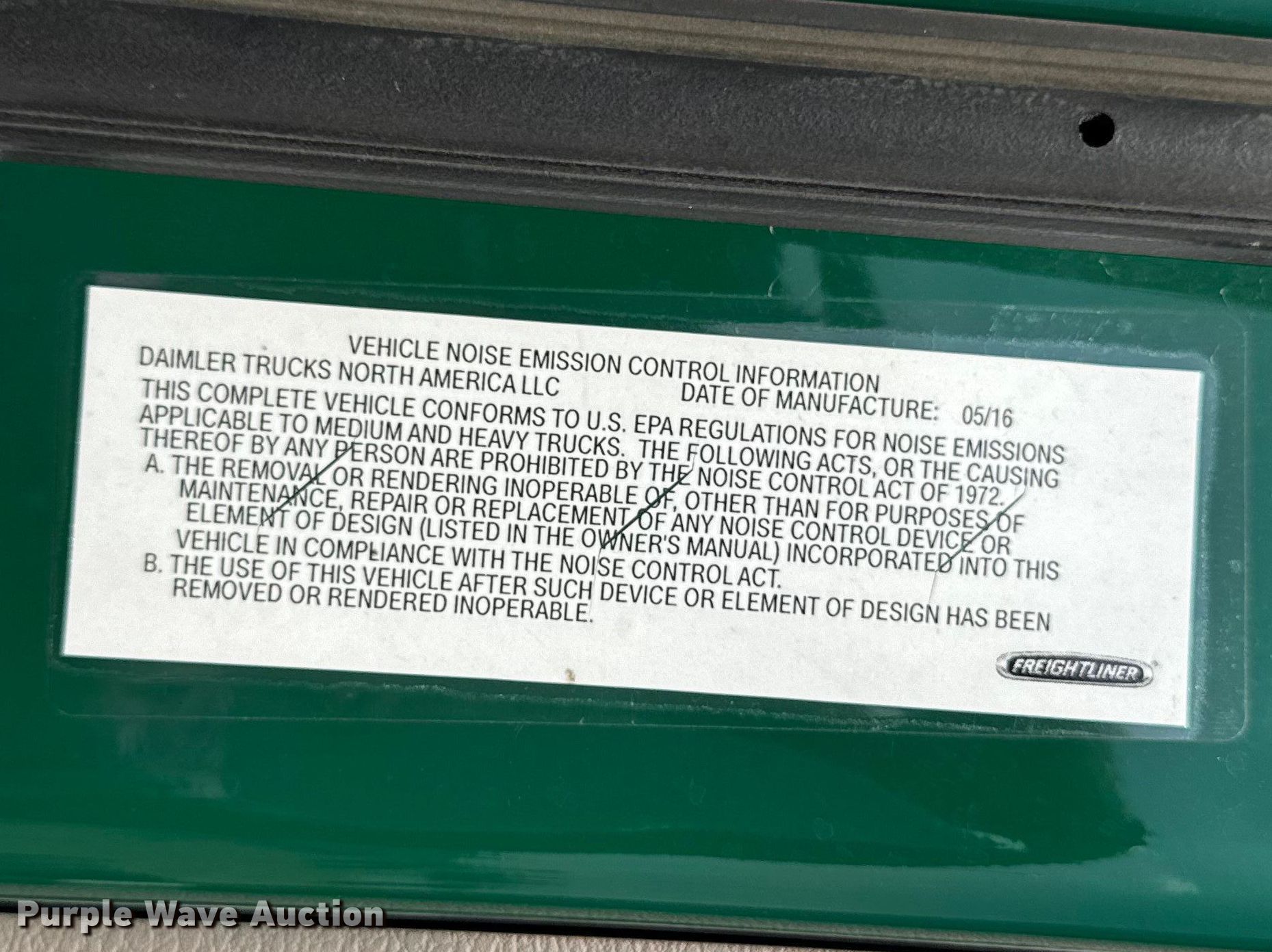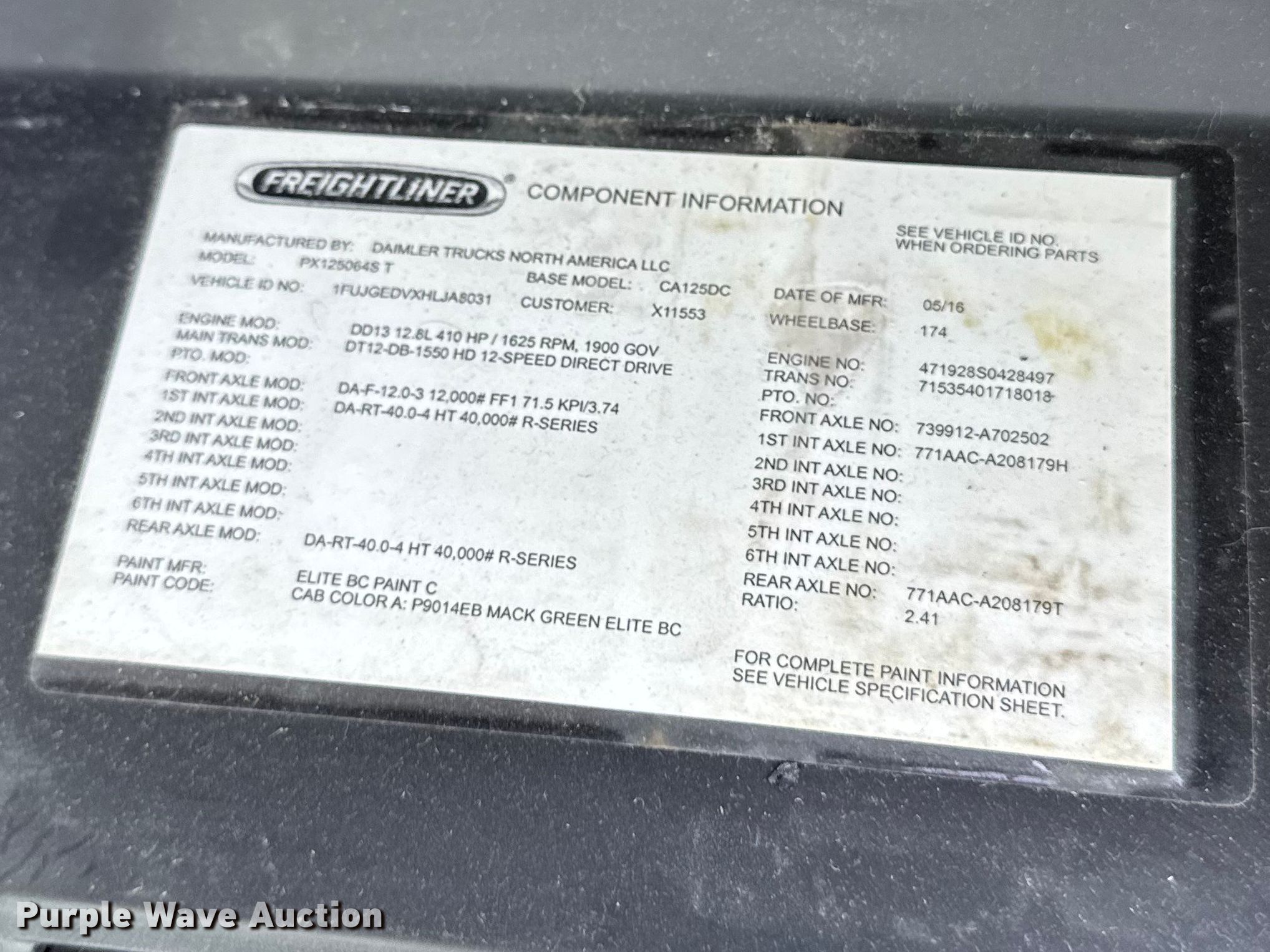 2017 Freightliner Cascadia 125 semi truck. Miles: 754,765 on odometer, VIN: 1FUJGEDVXHLJA8031, Unit #: 1048, Copart lot #: 76851825. Engine Detroit Diesel DD13, Displacement: 12.8L, Cylinders: 6, Fuel type: Diesel. Transmission Detroit DT12-DB-1550 HD, Automated manual. Chassis Axles: Tandem, Gear ratio: 2.41, Differential lock: Inter-axle, Suspension: Air Dump valves, Brakes: Air, GVWR: 52,000 lbs FAWR: 12,000 lbs, IAWR: 20,000 lbs, RAWR: 20,000 lbs, Wheelbase: 174". Interior AC, Heat, Heated mirrors, Power windows, Power locks, Cruise control, Air ride cab, Brake controller. Features Deck plate: Aluminum, Fifth wheel type: Fixed, Fuel tank: Dual. Tires Size: 295/75R22.5. Notes Dash warning indicator: Check engine, Electrical system problem detected, Jump start required during on-site data collection. Fleet realignment, stored at a secured facility. Please review REQUIRED REMOVAL INSTRUCTIONS. Indiana title. Title distribution may be delayed up to 30 days from verification of funds. Standard Forwarding, LLC Strategic Fleet Realignment Sale. Dyer, IN 46311