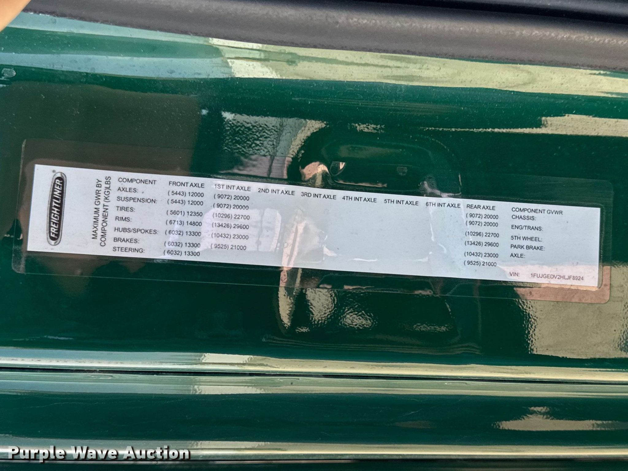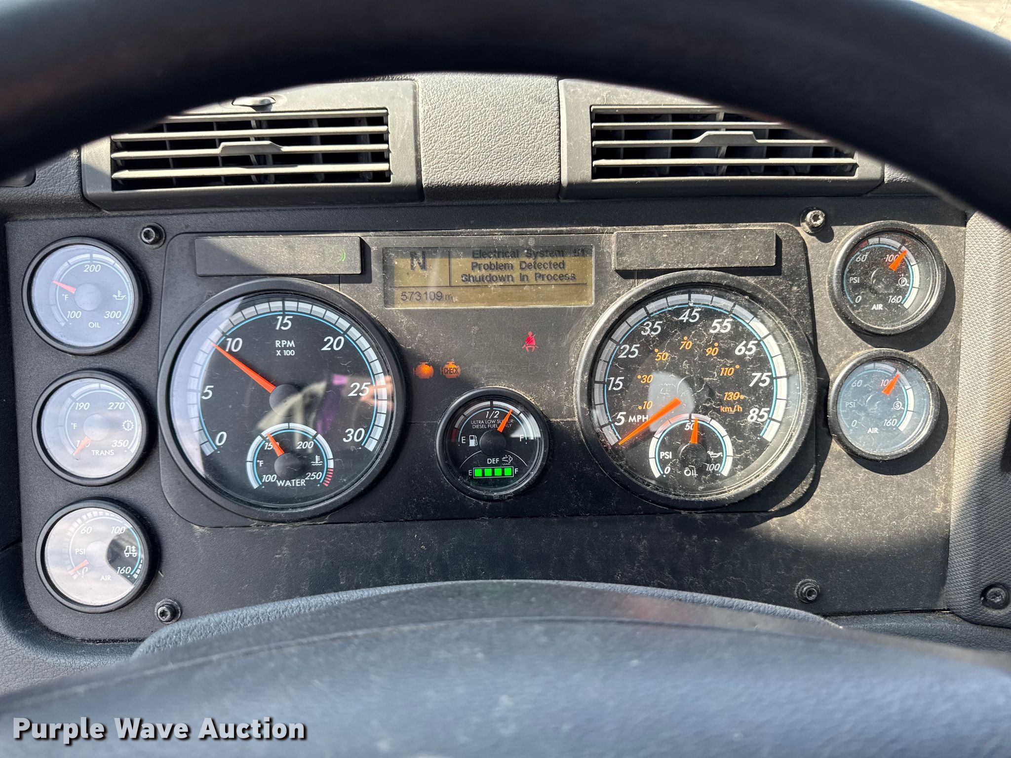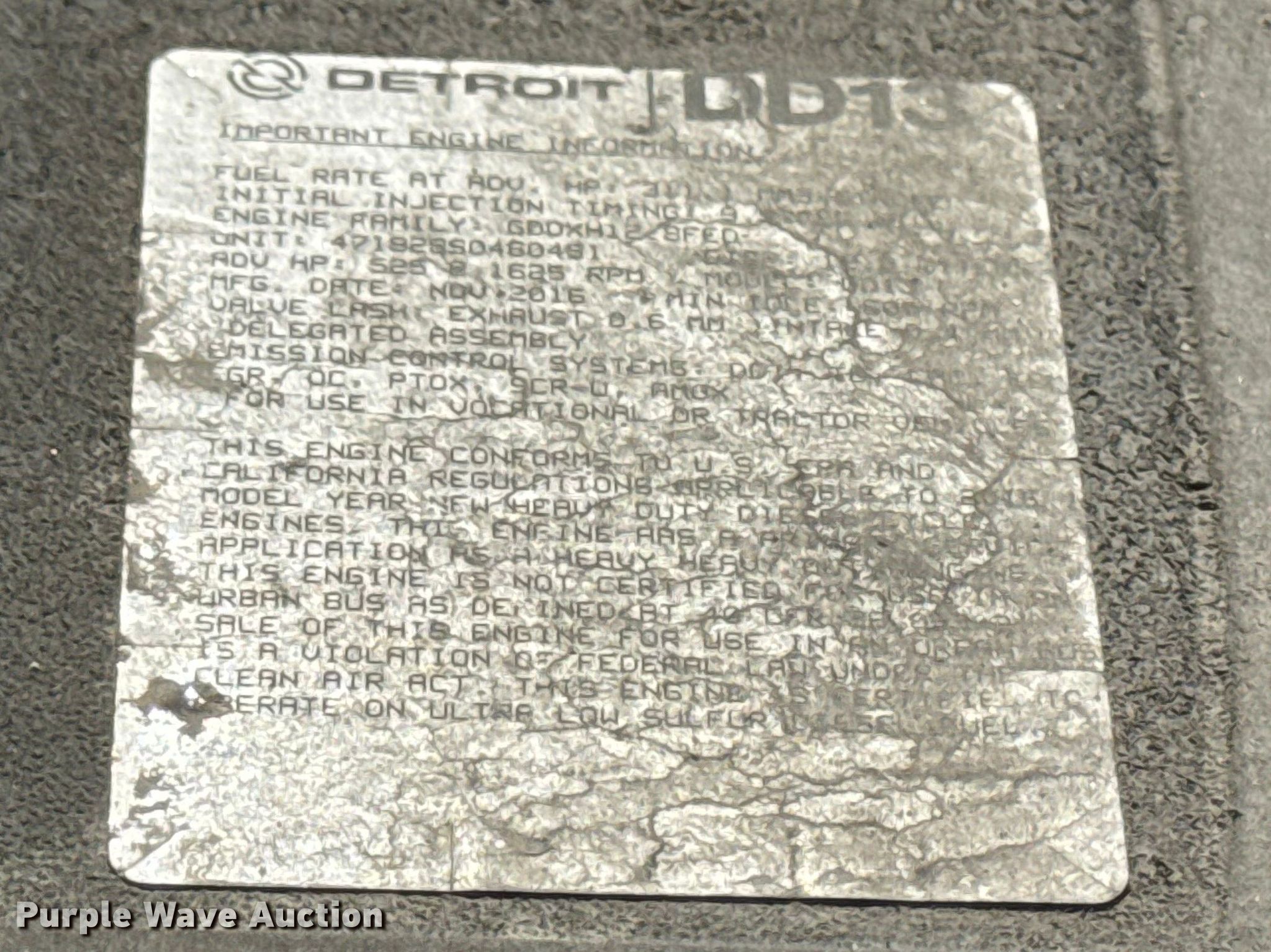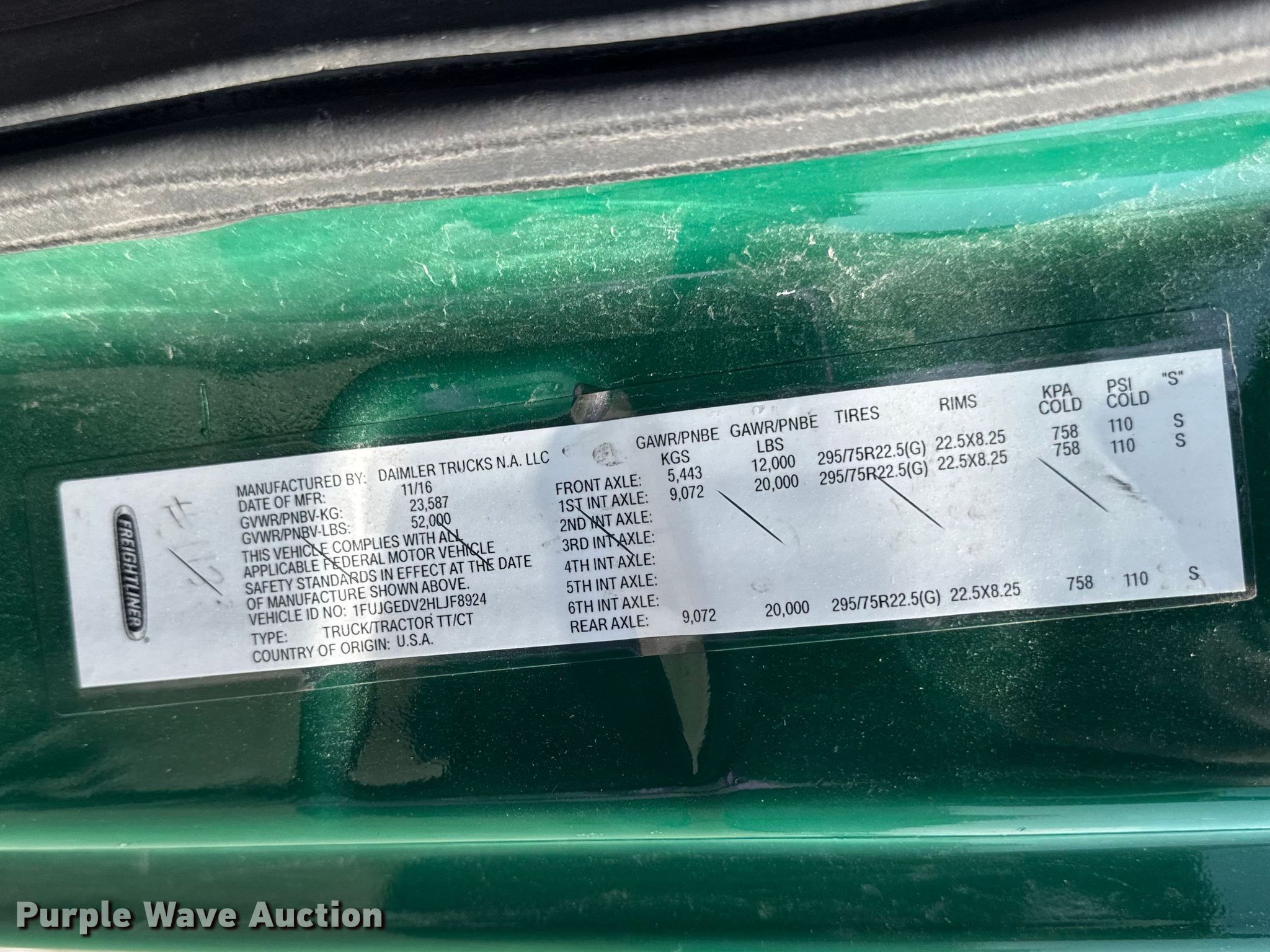 2017 Freightliner Cascadia 125 semi truck. Miles: 573,109 on odometer, VIN: 1FUJGEDV2HLJF8924, Unit #: 1133, Copart lot #: 76854275. Engine Detroit Diesel DD13, Displacement: 12.8L, Cylinders: 6, Fuel type: Diesel, Engine brake. Transmission Detroit DT12-DB-1550 HD, Automated manual. Chassis Axles: Tandem, Gear ratio: 2.41, Differential lock: Inter-axle, Suspension: Air Dump valves, Brakes: Air, GVWR: 52,000 lbs FAWR: 12,000 lbs, IAWR: 20,000 lbs, RAWR: 20,000 lbs, Wheelbase: 174". Interior AC, Heat, Heated mirrors, Power windows, Power locks, Cruise control, Air ride cab, Brake controller. Features Deck plate: Aluminum, Fifth wheel type: Fixed, Fuel tank: Dual. Tires Size: 295/75R22.5. Notes Dash warning indicator: Check engine, Electrical system problem detected, Jump start required during on-site data collection, Non-operational driver's side window. Fleet realignment, stored at a secured facility. Please review REQUIRED REMOVAL INSTRUCTIONS. Titles will be distributed after confirmation of payment and removal. Indiana title. Title distribution may be delayed up to 30 days from verification of funds. Standard Forwarding, LLC Strategic Fleet Realignment Sale. Dyer, IN 46311