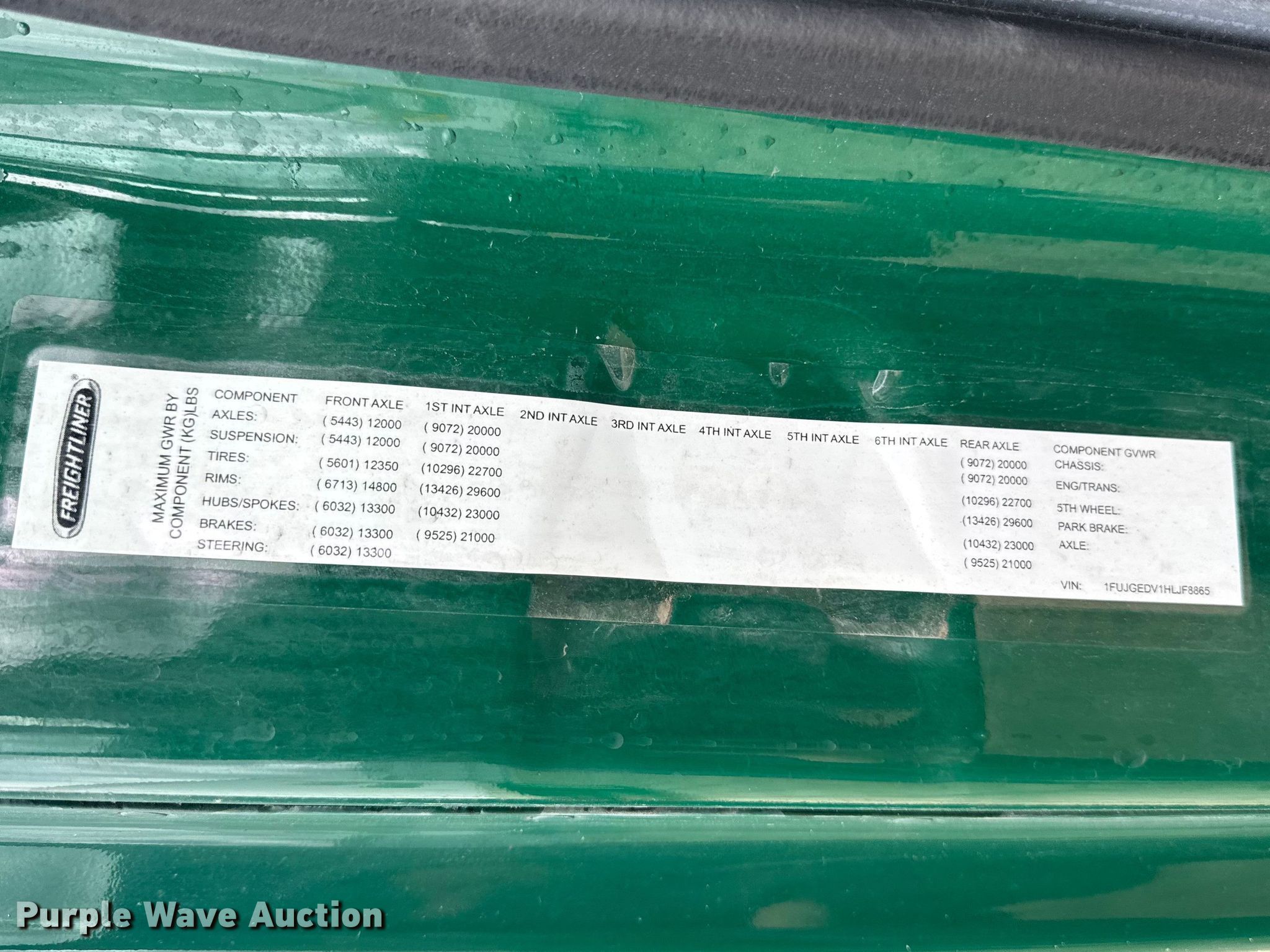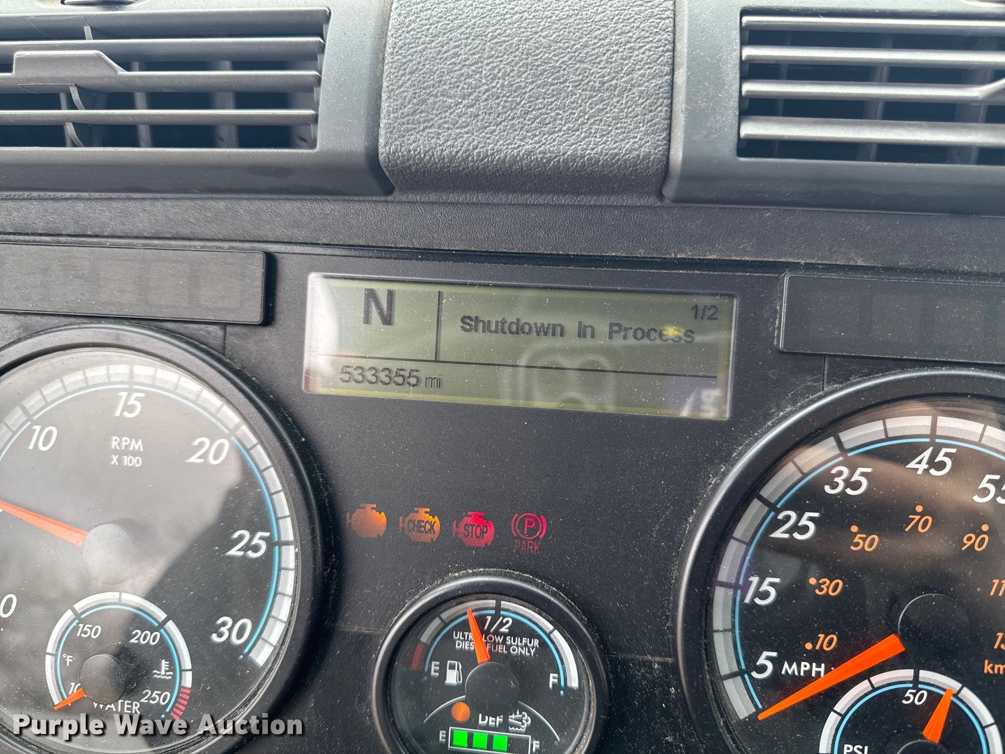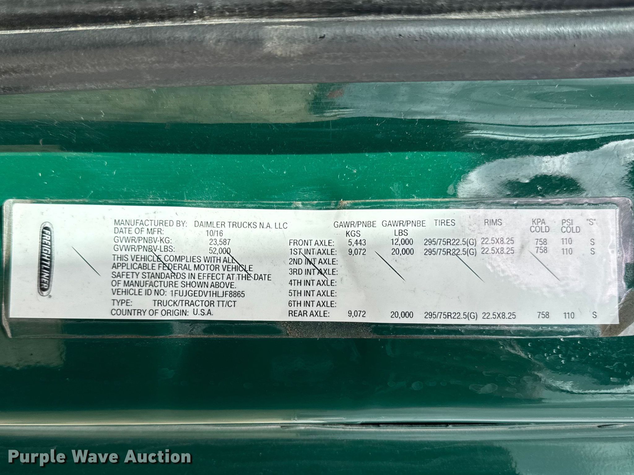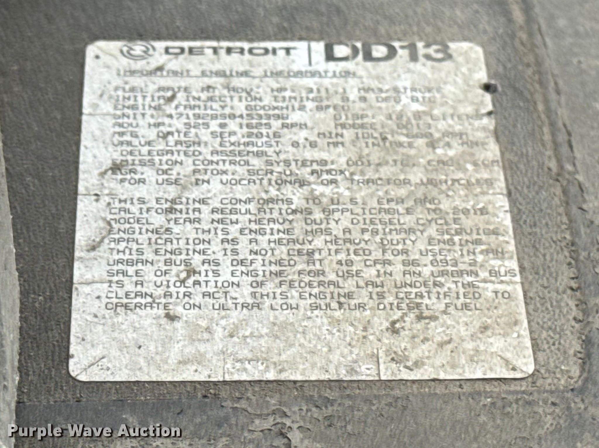 2017 Freightliner Cascadia 125 semi truck. Miles: 533,355 on odometer, VIN: 1FUJGEDV1HLJF8865, Lot #: 77084375. Engine Detroit Diesel DD13, Serial: 47192S0453398, Displacement: 12.8L, Cylinders: 6, Fuel type: Diesel, Engine brake. Transmission Detroit DT12-DB-1550 HD, Automated manual. Chassis Axles: Tandem, Gear ratio: 2.41, Differential lock: Inter-axle, Suspension: Air Dump valves, Brakes: Air, GVWR: 52,000 lbs FAWR: 12,000 lbs, IAWR: 20,000 lbs, RAWR: 20,000 lbs, Wheelbase: 174". Interior AC, Heat, Heated mirrors, Power windows, Power locks, Cruise control, Air ride cab, Brake controller. Features Deck plate: Aluminum, Fifth wheel type: Fixed, Fuel tank: Dual. Tires Size: 295/75R22.5. Notes Dash warning indicator: Check engine, Shutdown in process, Jump start required during on-site data collection, Engine issues, derated Intermittently shuts down. Fleet realignment, stored at a secured facility. Please review REQUIRED REMOVAL INSTRUCTIONS. Indiana title. Title distribution may be delayed up to 30 days from verification of funds. Standard Forwarding, LLC Strategic Fleet Realignment Sale. Cedar Rapids, IA 52404