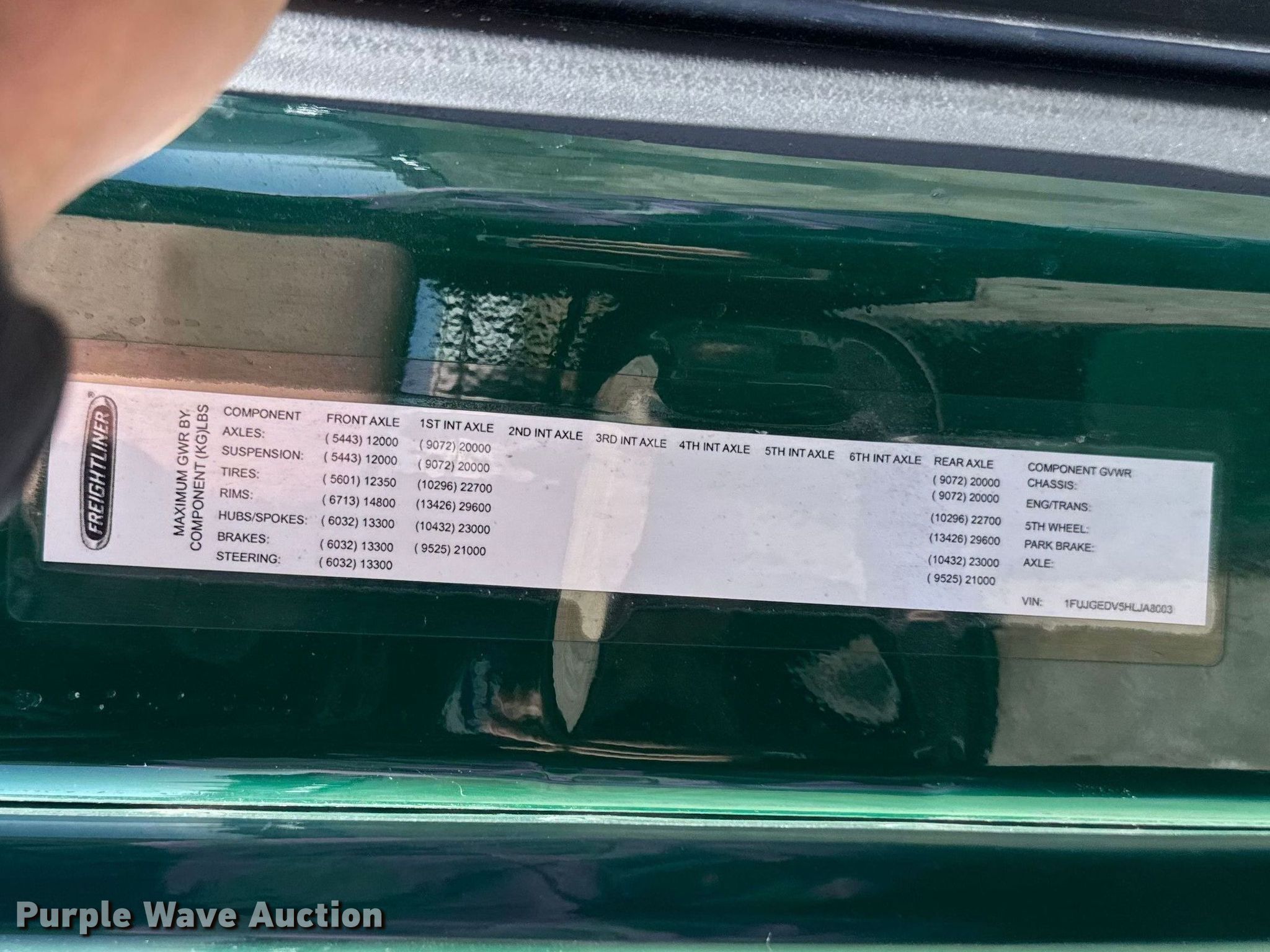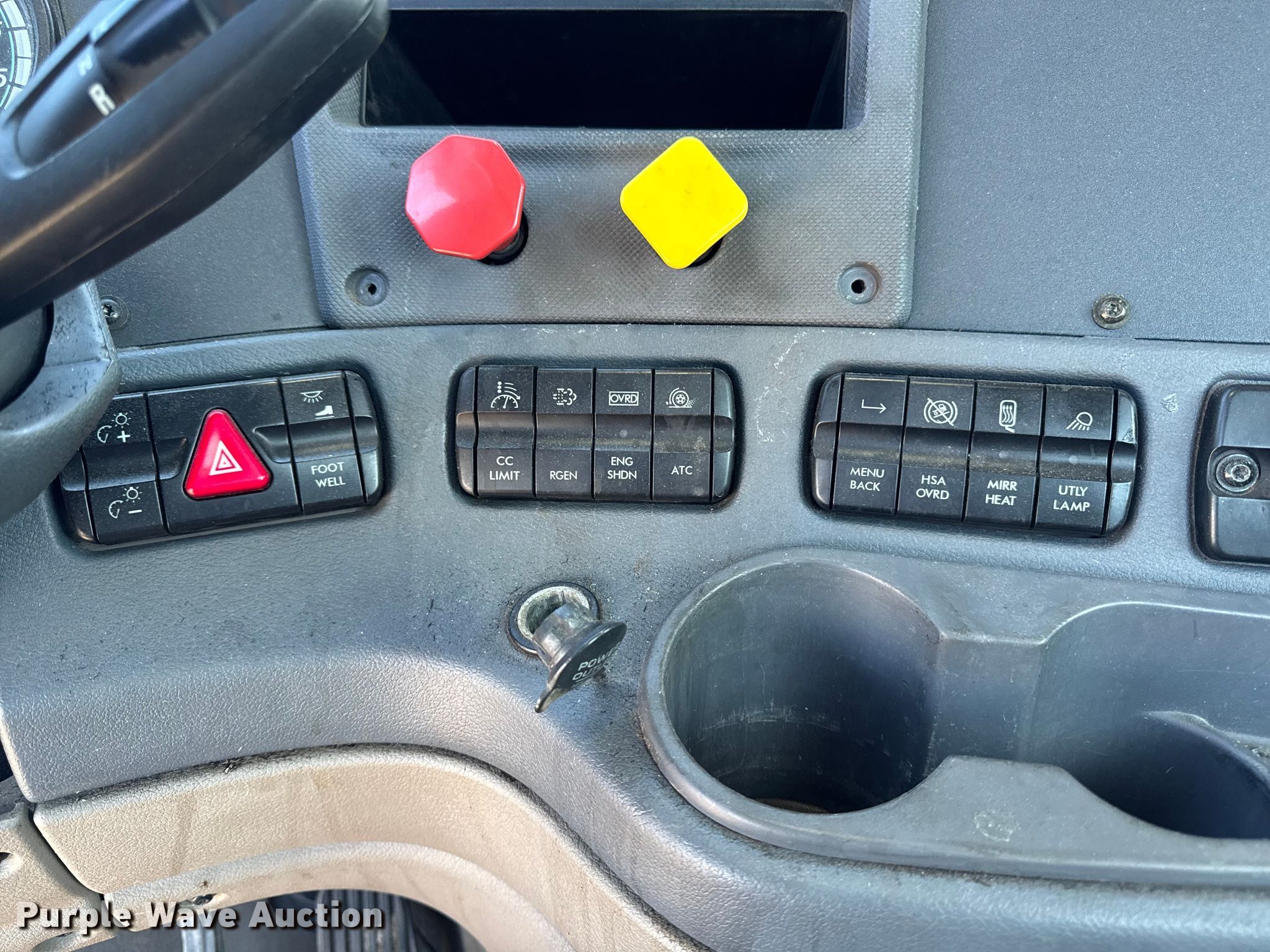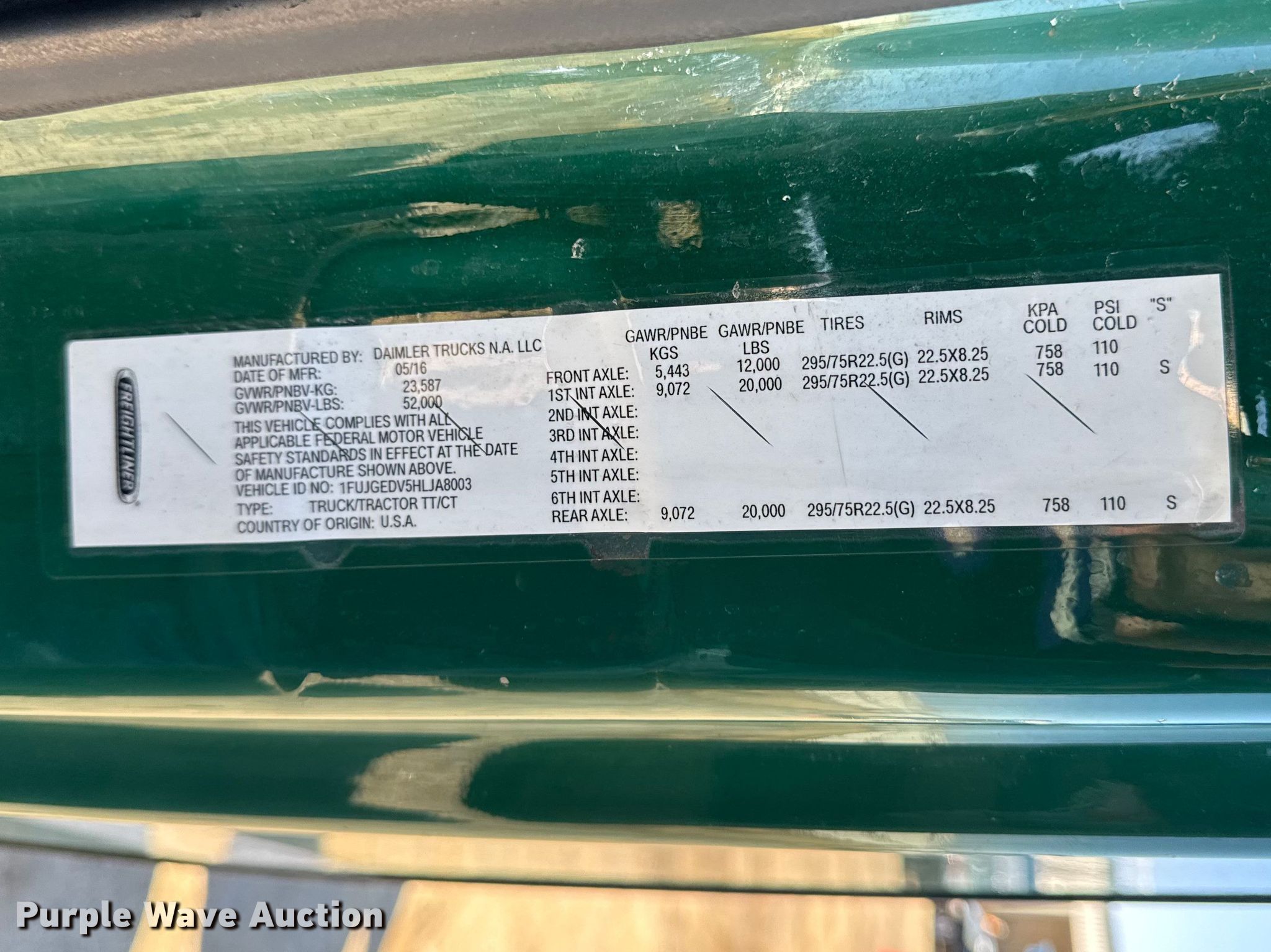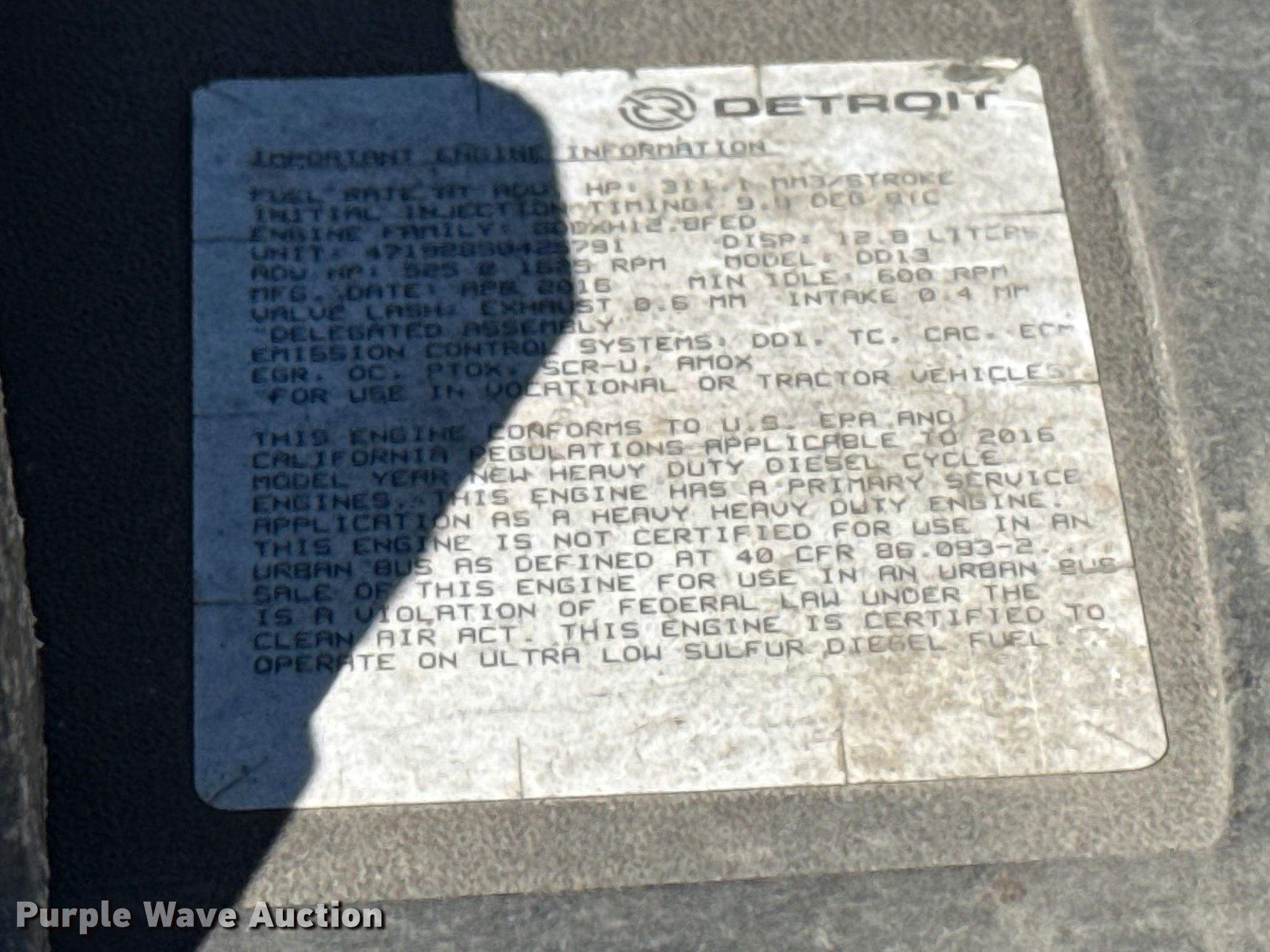 2017 Freightliner Cascadia 125 semi truck. Miles: 901,921 on odometer, Hours: 20,145 on meter, VIN: 1FUJGEDV5HLJA8003, Unit #: 1020, Lot #: 76484445. Engine Detroit Diesel DD13, Serial: 471928S0425791, Displacement: 12.8L, Cylinders: 6, Fuel type: Diesel, Engine brake. Transmission Model: DT12-DB-1550 HD, Automated manual. Chassis Axles: Tandem, Gear ratio: 2.41, Differential lock: Inter-axle, Suspension: Air Dump valves, Brakes: Air, GVWR: 52,000 lbs FAWR: 12,000 lbs, IAWR: 20,000 lbs, RAWR: 20,000 lbs, Wheelbase: 174". Interior AC, Heat, Heated mirrors, Power windows, Power locks, Cruise control, Air ride cab, Brake controller. Features Deck plate: Aluminum, Fifth wheel type: Fixed, Fuel tank: Dual. Tires Size: 295/75R22.5. Notes Dash warning indicator: Check engine, Jump start required during on-site data collection. Fleet realignment, stored at a secured facility. Please review REQUIRED REMOVAL INSTRUCTIONS. Indiana title. Title distribution may be delayed up to 30 days from verification of funds. Standard Forwarding, LLC Strategic Fleet Realignment Sale. McFarland, WI 53558