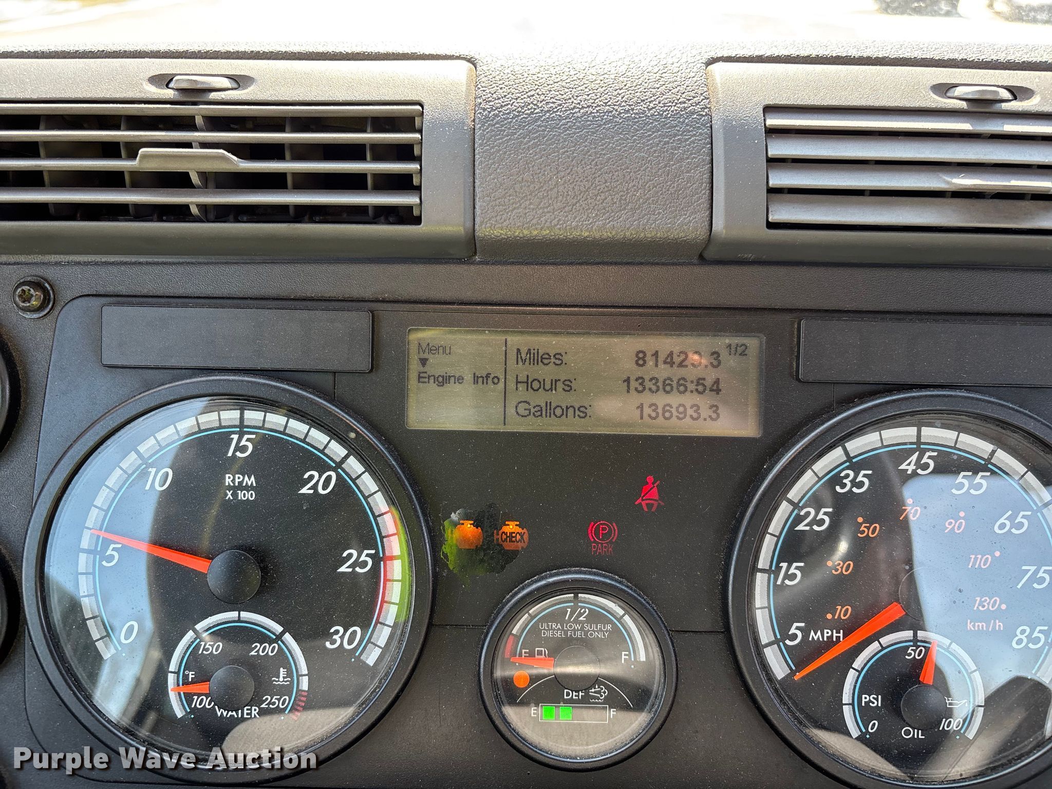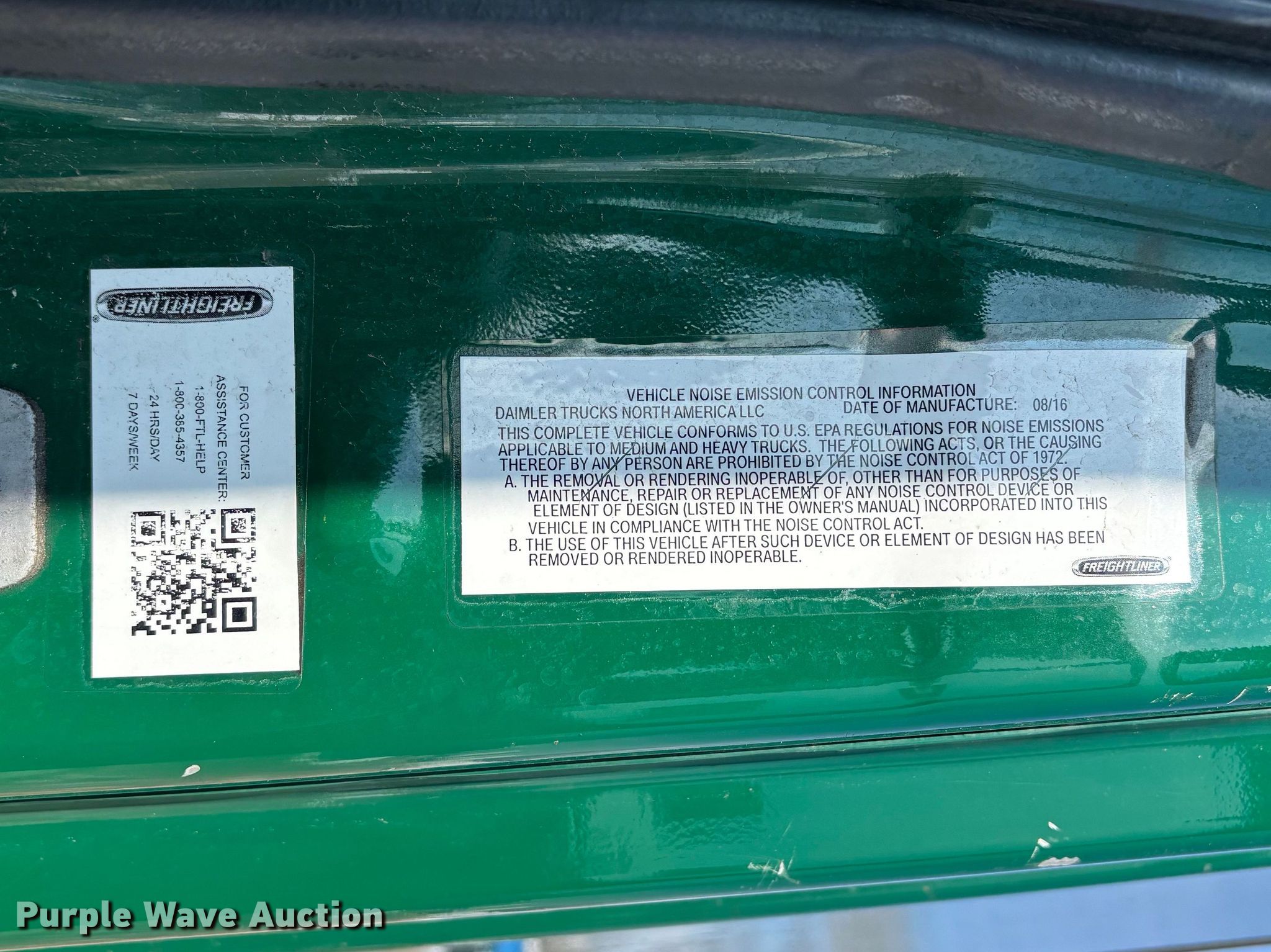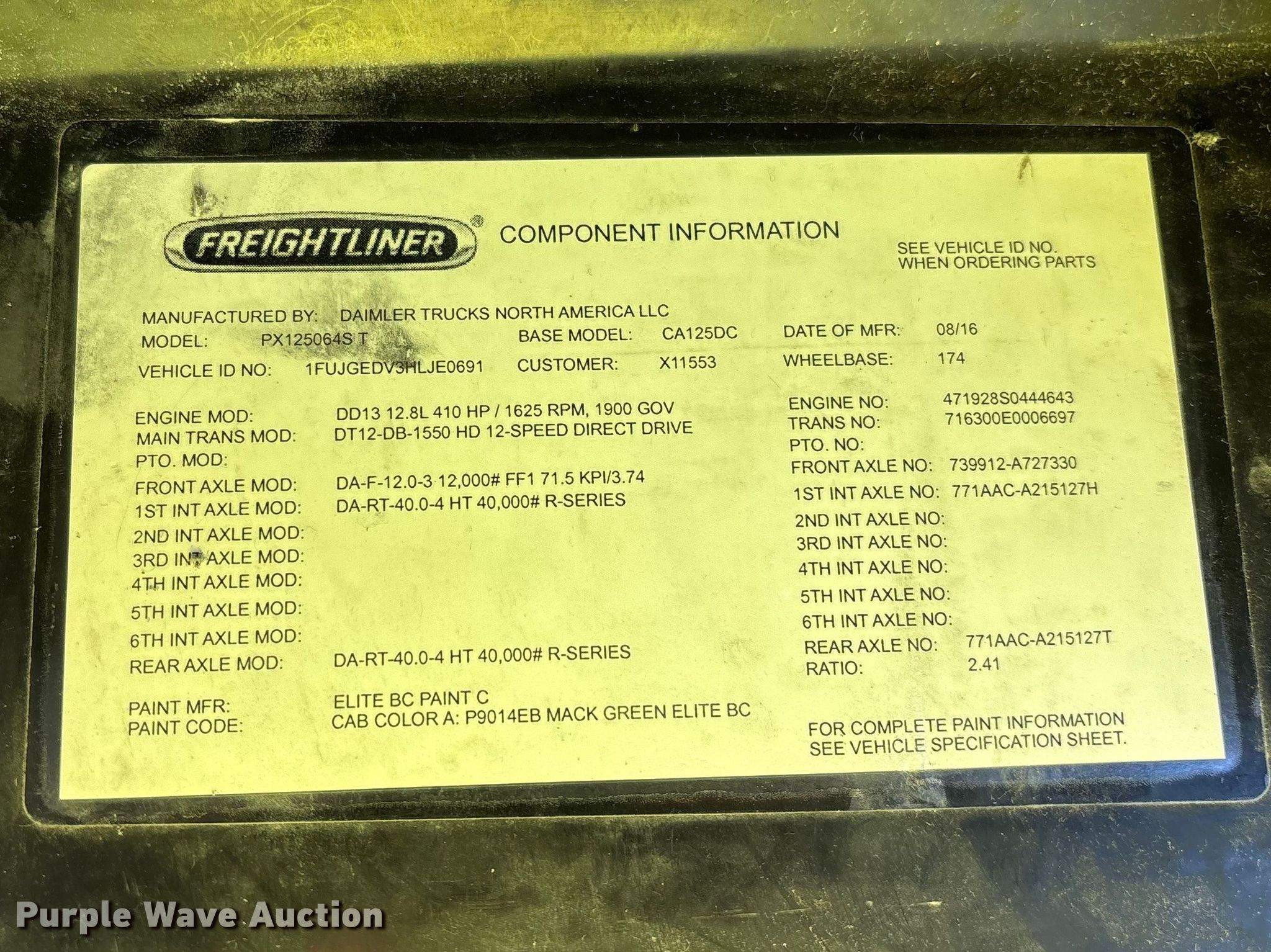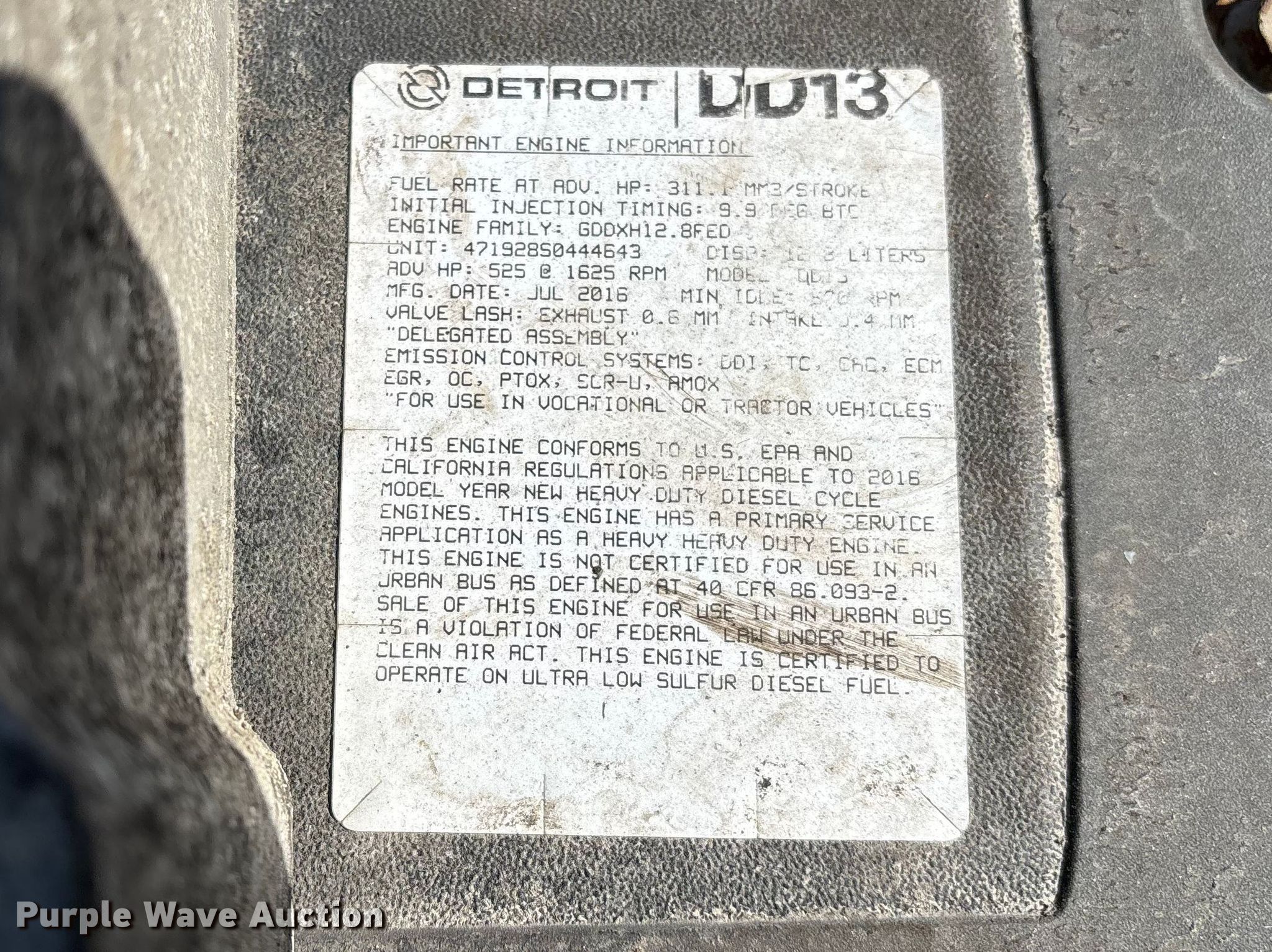 2017 Freightliner Cascadia 125 semi truck. Miles: 358,975 on odometer, Hours: 13,366 on meter, VIN: 1FUJGEDV3HLJE0691, Unit #: 1054, Lot #: 41953016. Engine Detroit Diesel DD13, Displacement: 12.8L, Cylinders: 6, Fuel type: Diesel, HP: 410, Engine brake. Transmission Detroit DT12-DB-1550, Automated manual, Speed: 12. Chassis Axles: Tandem, Gear ratio: 2.41, Differential lock: Inter-axle, Suspension: Air Dump valves, Brakes: Air, GVWR: 52,000 lbs FAWR: 12,000 lbs, IAWR: 20,000 lbs, RAWR: 20,000 lbs, Wheelbase: 174". Interior AC, Heat, Heated mirrors, Power windows, Cruise control, Air ride cab, Auxiliary controls, Brake controller. Features Deck plate: Steel, Fifth wheel type: Fixed, Fuel tank: Dual. Tires Size: 296/75R22.5. Notes Dash warning indicator: Check engine, Jump start required during on-site data collection. Fleet inventory reduction, stored at a secured facility. Please review REQUIRED REMOVAL INSTRUCTIONS. Indiana title. Title distribution may be delayed up to 30 days from verification of funds. Standard Forwarding, LLC Strategic Fleet Realignment Sale. Milwaukee, WI 53224