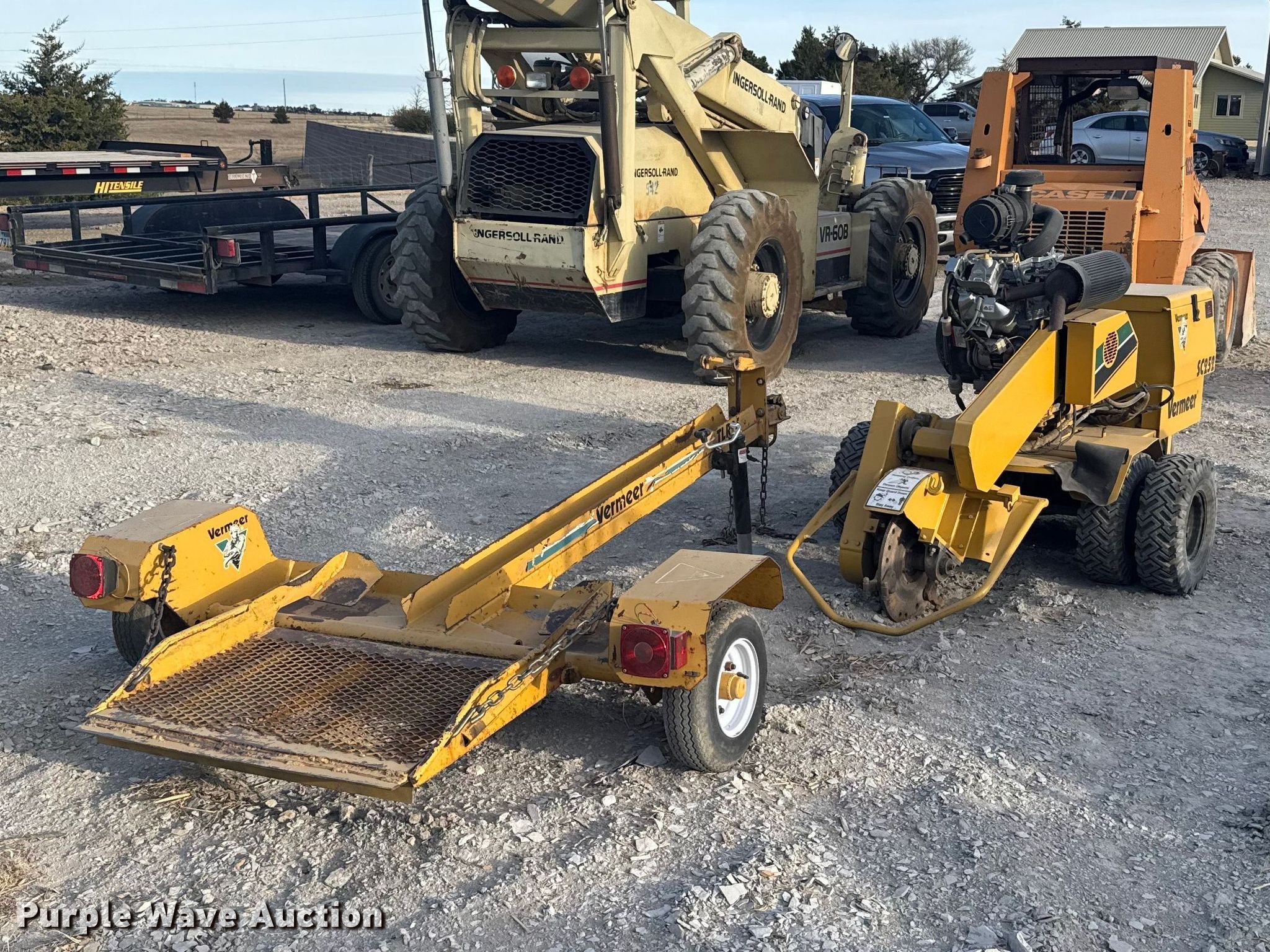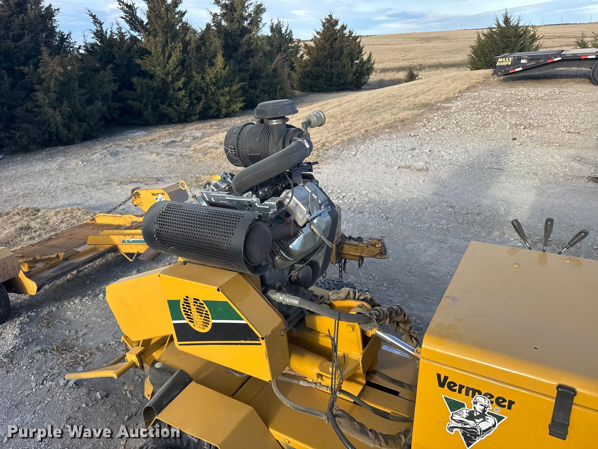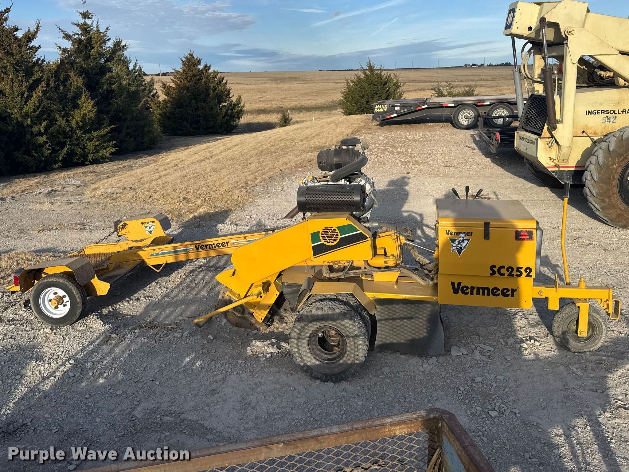 2003 Vermeer SC252 stump grinder. Hours: 1,814 on meter, VIN: 1VRN071F831007391. Engine Briggs & Stratton Vanguard, Cylinders: 2, Fuel type: Gas, HP: 31. Transmission Hydrostatic. Features Cutting head diameter: 18" Bolt-on teeth. Tires Size: 5.70-8. Trailer 2003 Vermeer TLR25, VIN: 1VRN091J731002781, Ball hitch size: 2", Axles: Single, Tire size: 4.80-8, GVWR: 1,450 lbs, GAWR: 1,250 lbs. This is worksite support equipment and will not come with a title. Transfer of ownership documentation will be a bill of sale. Wise Tree Service. Quinter, KS 67752