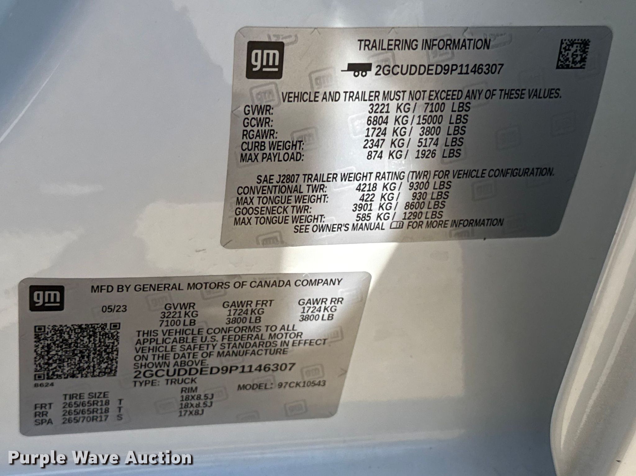 2023 Chevrolet Silverado 1500 Crew Cab pickup truck. Miles: 64,640 on odometer, VIN: 2GCUDDED9P1146307, Unit #: 146307. Engine Displacement: 5.3L, Cylinders: 8, Fuel type: Gas. Transmission Automatic, Four wheel drive. Interior AC, Heat, Seat: Heated, Power driver, Power windows, Power locks, Cruise control, Backup camera, Brake controller. Tires Size: 265/65R18. Notes Windshield chipped or cracked, Hail damage. Oklahoma title. Title distribution may be delayed up to 30 days from verification of funds. Gemini Motor Transport. 3601 NW 63rd St. Oklahoma City, OK 73116
