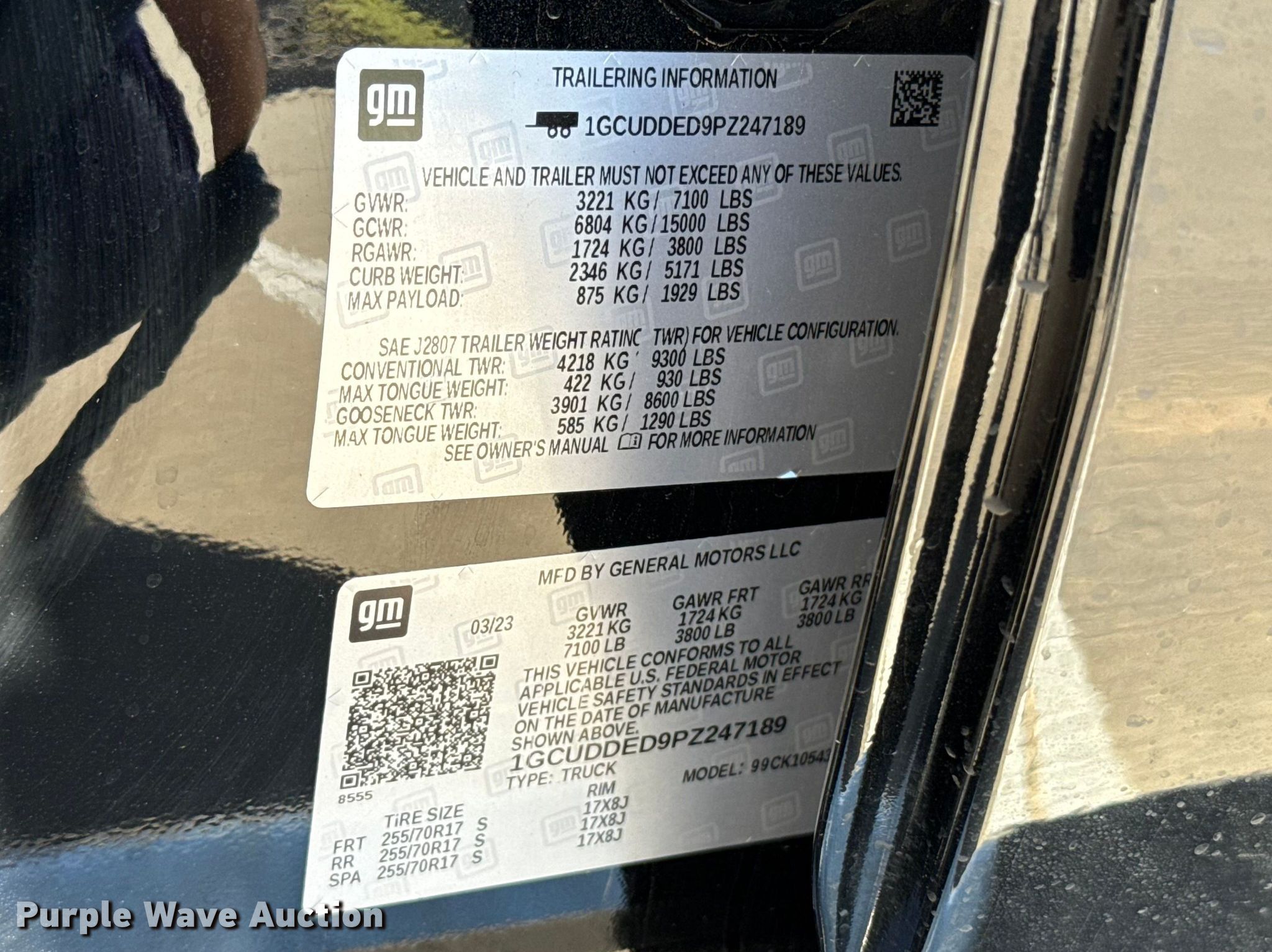 2023 Chevrolet Silverado 1500 Crew Cab pickup truck. Miles: 66,161 on odometer, VIN: 1GCUDDED9PZ247189, Unit #: 247189. Engine Displacement: 5.3L, Cylinders: 8, Fuel type: Gas. Transmission Automatic, Four wheel drive. Interior AC, Heat, Seat: Heated, Power driver, Power windows, Power locks, Cruise control, Backup camera, Brake controller. Tires Size: 285/70R17. Notes Hail damage. Oklahoma title. Title distribution may be delayed up to 30 days from verification of funds. Gemini Motor Transport. 3601 NW 63rd St. Oklahoma City, OK 73116