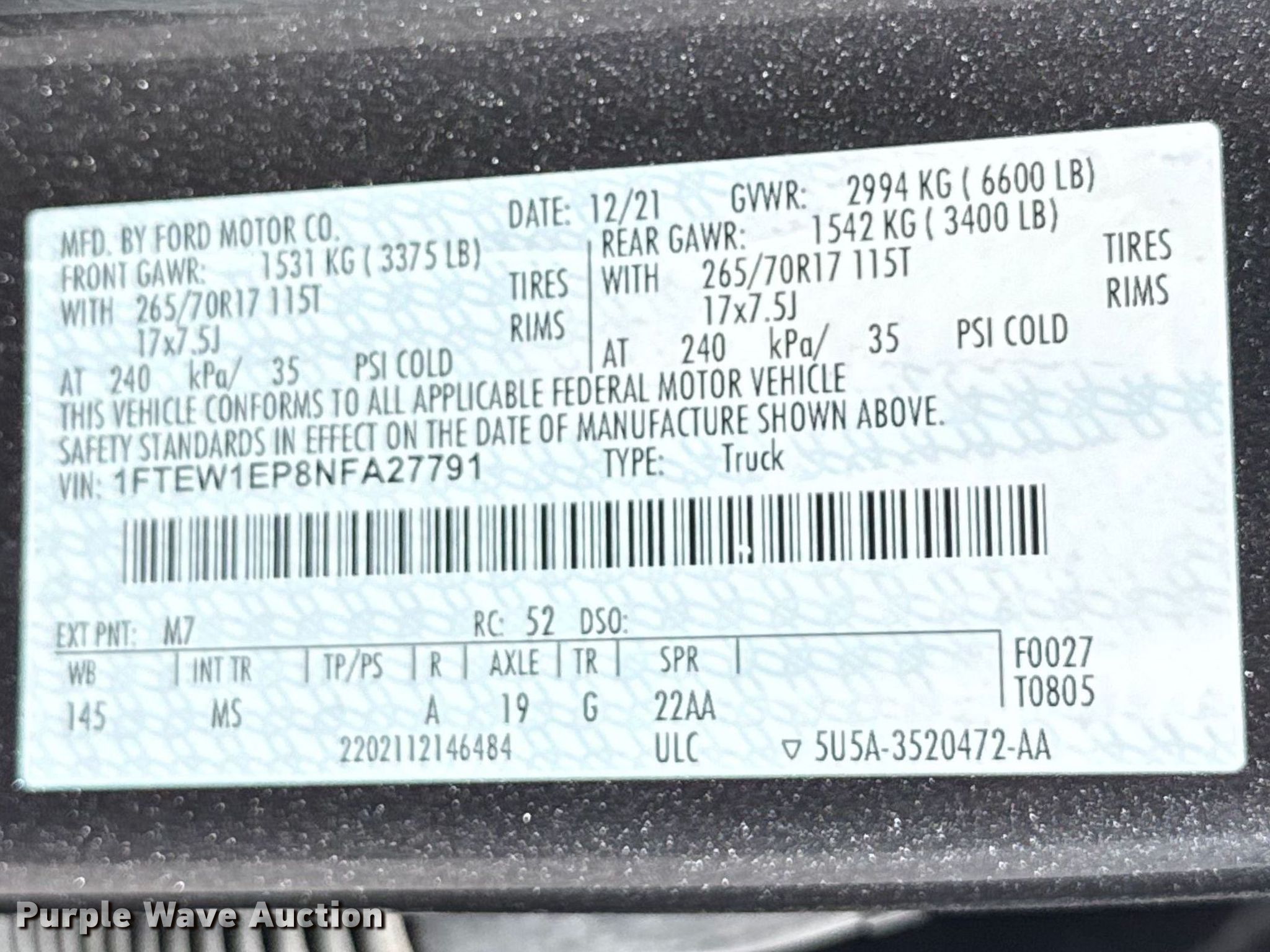 Purple Wave is selling a used 1/2 Ton Pickup or Van in Oklahoma. This item is a 2022 Ford F150 Crew Cab pickup truck with the following: Miles: 131,821 on odometer, VIN: 1FTEW1EP8NFA27791, Unit #: A27791
