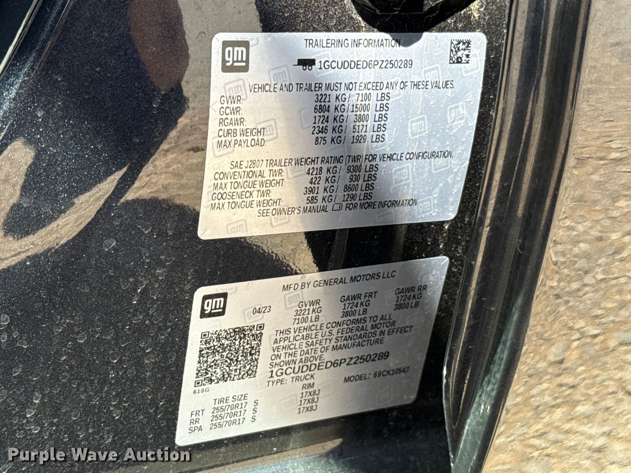 2023 Chevrolet Silverado 1500 Crew Cab pickup truck. Miles: 120,377 on odometer, VIN: 1GCUDDED6PZ250289, Unit #: 250289. Engine Displacement: 5.3L, Cylinders: 8, Fuel type: Gas. Transmission Automatic, Four wheel drive. Interior AC, Heat, Seat: Heated, Power driver, Power windows, Power locks, Cruise control, Backup camera, Brake controller. Tires Size: P265/70R17. Notes Dash warning indicator: Check engine, Traction control, Service traction control, Windshield chipped or cracked, Engine issues. Oklahoma title. Title distribution may be delayed up to 30 days from verification of funds. Gemini Motor Transport. 10220 W Reno Ave. Oklahoma City, OK 73127