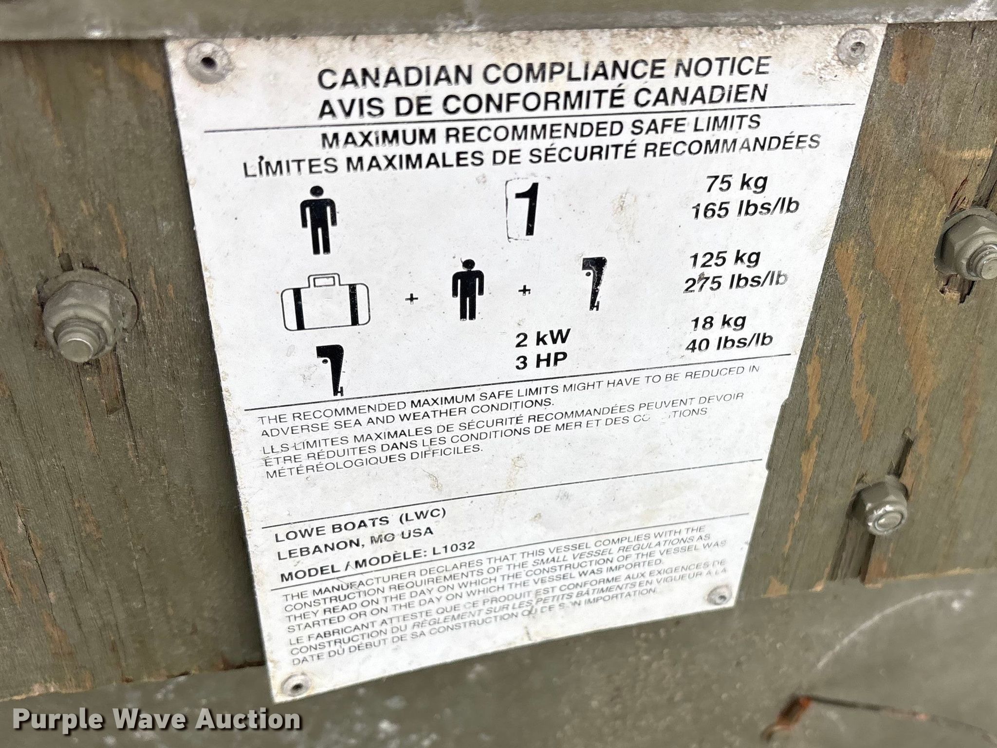 2021 Lowe 1032 boat. Length: 119", Hull ID: US-LWC04115A121. Engine Engine type: Outboard, Mercury, Displacement:.086L, Fuel type: Gas. Operators station Capacity Person: 2, 180 lbs. Notes Dolly Tire size: 4.00-8. Transfer of ownership documentation will be a bill of sale. Town Scapes LLC. Virginia Beach, VA 23454