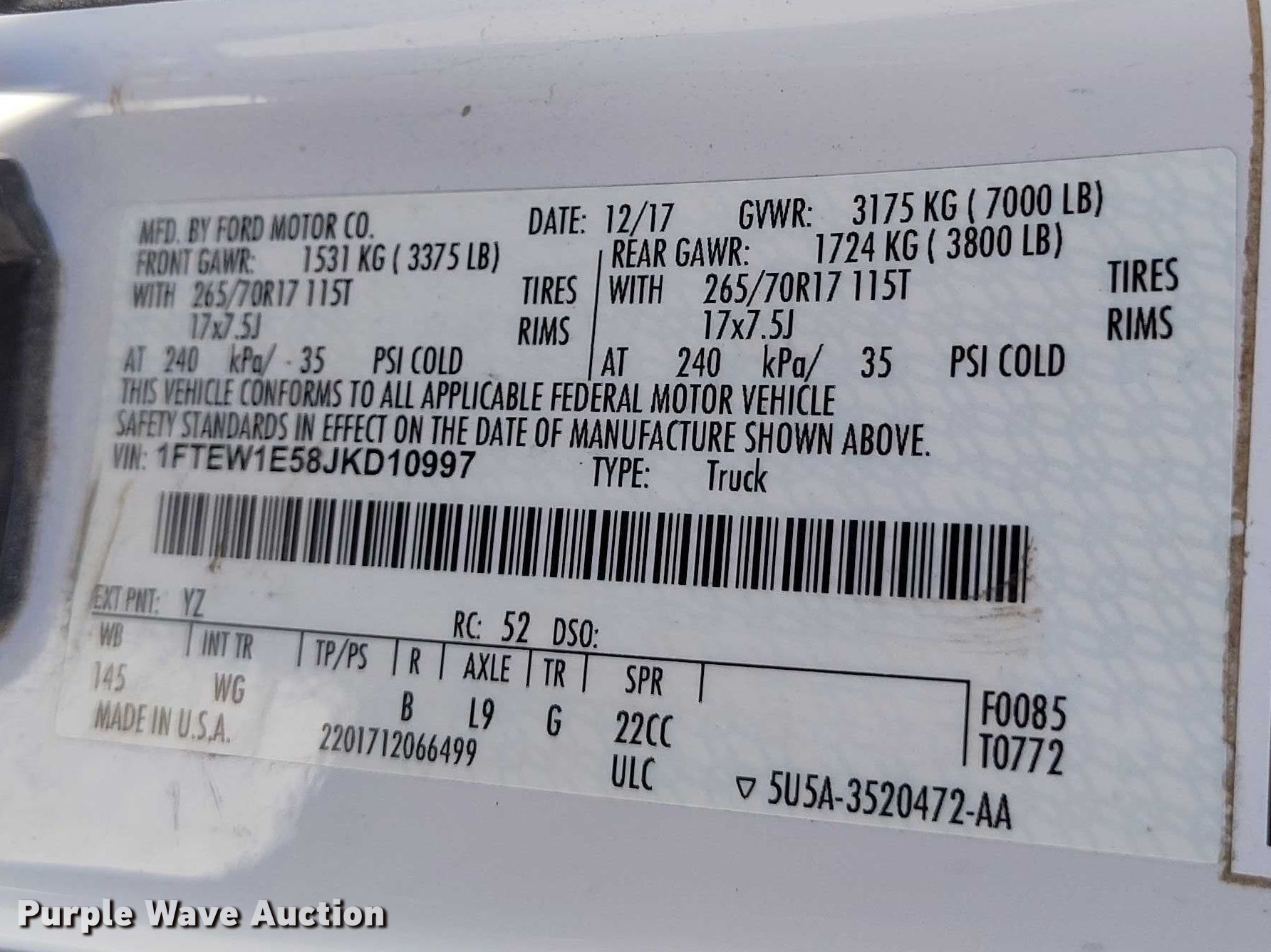 Purple Wave is selling a used 1/2 Ton Pickup or Van in Colorado. This item is a 2018 Ford F-150 Crew Cab pickup truck with the following: Miles: 135,193 on odometer, Hours: 7,307 on meter, VIN: 1FTEW1E58JKD10997, Unit #: 02.659