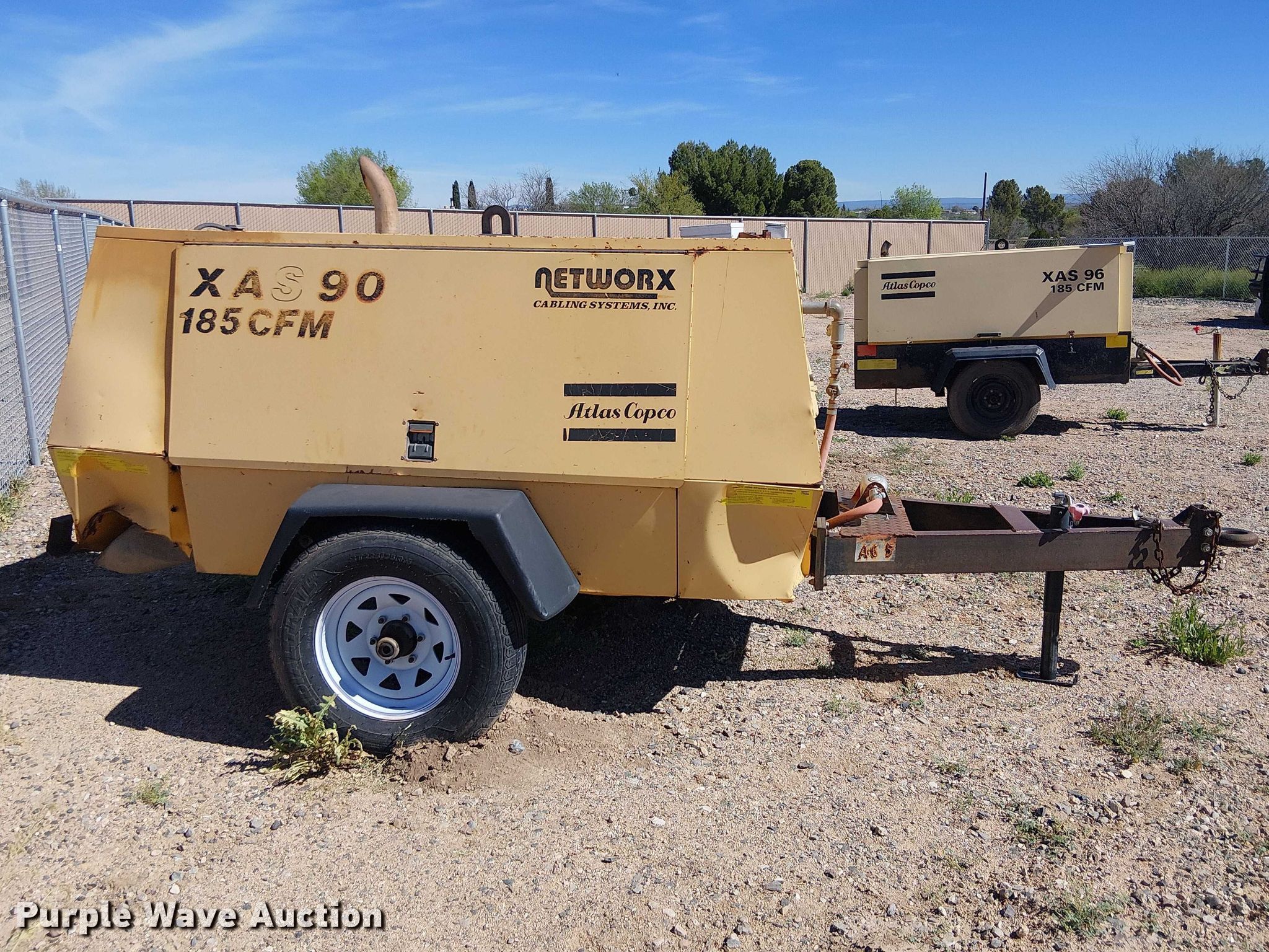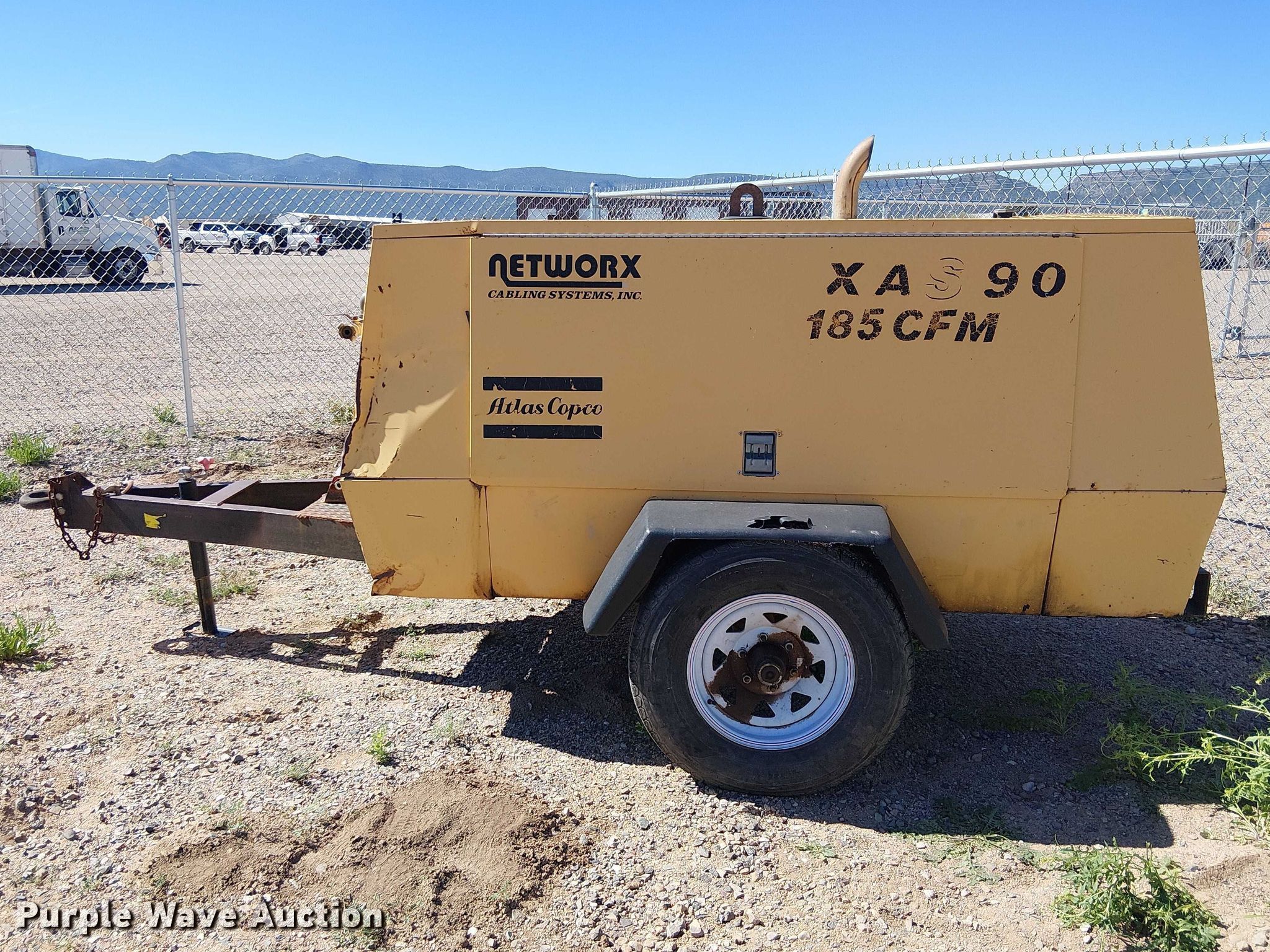 1997 Atlas Copco XAS90 air compressor. Hours: 1,587 on meter, Serial: HOL604544. Engine John Deere 4039DF001, Serial: CD4039D332222, Displacement: 3.9L, Cylinders: 4, Fuel type: Diesel. Features Air compressor CFM: 185, PSI: 116. Trailer Atlas Copco, 12' L x 74" W, Hitch: Pintle, Suspension: Spring, Axles: Single, Tire size: ST225/75R15. Notes Jump start required during on-site data collection. This is worksite support equipment and will not come with a title. Transfer of ownership documentation will be a bill of sale. Network Cabling Systems. Camp Verde, AZ 86322