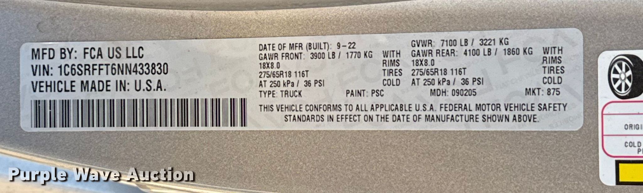 Purple Wave is selling a used 1/2 Ton Pickup or Van in Oklahoma. This item is a 2022 RAM 1500 Crew Cab pickup truck with the following: Miles: 176,022 on odometer, VIN: 1C6SRFFT6NN433830, Unit #: 433830